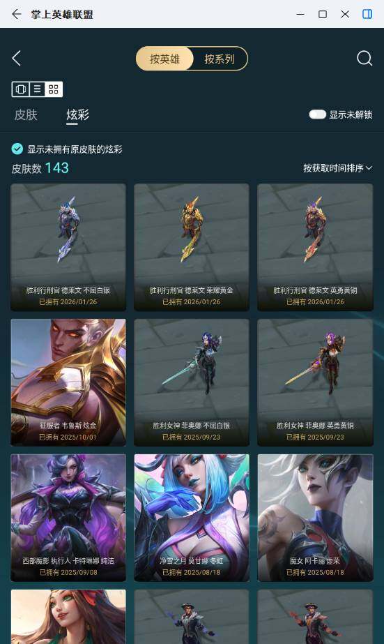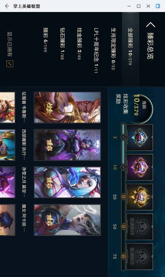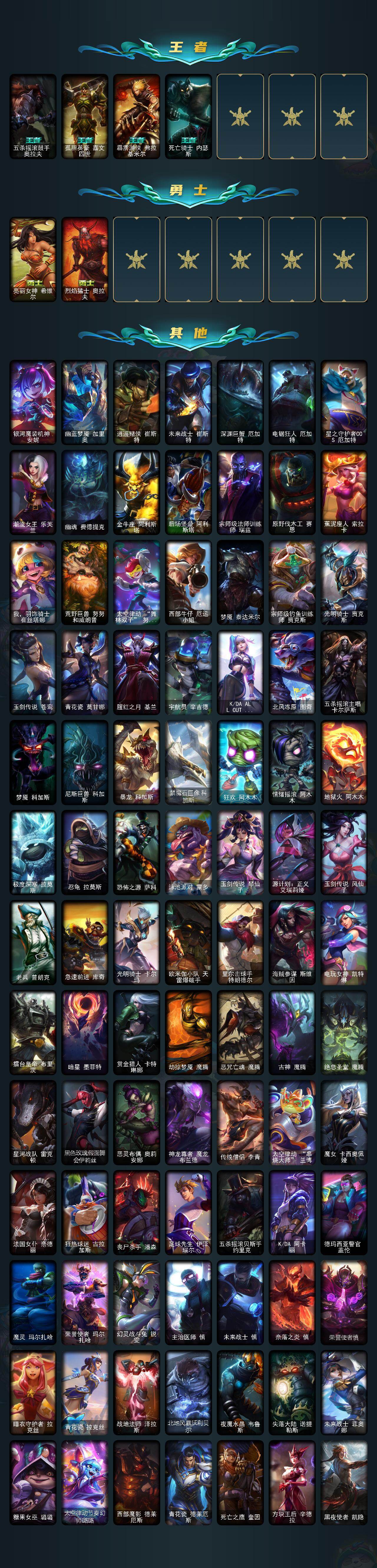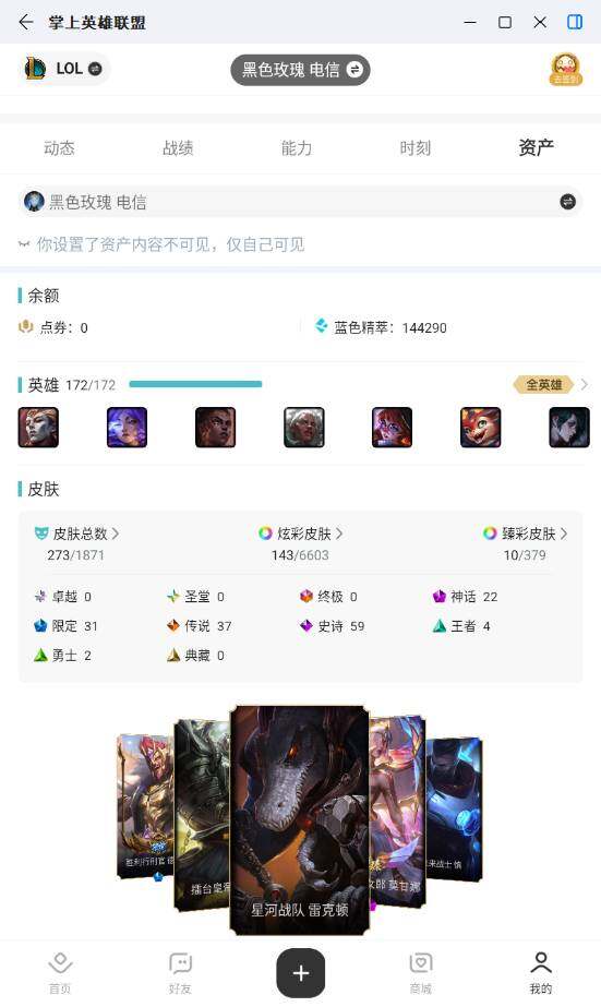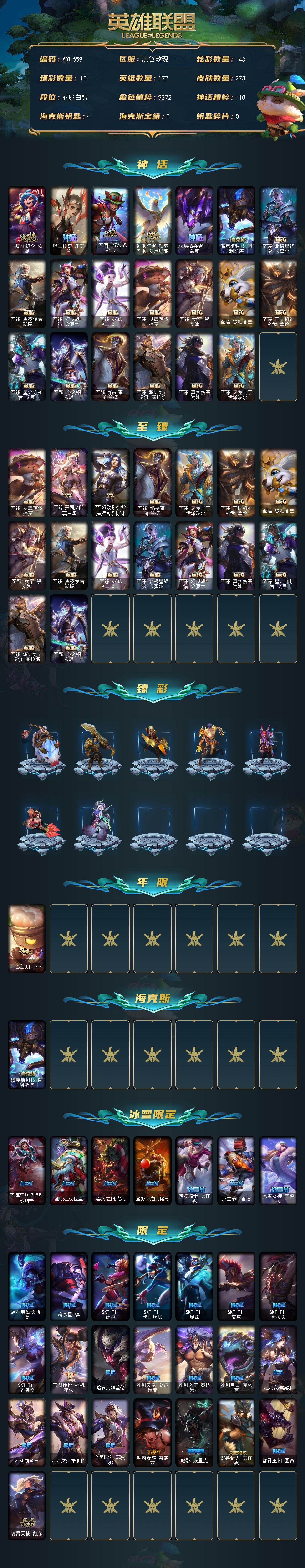 白银段位-172英雄-273皮肤-143炫彩-0终极-22神话-31限定-37传说-59史诗