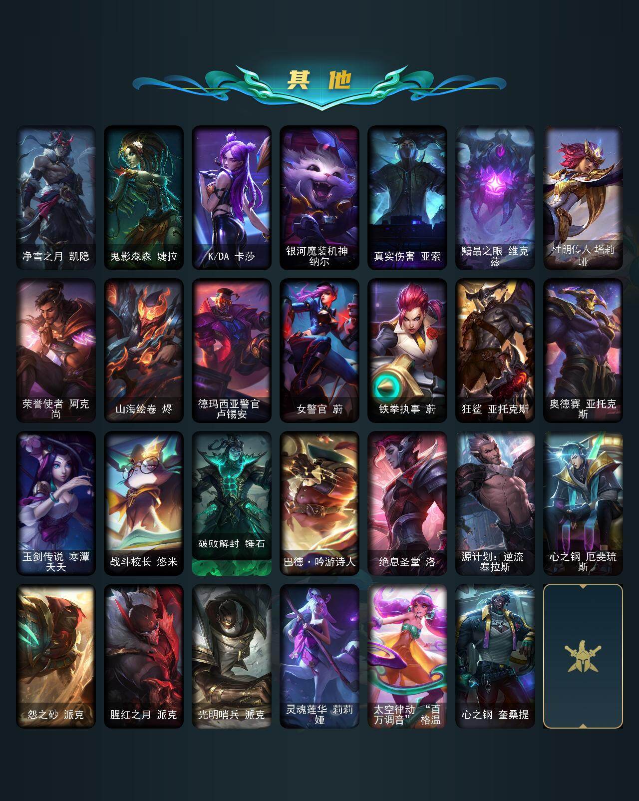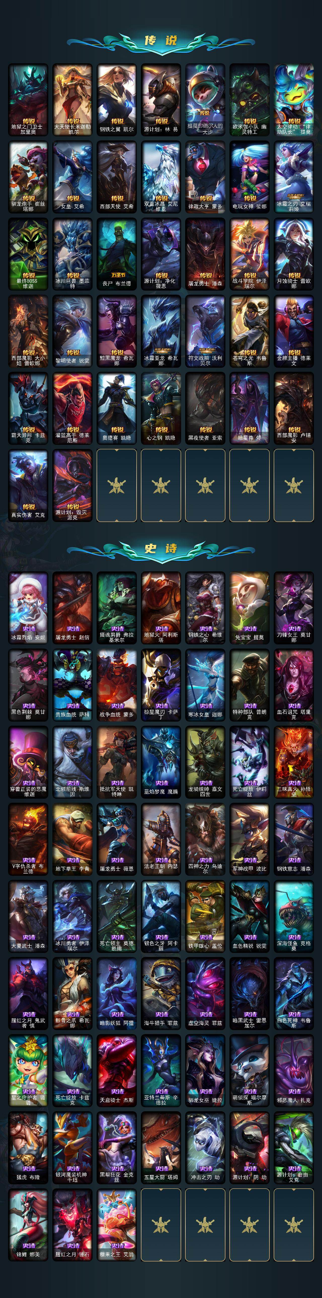 【神话皮肤】:十周年纪念安妮,殿堂传奇乐芙兰,十五周年纪念希维尔,神凰行者瑞羽圣凰艾尼维亚,水晶掠夺者卡兹克,海克斯科技阿利斯塔,至臻真实伤害赛娜,至臻天龙之子伊泽瑞尔,至臻北极星钢影卡蜜尔,至臻黑夜使者凯隐,至臻幻灵战斗猫金克丝,至臻KDAALLOUT卡莎,至臻灵魂莲华提莫,至