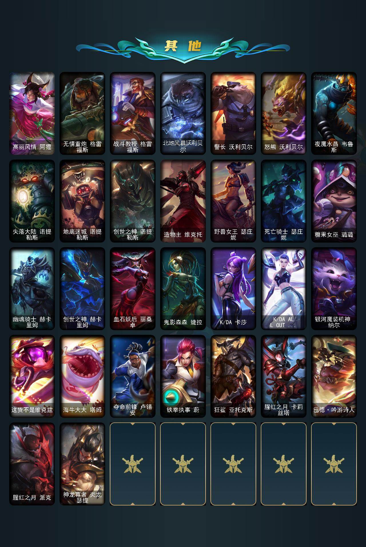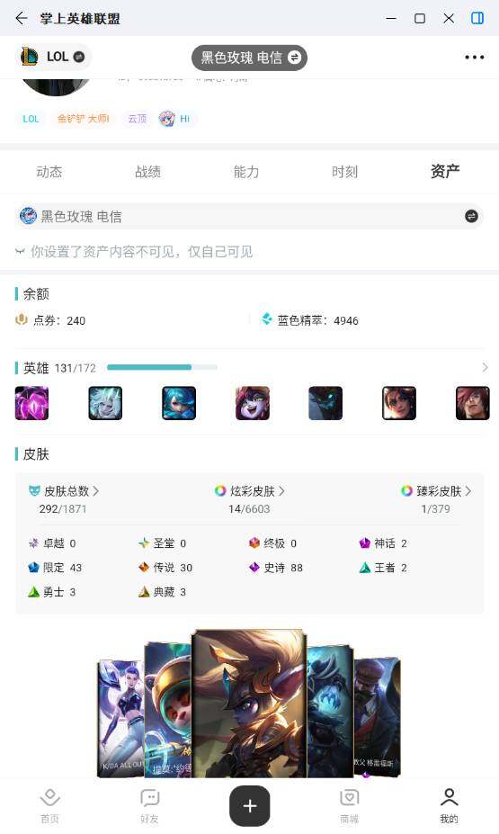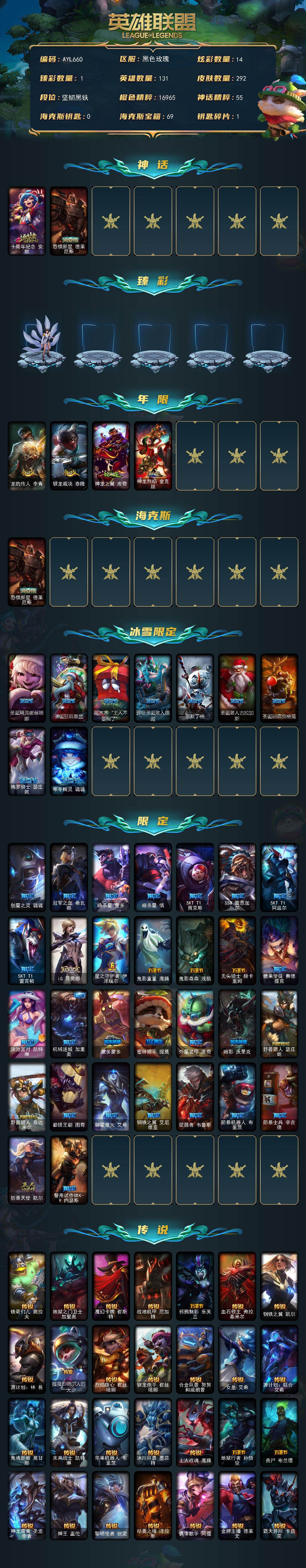 未定级段位-131英雄-292皮肤-14炫彩-0终极-2神话-43限定-30传说-88史诗