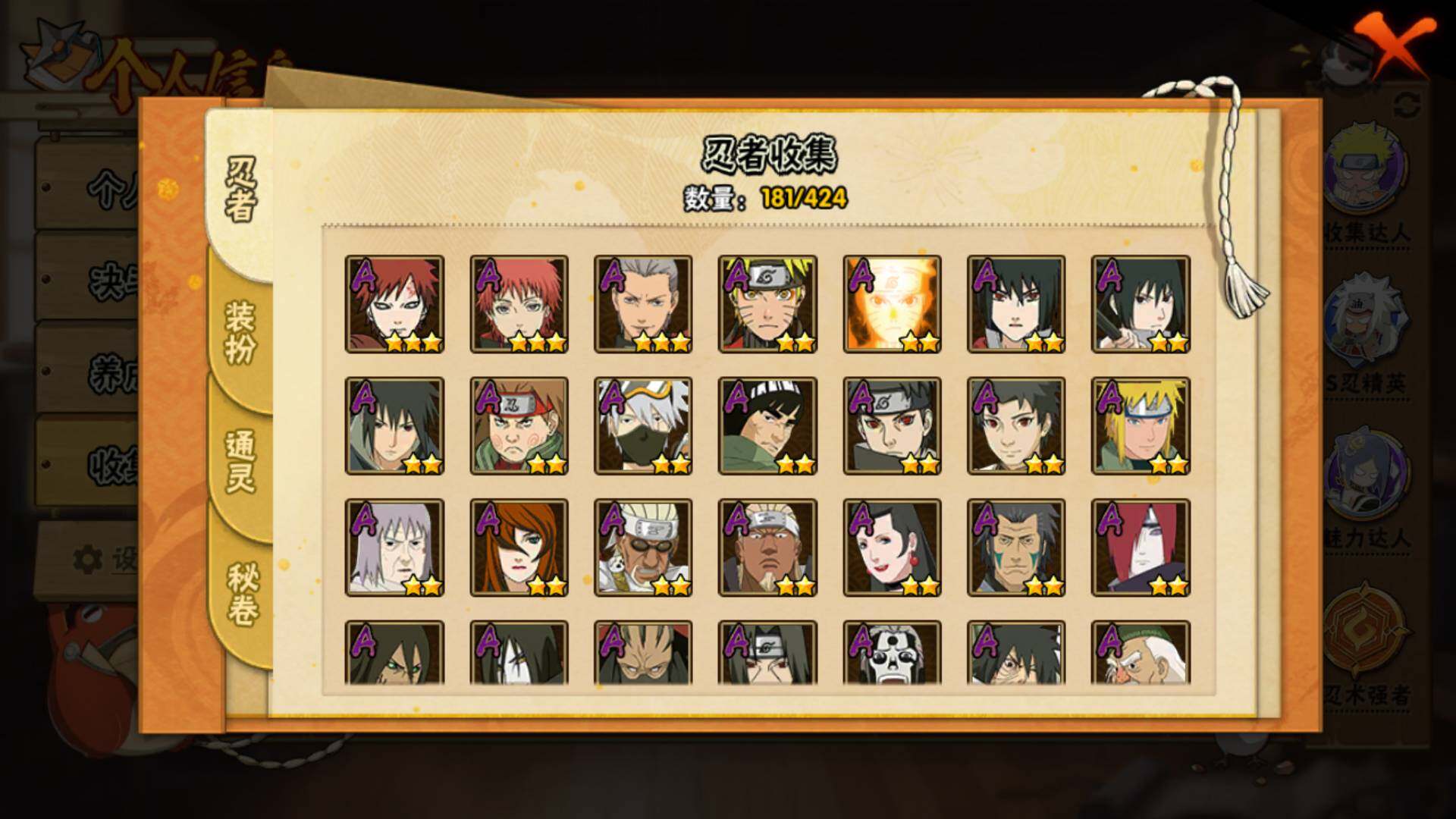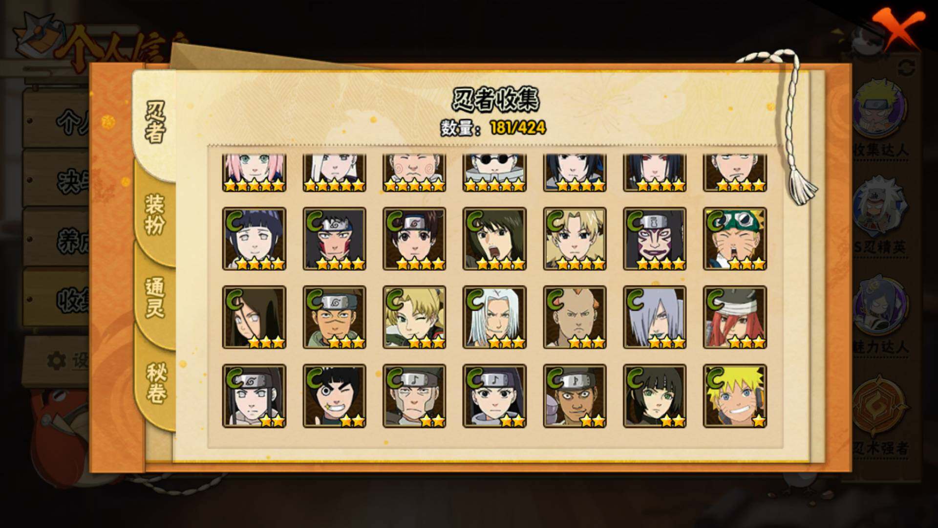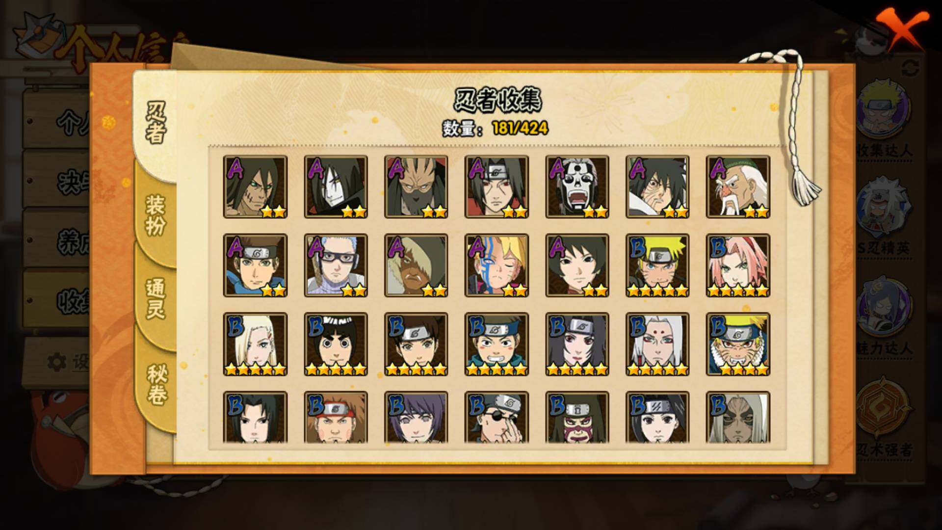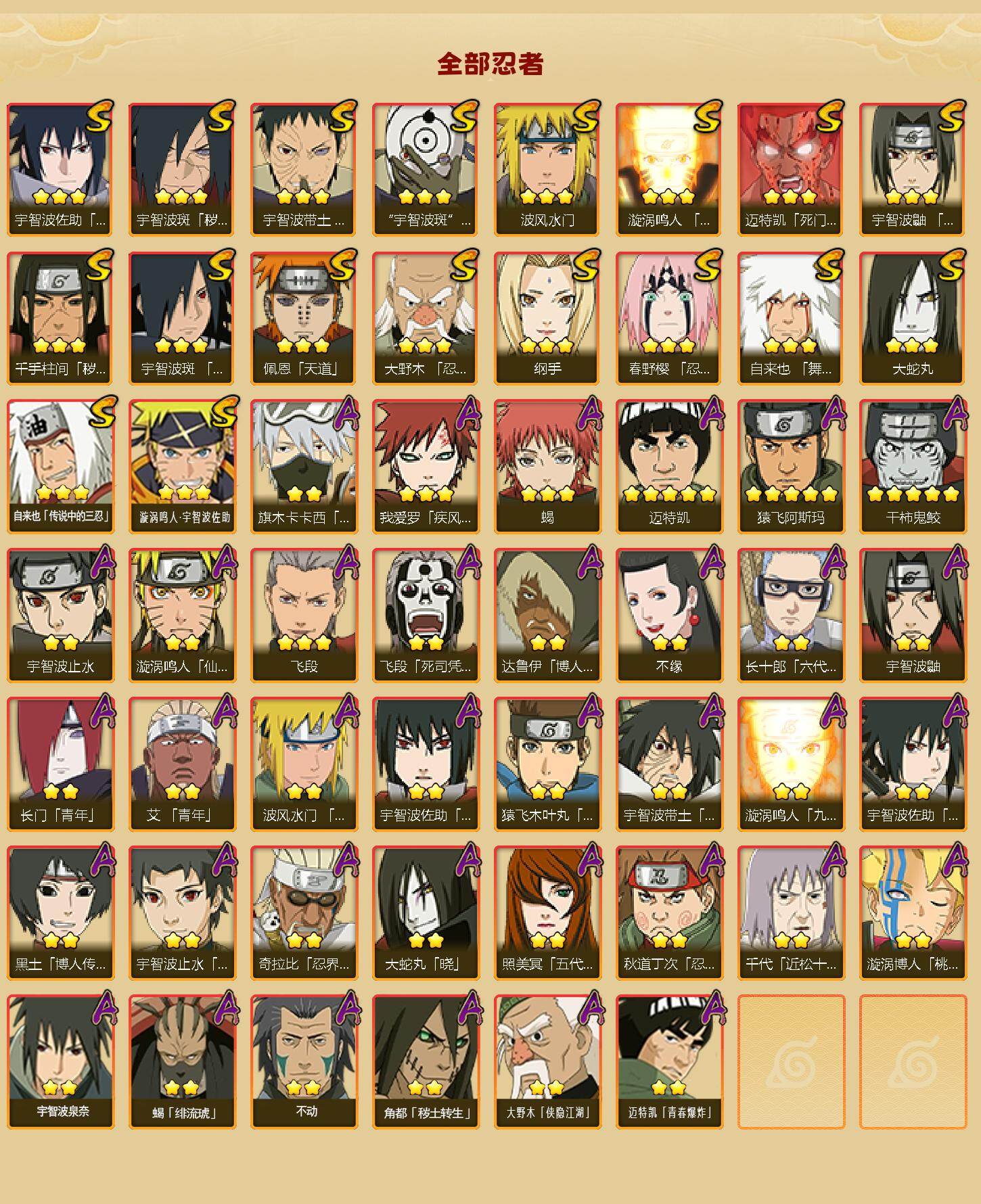 【S级忍者】:千手柱间「秽土转生」(3星),宇智波斑「秽土转生·解」(3星),大野木「忍界大战」(3星),春野樱「忍界大战」(3星),宇智波带土「忍界大战」(3星),宇智波鼬「须佐能乎」(3星),宇智波斑「木叶创立」(3星),自来也「舞之豪杰」(3星),大蛇丸(3星),自来也「传说中的三忍」(3星),纲手(3星),波风水门(3星),漩涡鸣人「九喇嘛连