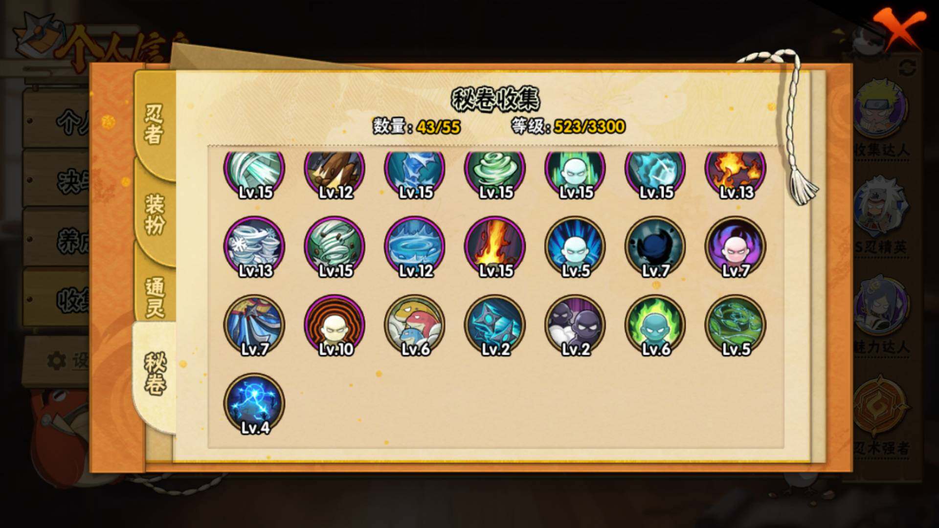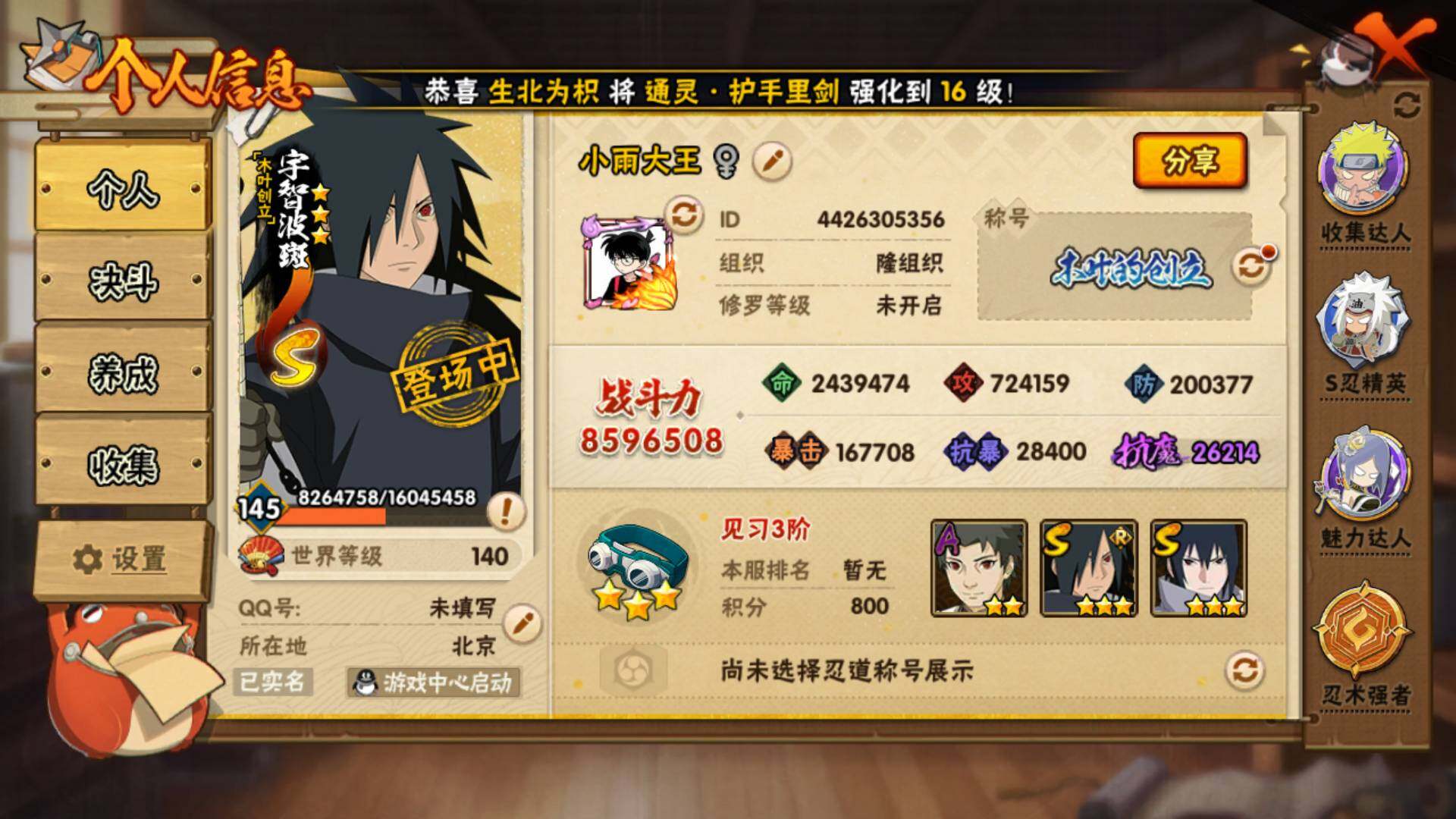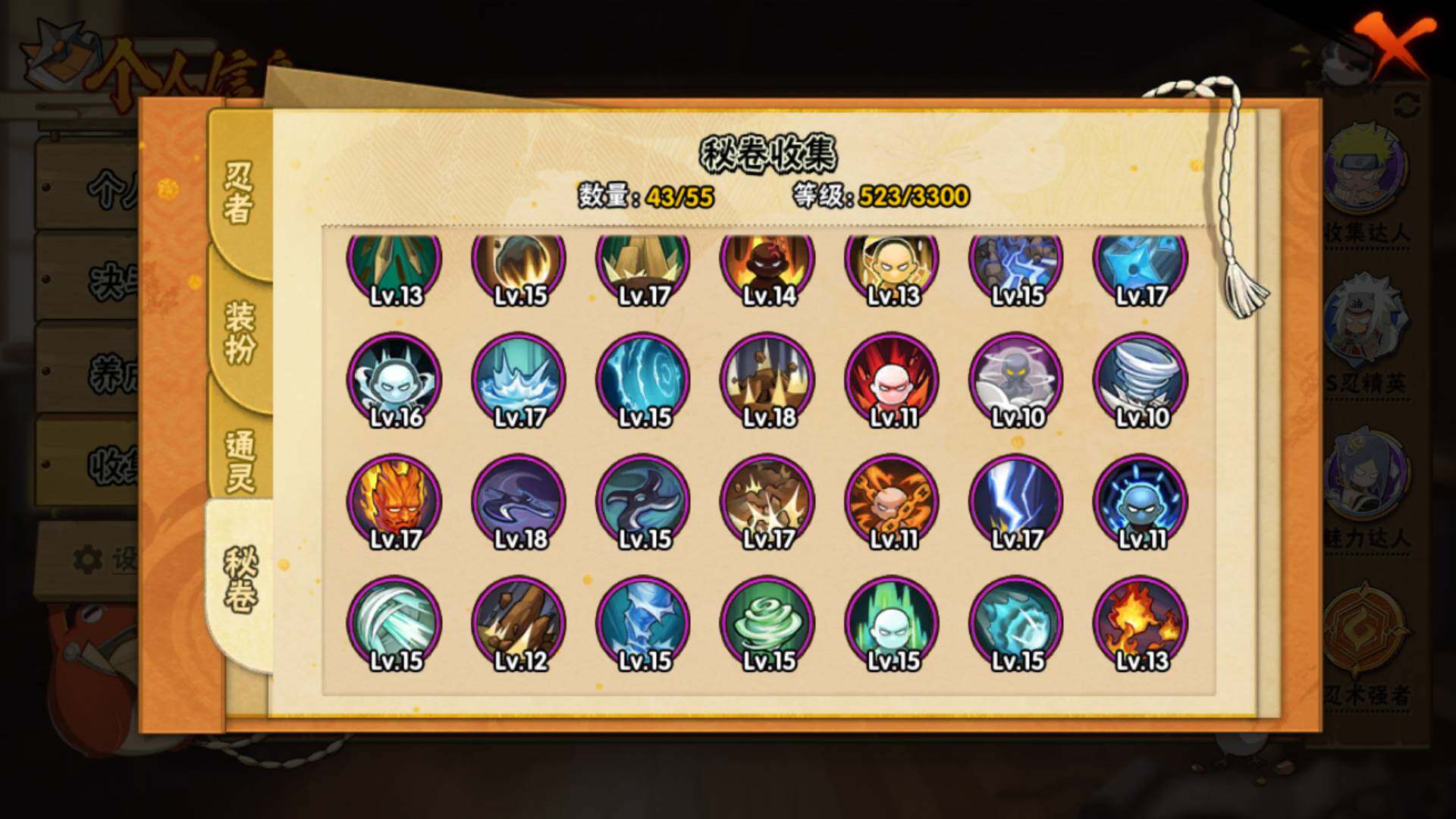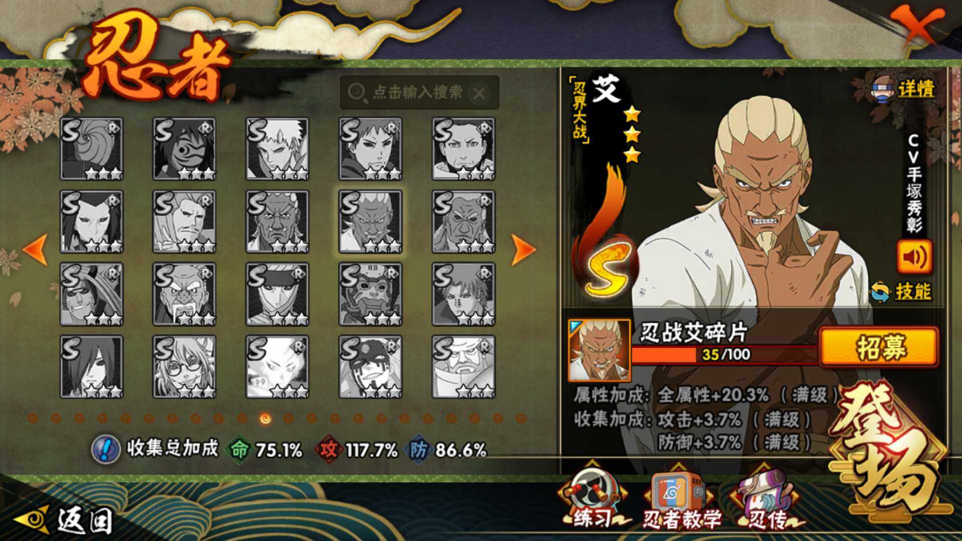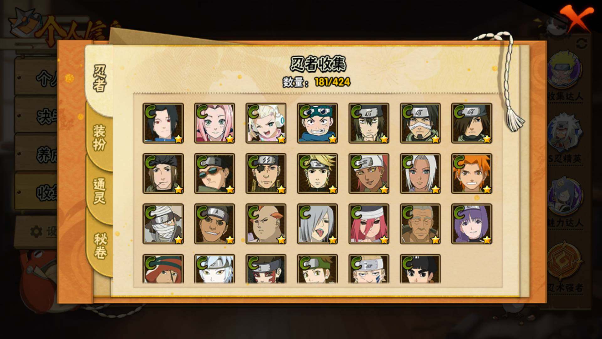 【S级忍者】:千手柱间「秽土转生」(3星),宇智波斑「秽土转生·解」(3星),大野木「忍界大战」(3星),春野樱「忍界大战」(3星),宇智波带土「忍界大战」(3星),宇智波鼬「须佐能乎」(3星),宇智波斑「木叶创立」(3星),自来也「舞之豪杰」(3星),大蛇丸(3星),自来也「传说中的三忍」(3星),纲手(3星),波风水门(3星),漩涡鸣人「九喇嘛连