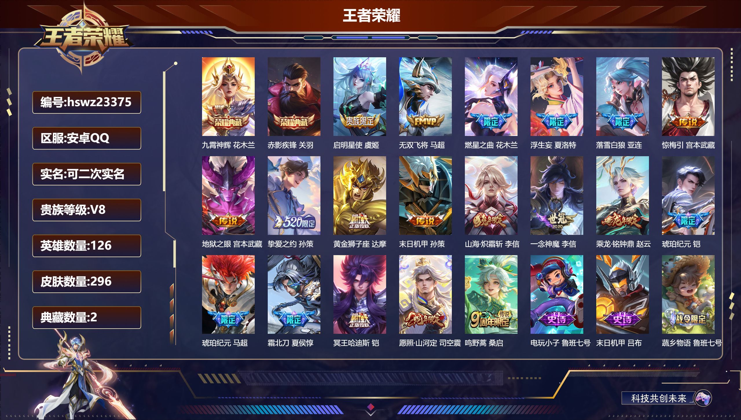 安卓QQ/至尊星耀/296皮肤/126英雄/2典藏/0珍品无双/0无双/0珍品传说/19传说/78史