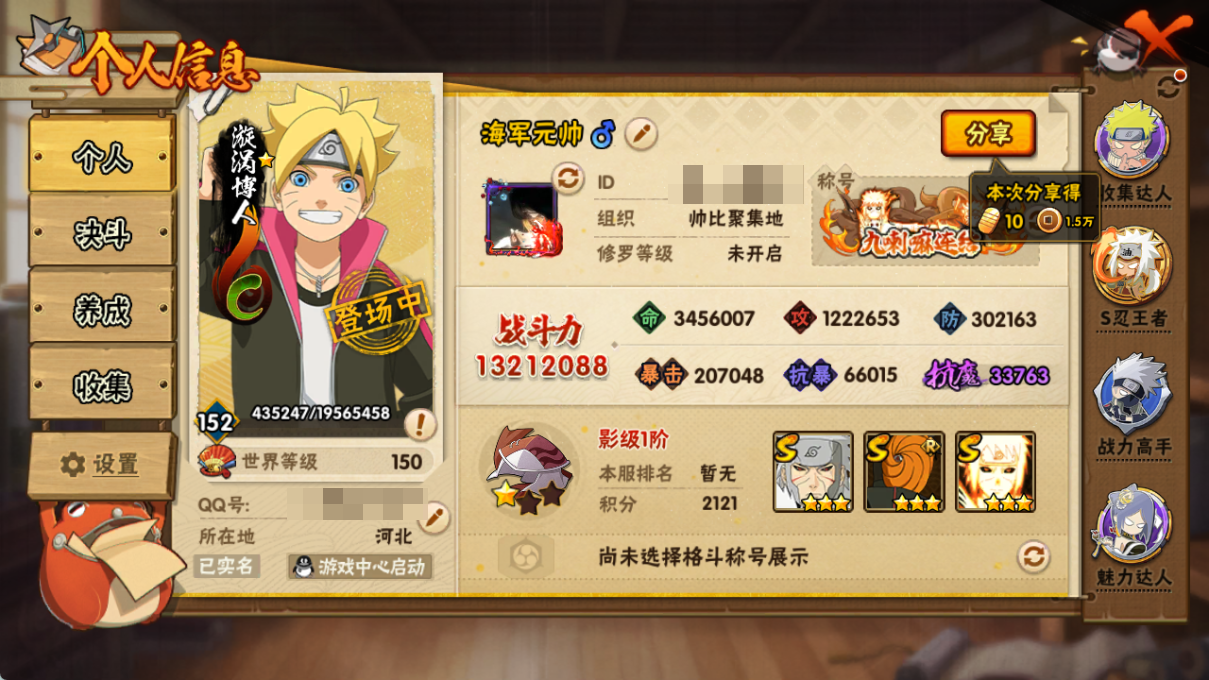 (可转苹果)1321w战力白破创斑五影斑31S+298暴怒带土+咒印佐助+8个198直购A/59A+熊猫+二尾