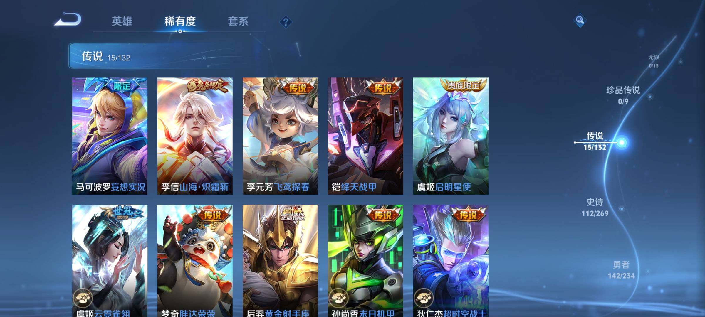 【传说皮肤】:后羿神树通天,虞姬愿照岁时盈,云缨幻光神枪,桑启鸣野蒿,孙尚香乘龙