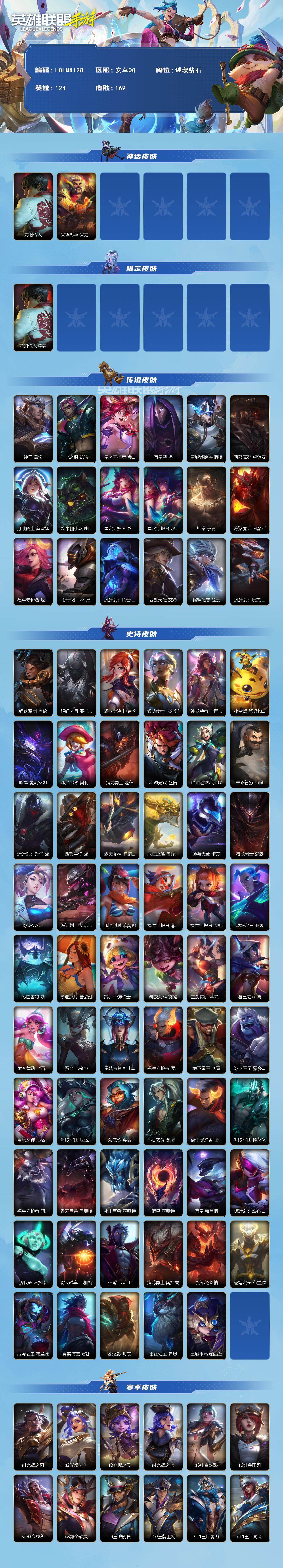 【LOLMX128】124英雄/169皮肤/璀璨钻石/龙的传人 李青/火焰澎湃 火力全开 格雷福斯/神王 盖伦/心之钢 凯隐/星之守护者 金克丝/暗星尊 烬/星域游侠 崔斯特/西部魔影 卢锡安/月蚀骑士 蕾欧娜/欧米伽小队 幽灵特工 提莫/星之守护者 落 霞/星之守护者 陨 洛/神拳 李青/炼狱魔犬 内瑟斯/福牛守护者 厄运小姐/源计划:林 易/源计划:联合 艾希/西部天使 艾希/黎明使者 锐雯/源计划:泯灭 雷克顿/钢铁军团 盖伦/腥红之月 亚托克斯/战斗学院 拉克丝/黎明使者 卡尔玛/神龙尊
