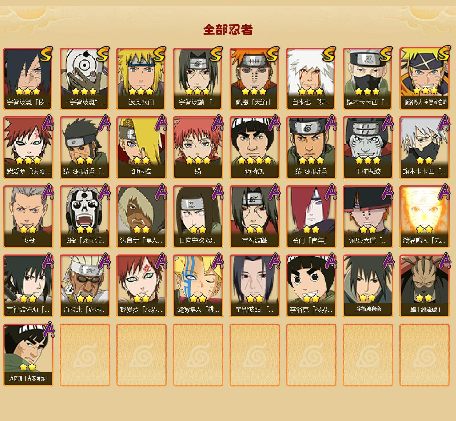 【HYYT212】V6/S忍8/A忍25/忍界大战-日向宁次/五代目雷影-达鲁伊/死司凭血-飞段/宇智波鼬/须佐能乎-旗木卡卡西/青年-长门/天道-佩恩/3星漩涡鸣人·宇智波佐助/波风水门/3星蝎/秽土转生-猿飞阿斯玛/桃式显现-漩涡博人/忍界大战-奇拉比/万花筒写轮眼-旗木卡卡西/3星干柿鬼鲛/3星我爱罗「疾风传」/忍界大战-李洛克/2星蝎「绯流琥」/舞之豪杰-自来也/白面具-宇智波斑/4星迈特凯/漂泊浪客-佩恩·六道/飞段/夏日限定-宇智波鼬/2星宇智波泉奈/忍界大战-我爱罗/迪达拉/秽土转