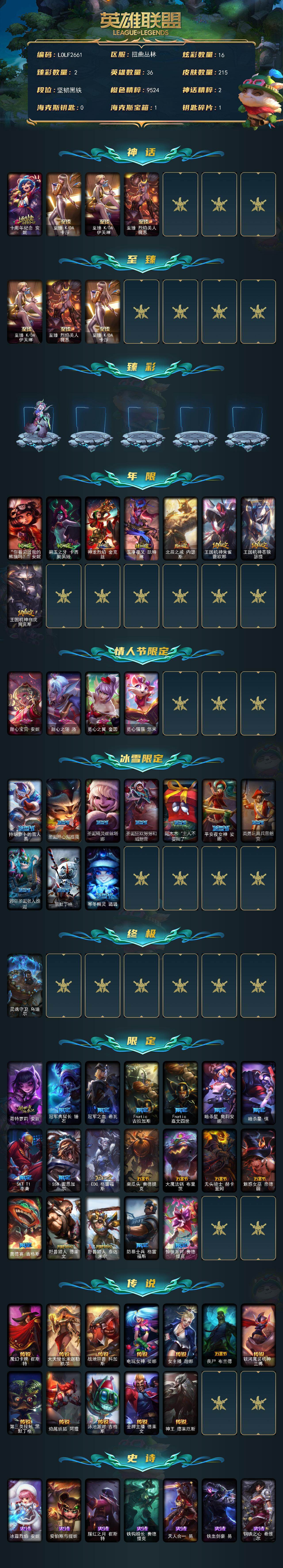 【LOLF2661】36英雄/215皮肤/1终极/4神话/41限定/2臻彩/16炫彩/12传说/56史诗/未定级/十周年纪念安妮/至臻KDA卡莎/至臻KDA伊芙琳/至臻烈焰美人薇恩/魔女阿卡丽虚荣/净雪之月莫甘娜冬虹/你看见过我的熊猫吗安妮/碧玉之牙卡西奥佩娅/神龙烈焰金克丝/玉净夜叉凯特琳/北辰之威内瑟斯/王国机神朱雀蕾欧娜/王国机神苍狼瑟提/王国机神白虎贾克斯/甜心宝贝安妮/甜心之翎洛/觅心之翼奎因/觅心猫猫悠米/持胡萝卜的雪人易/圣诞开心鬼提莫/圣诞精灵崔丝塔娜/圣诞狂欢努努和威朗普/阿木