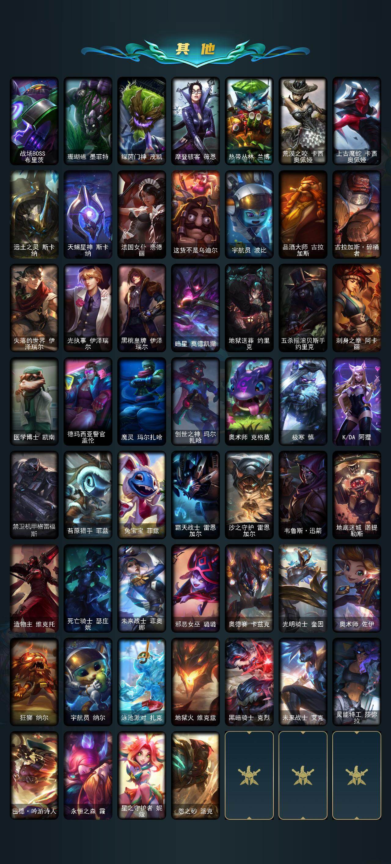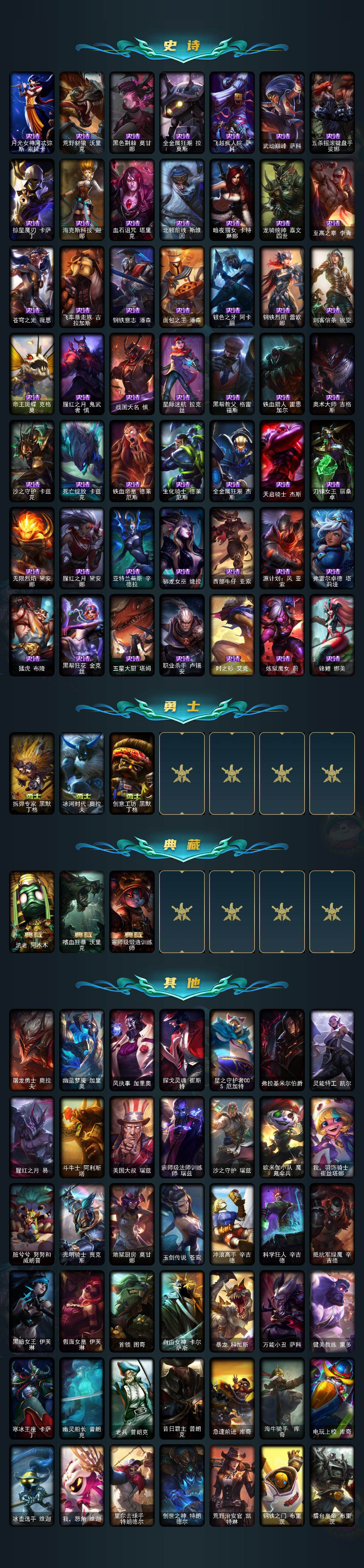 36英雄/215皮肤/1终极/4神话/41限定/2臻彩/16炫彩/12传说/56史诗/未定级