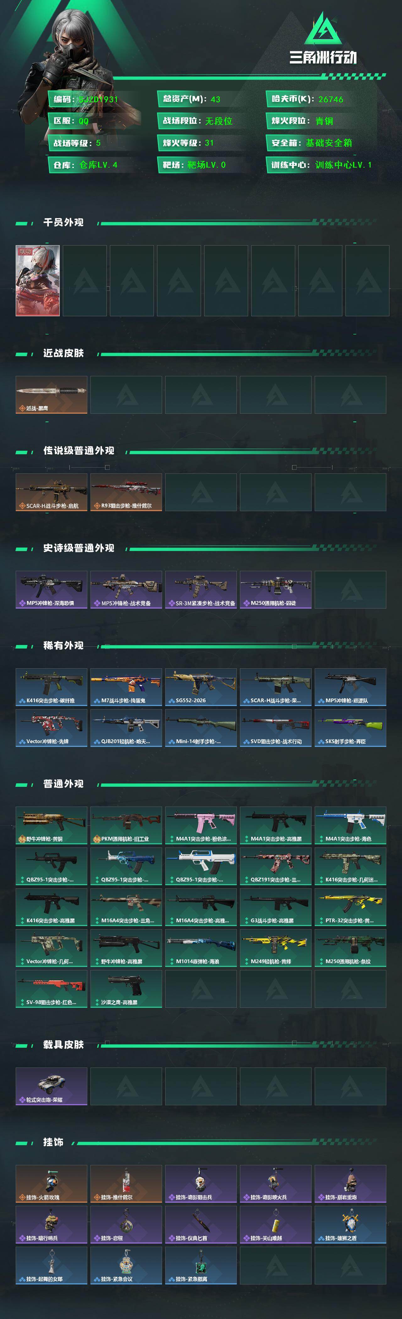 【SJZD1931】总资产(M):43M/哈夫币(K):26746K/哈夫币(K):26746K/传说枪皮数:2/全面战场等级:5_段位:无段位/烽火地带等级:31_段位:青铜/骇爪-维什戴尔/近战-黑鹰/SCAR-H战斗步枪-启航/R93狙击步枪-维什戴尔/MP5冲锋枪-深海恐惧/MP5冲锋枪-战术竞备/SR-3M紧凑突击步枪-战术竞备/M250通用机枪-囚徒/K416突击步枪-碳纤维/M7战斗步枪-捣蛋鬼/SG552突击步枪-2026/SCAR-H战斗步枪-荣耀列队/MP5冲锋枪-巡逻队/V