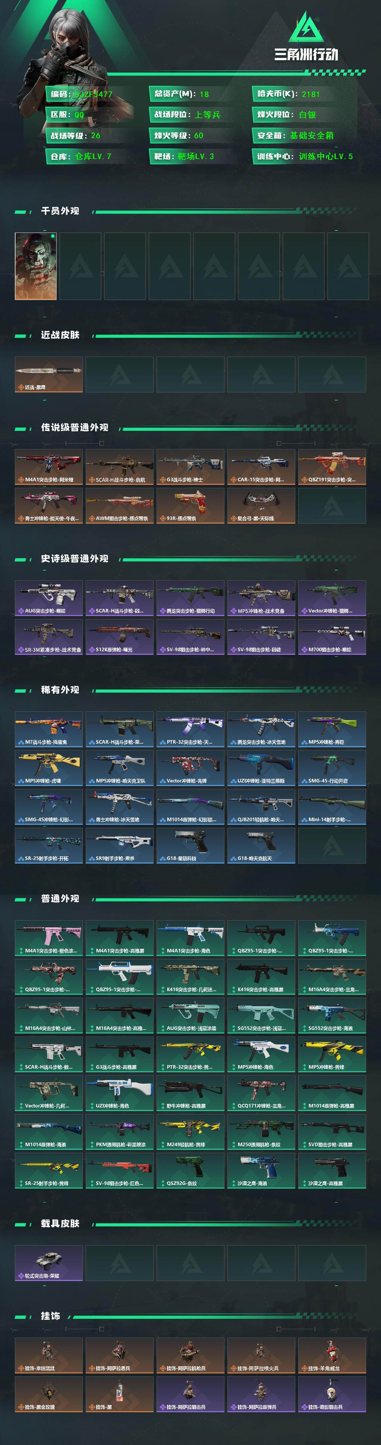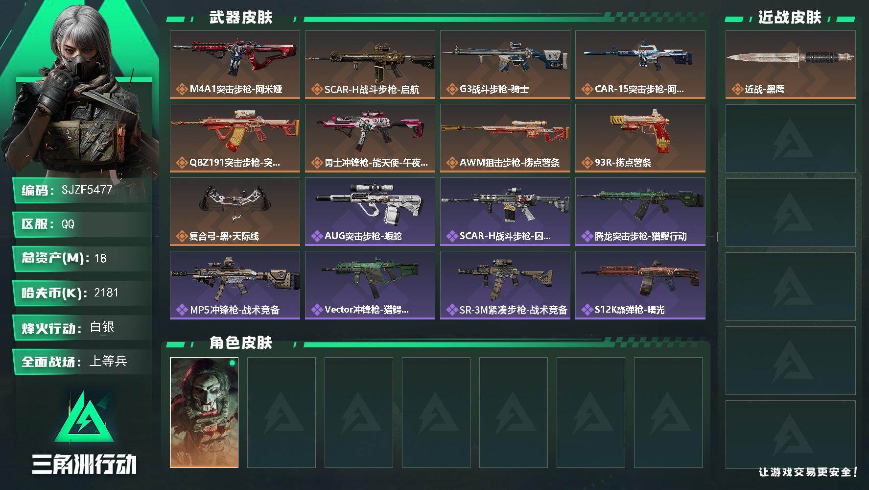 【SJZF5477】总资产(M):18M/哈夫币(K):2181K/哈夫币(K):2181K/传说枪皮数:9/全面战场等级:26_段位:上等兵/烽火地带等级:60_段位:白银/红狼-电锯惊魂/近战-黑鹰/M4A1突击步枪-阿米娅/SCAR-H战斗步枪-启航/G3战斗步枪-骑士/CAR-15突击步枪-阿米娅/腾龙突击步枪-捞点薯条/勇士冲锋枪-能天使-午夜邮差/AWM狙击步枪-捞点薯条/93R-捞点薯条/复合弓-黑·天际线/AUG突击步枪-蝮蛇/SCAR-H战斗步枪-囚徒/腾龙突击步枪-猎鳄行动/