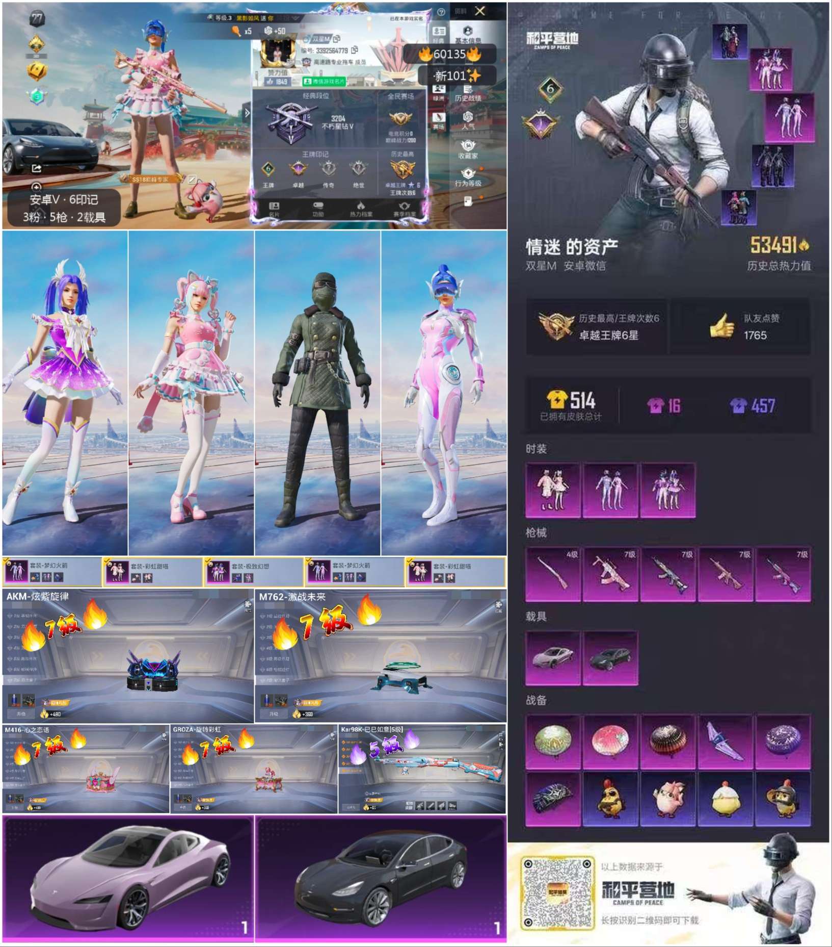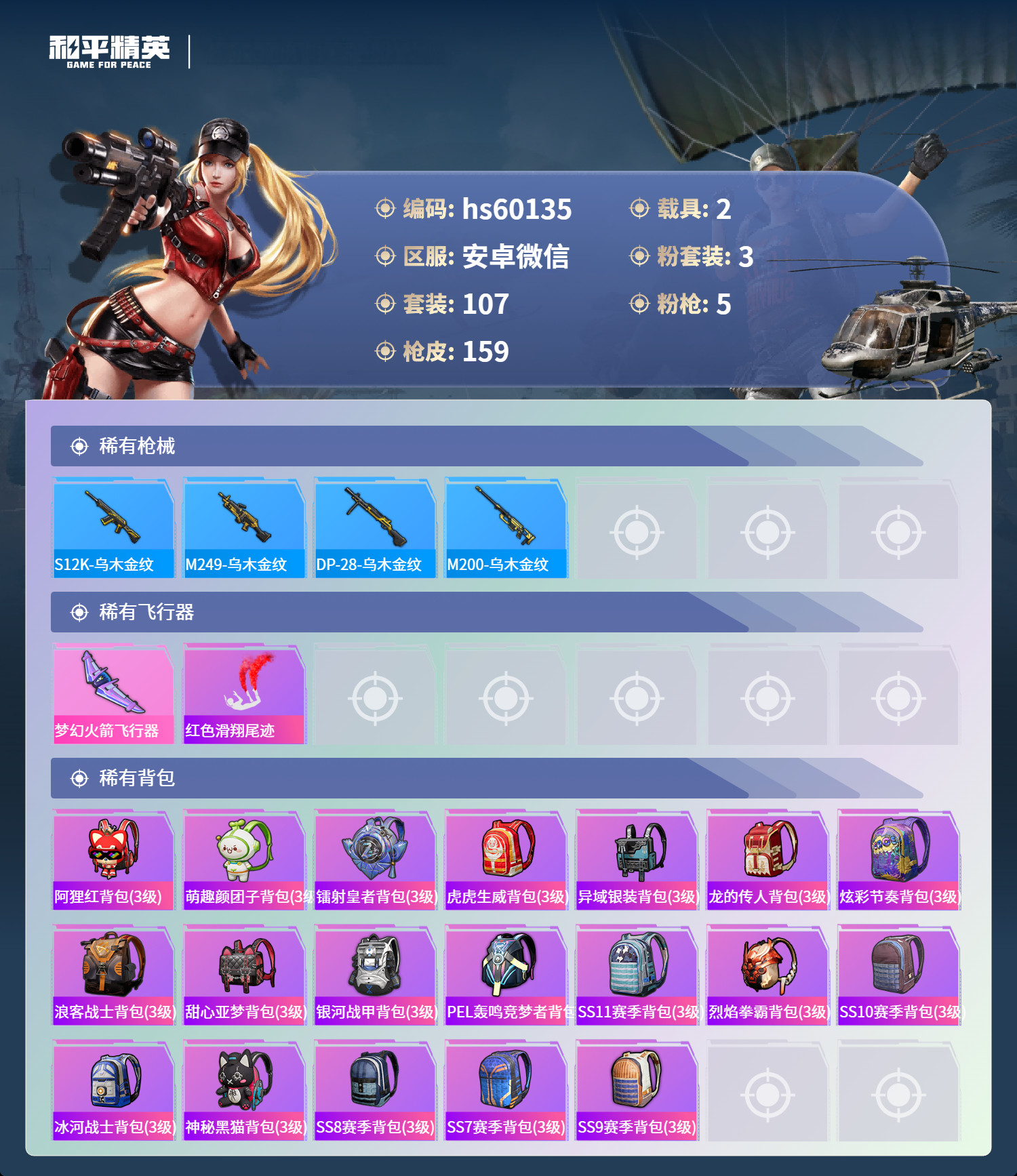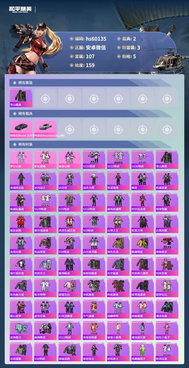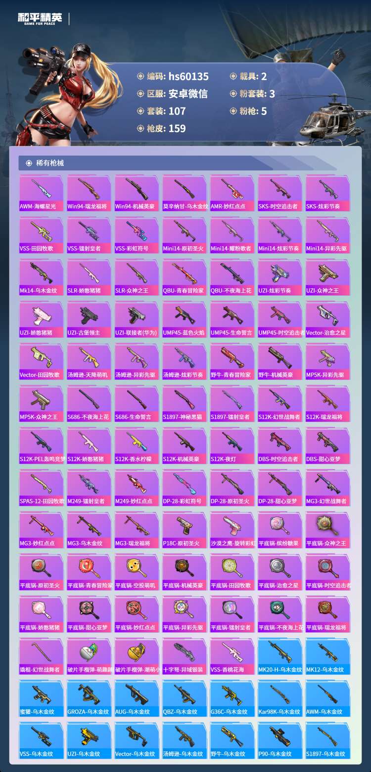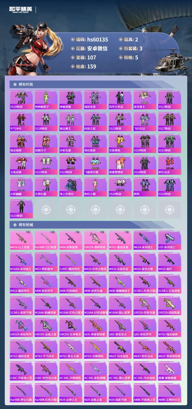 hs60135 安卓微-6王牌印记-3粉装-5特效枪-2载具-54722热力值-107套装-159