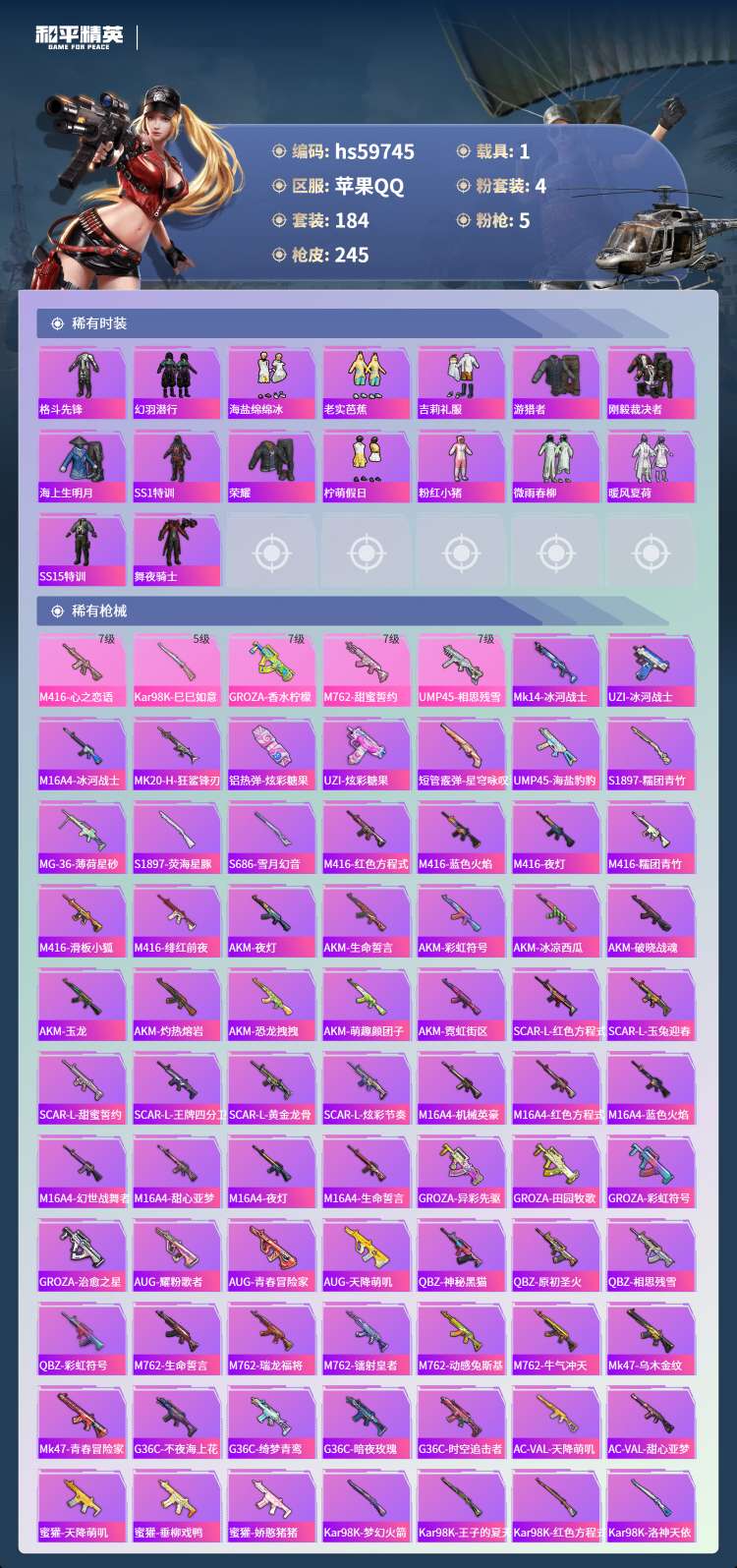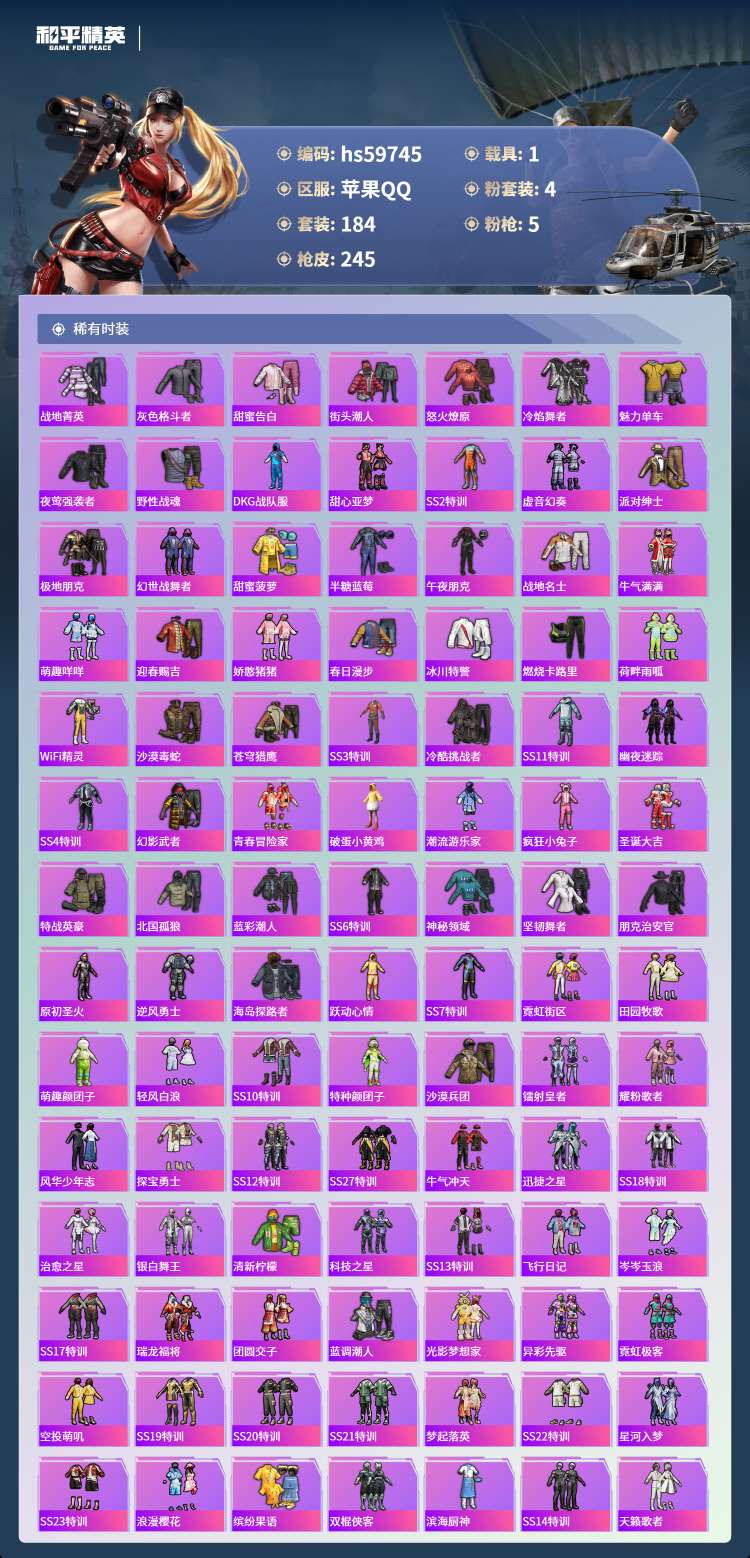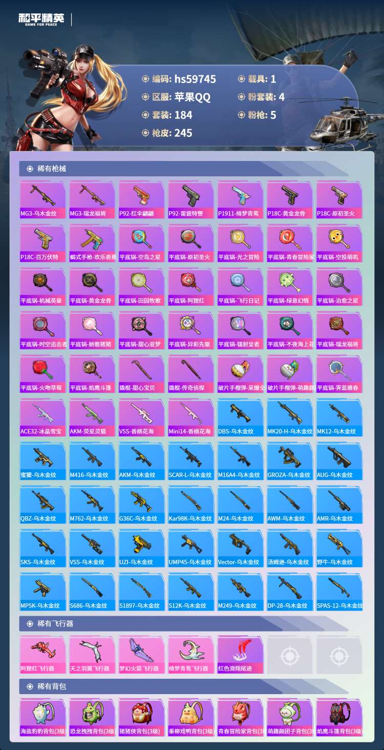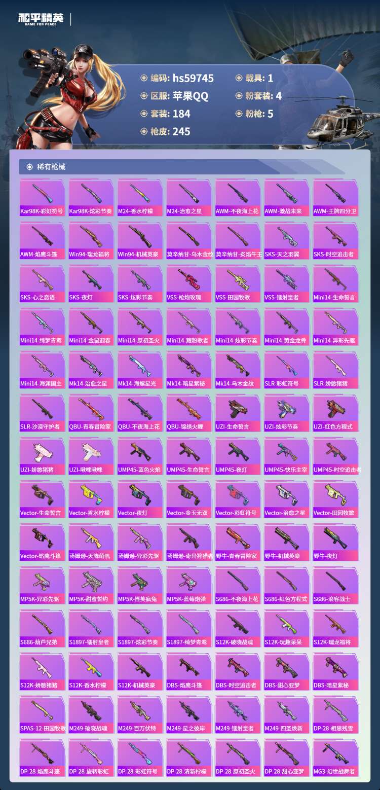 hs59745 苹果手Q-22王牌印记-4粉装-5特效枪-1载具-76470热力值-184套装-24