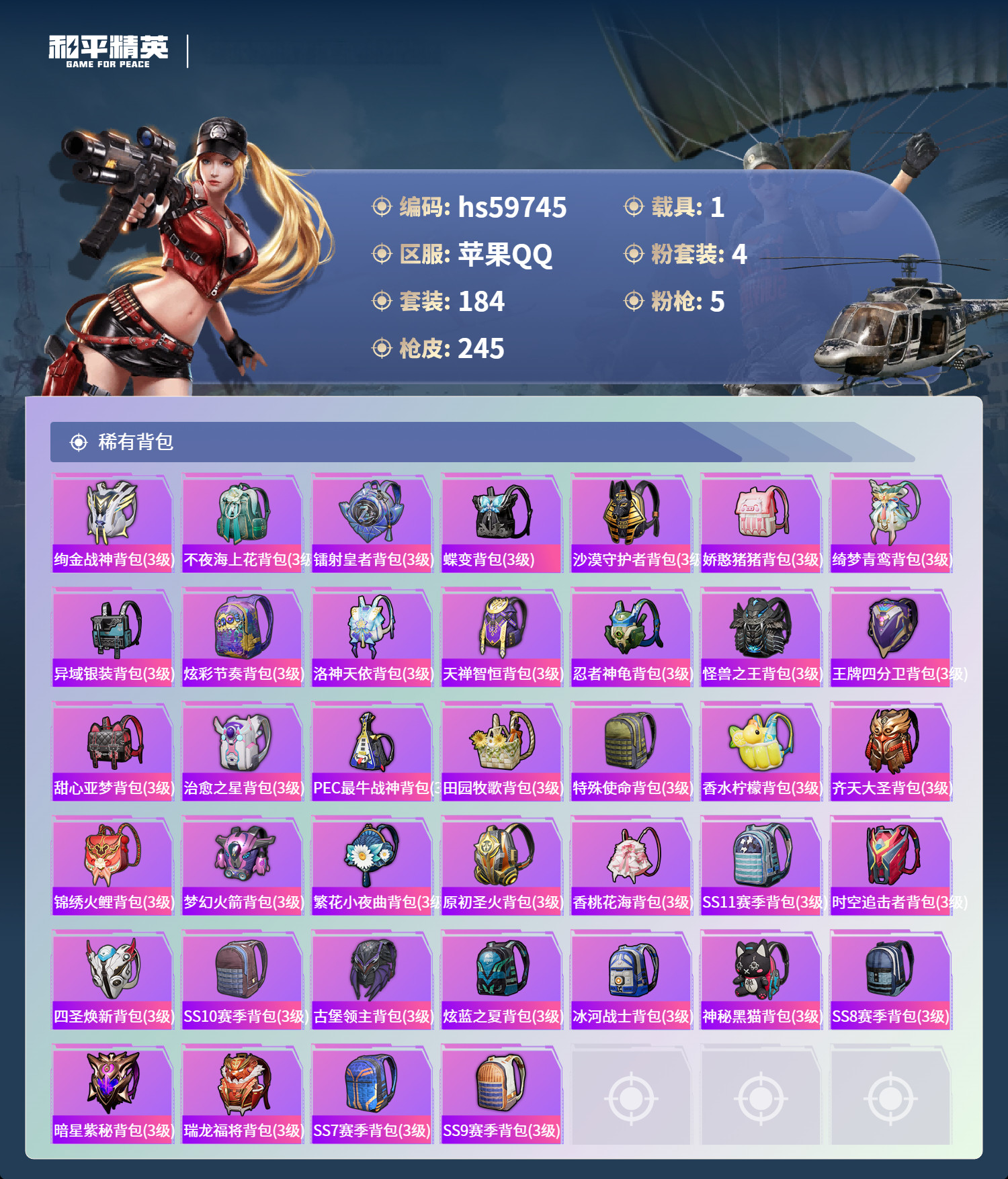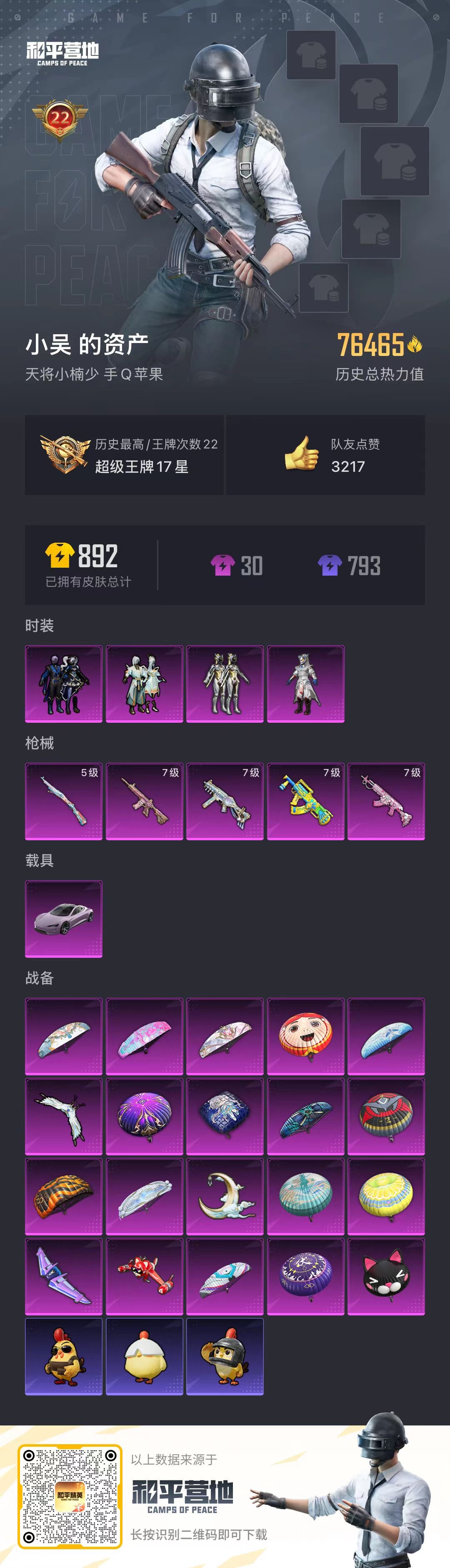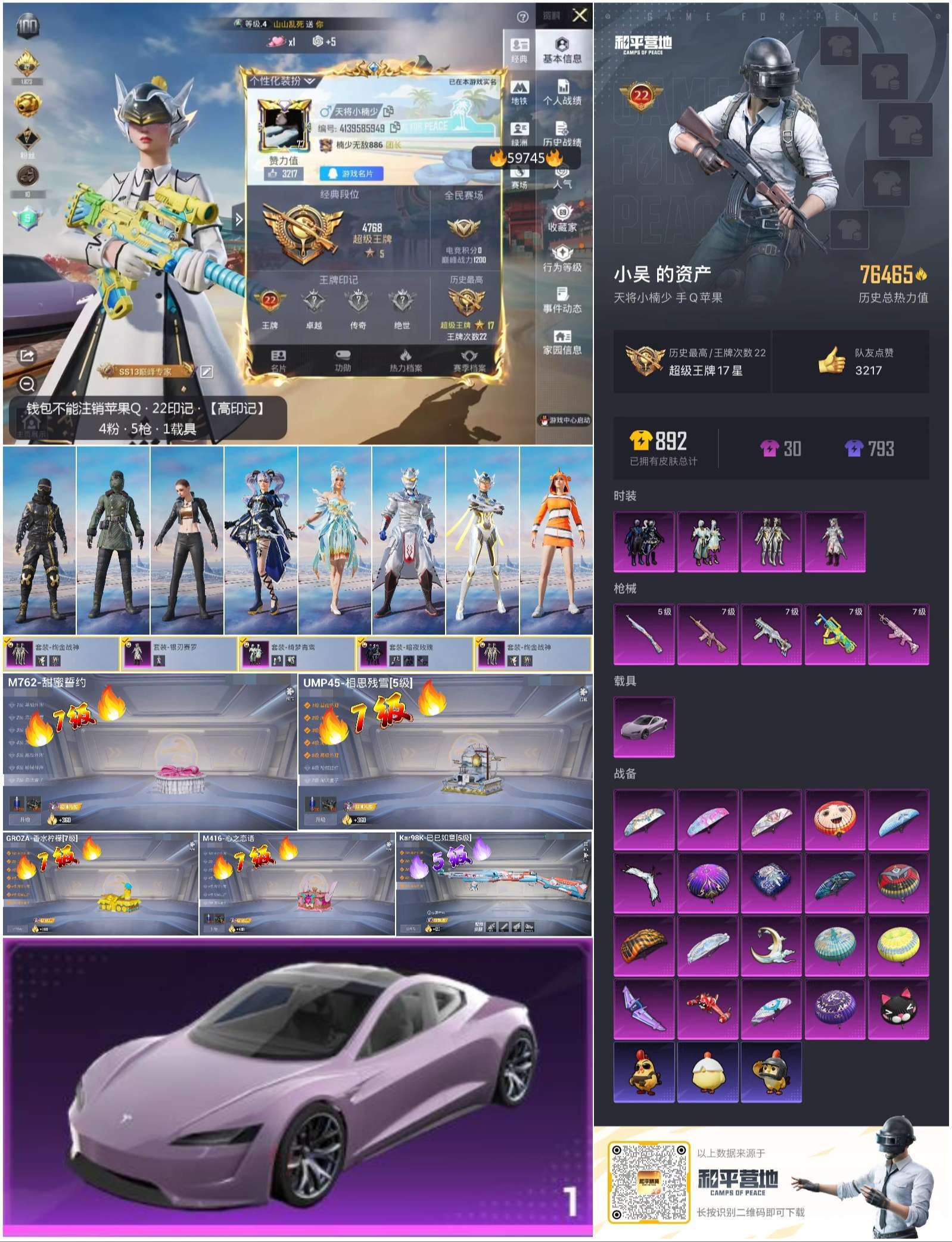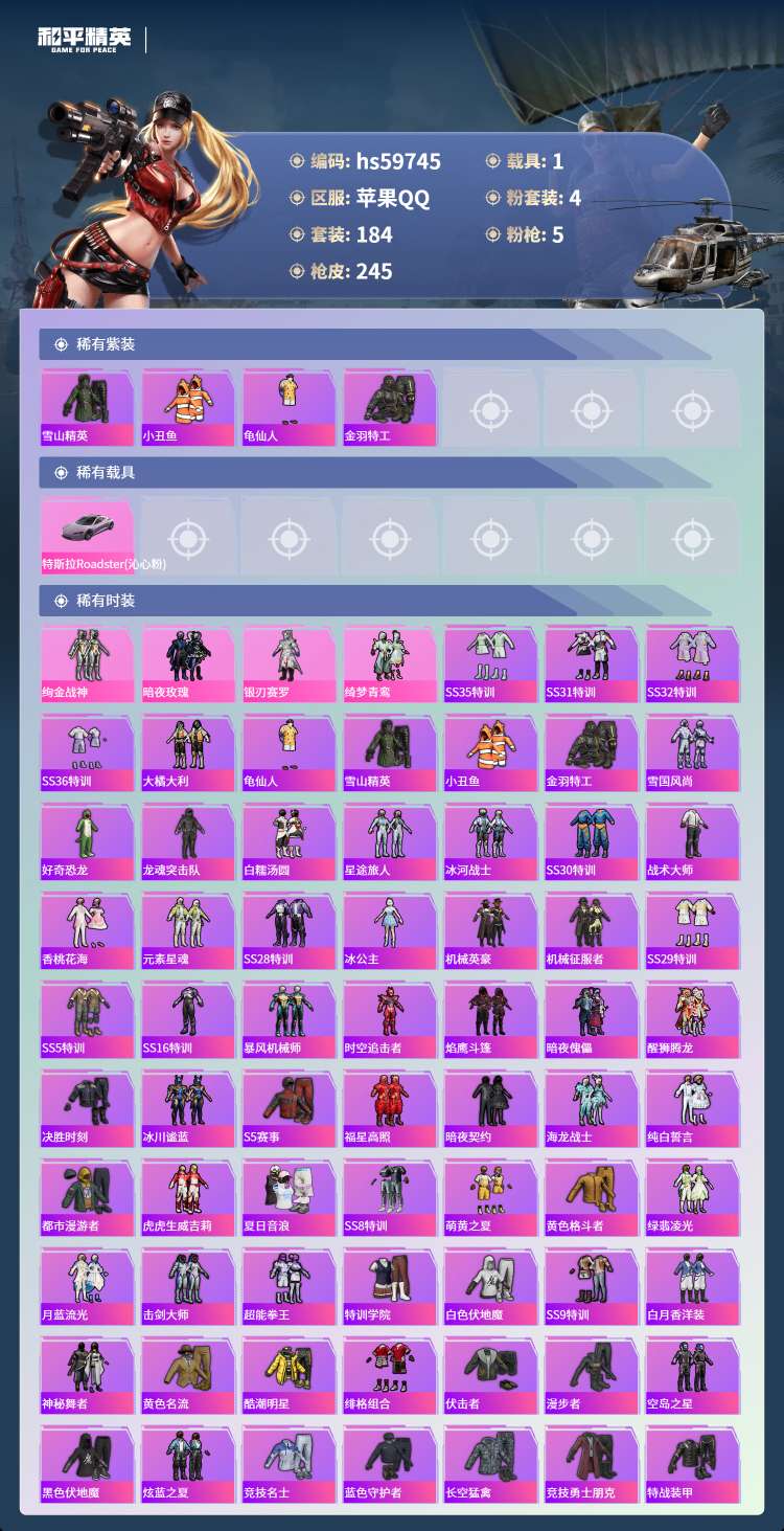 hs59745 苹果手Q-22王牌印记-4粉装-5特效枪-1载具-76470热力值-184套装-24