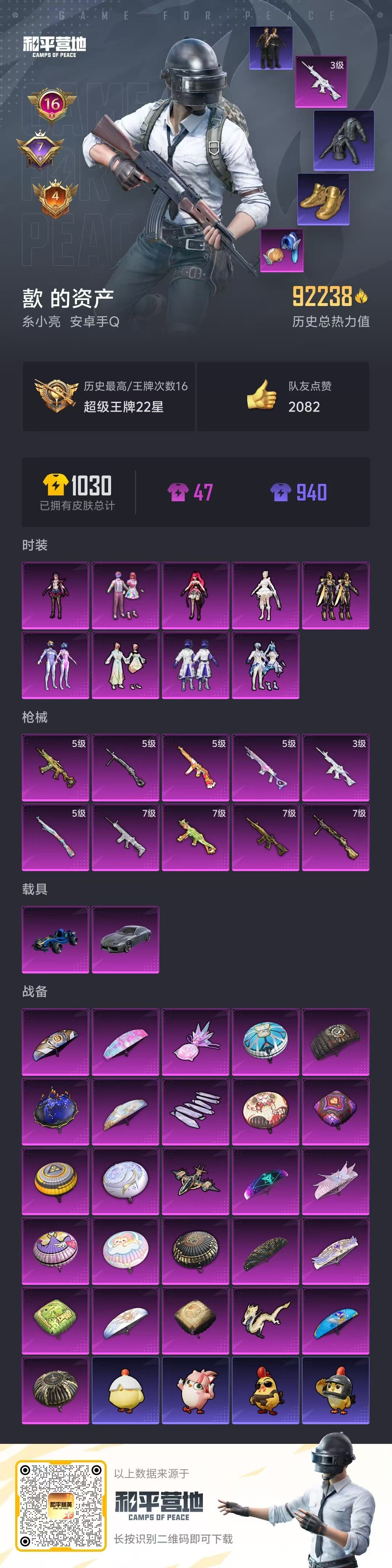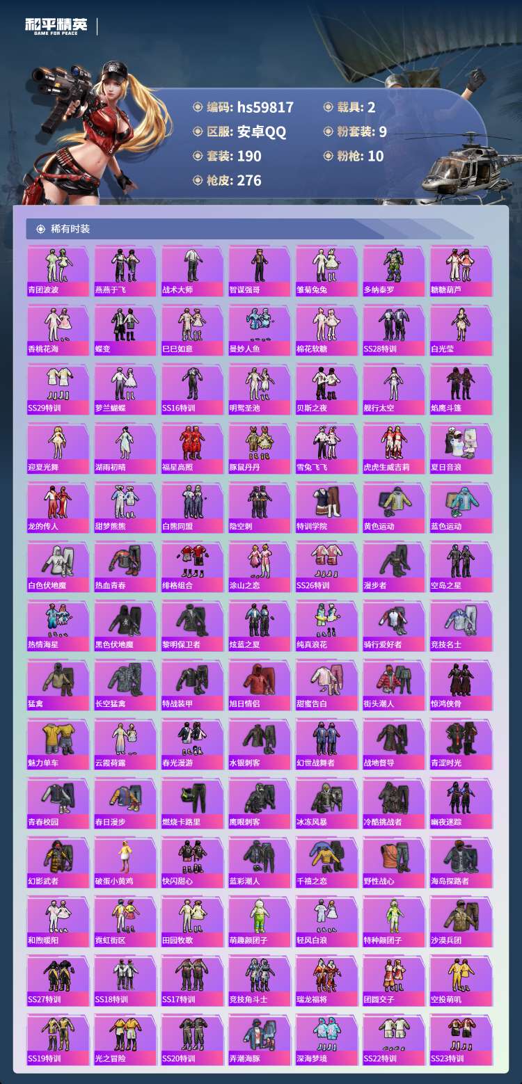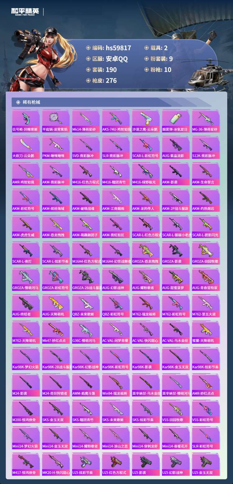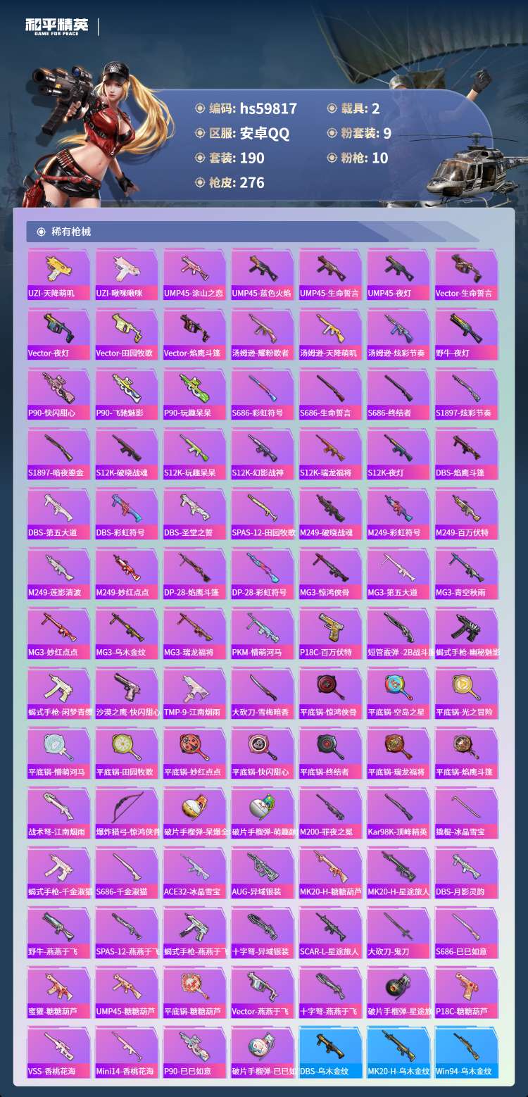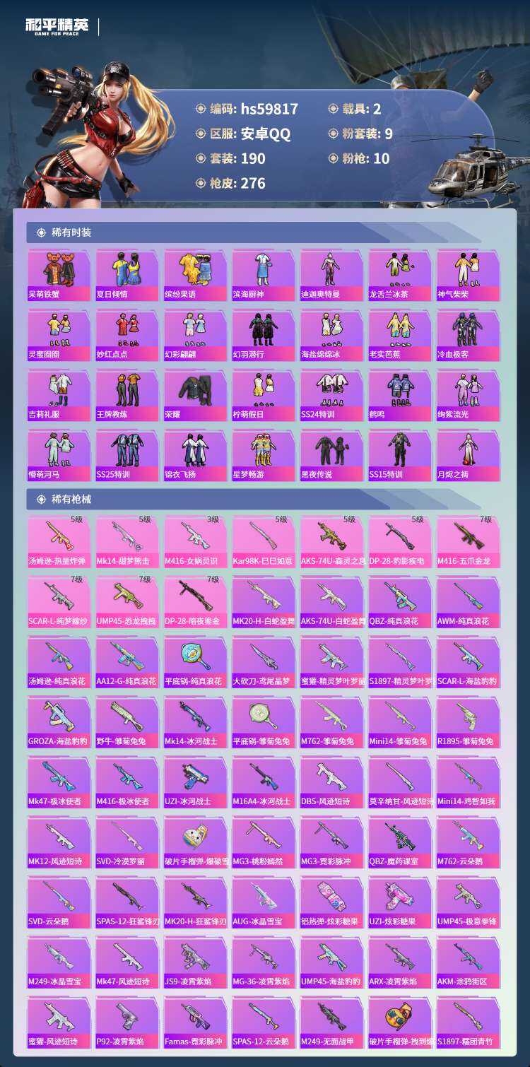 hs59817 安卓手Q-16王牌印记-9粉装-10特效枪-2载具-92238热力值-190套装-2