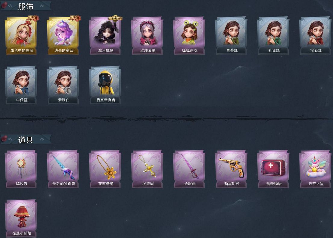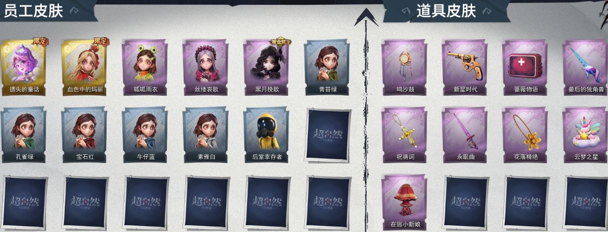 ZR290,金皮:2,紫皮:3,道具皮:9,铲铲币:61w,累充:5240金砖,服装:爱丽丝-血色中的玛丽,小黄-遗失的童话,薇薇安-黑月挽歌,爱丽丝-丝缕哀歌,小黄-呱呱雨衣,员工:小黄、爱丽丝、零、逍遥、薇薇安、巫铃儿、莉莉、艾伦、爱德华,头饰:鱼头怪头套、烈焰红唇头套、大葱明头套、火爆了头套、面具马头套、哈士奇头套、萨卡班甲鱼头套、嘻嘻头套、滑稽头套、呆滞头套、卑微头套、驼半仙头套、炙热烧烤