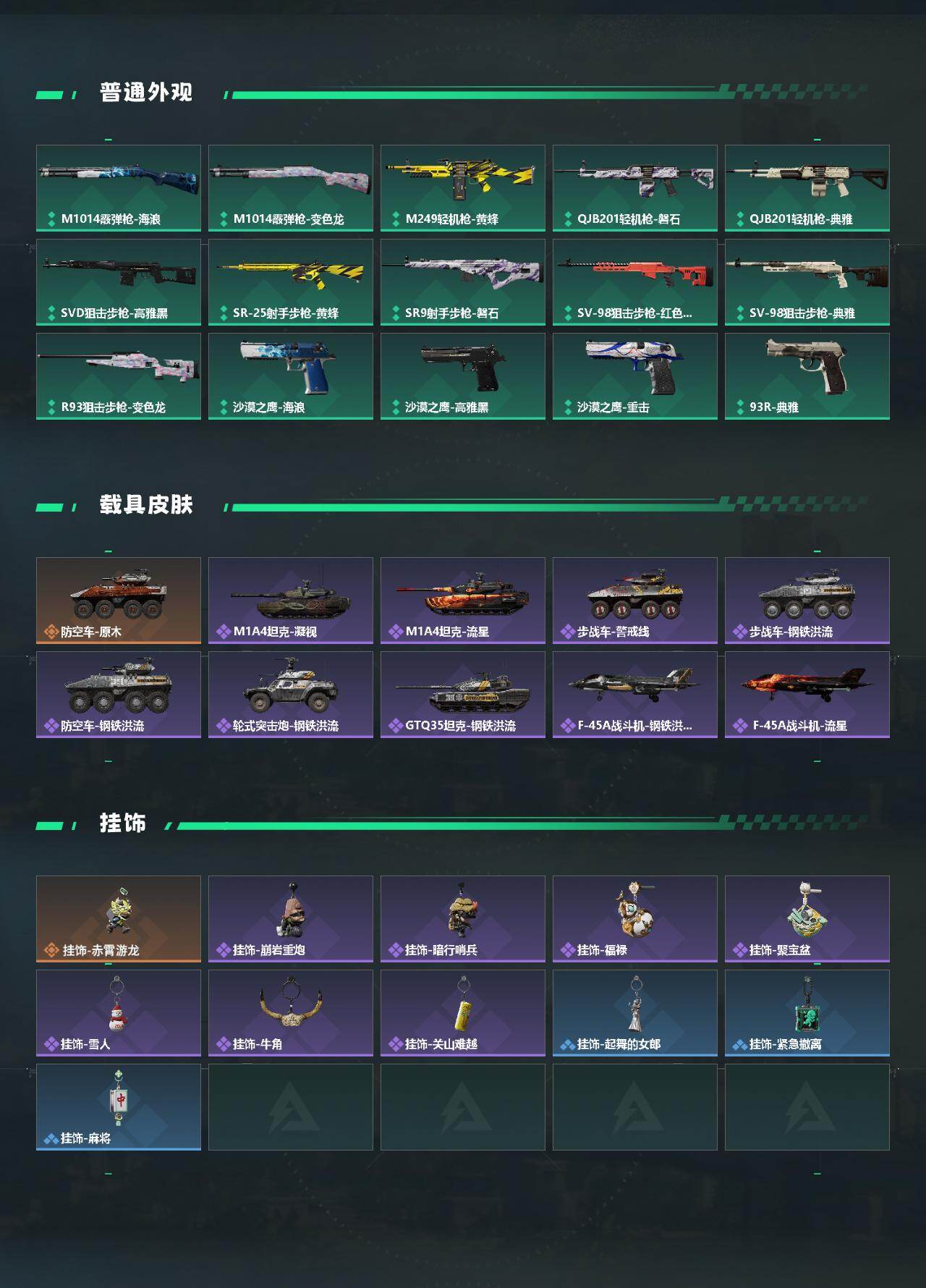 【传说外观】:SG552突击步枪-运动员,MK47突击步枪-暗星,SR-3M紧凑突击步枪-白鹰兵势,M14射手步枪-蛮荒