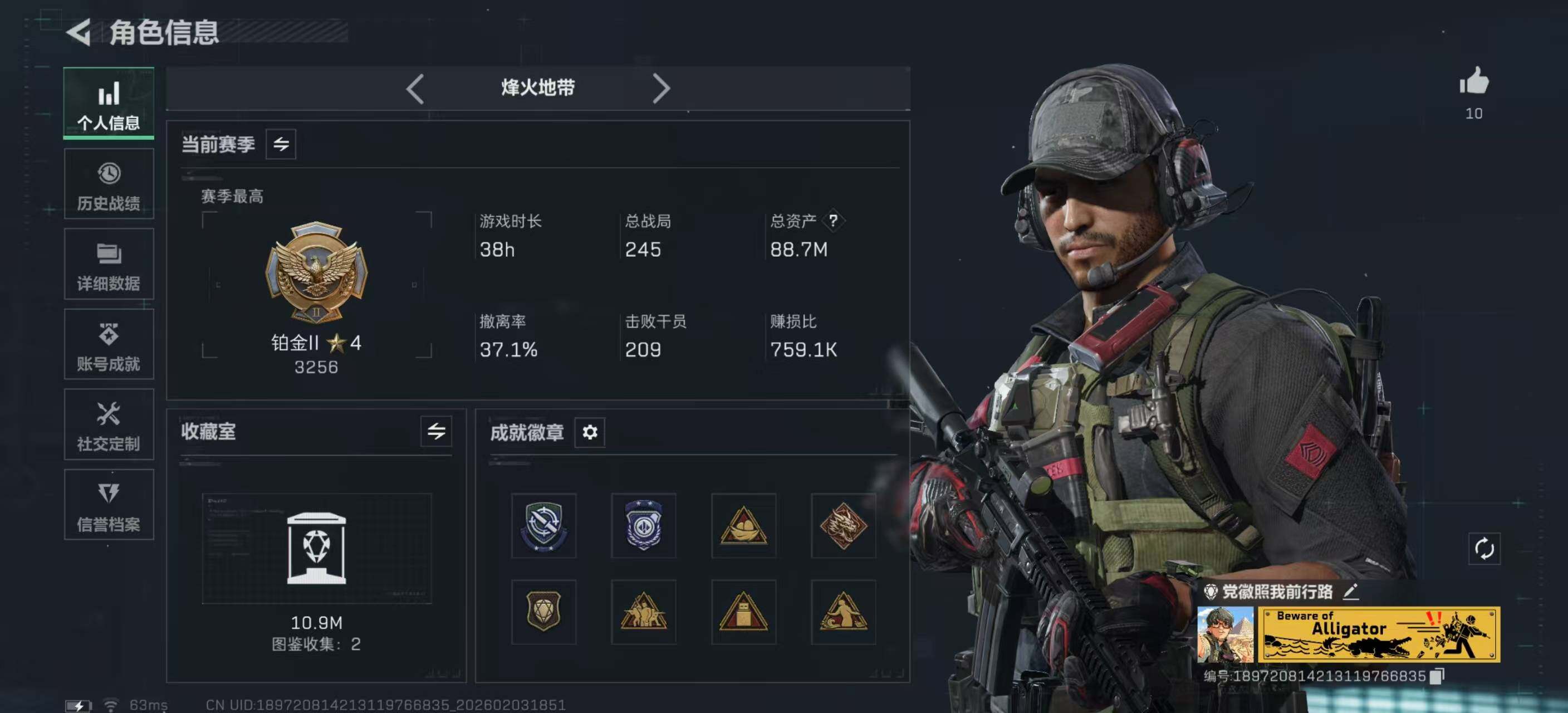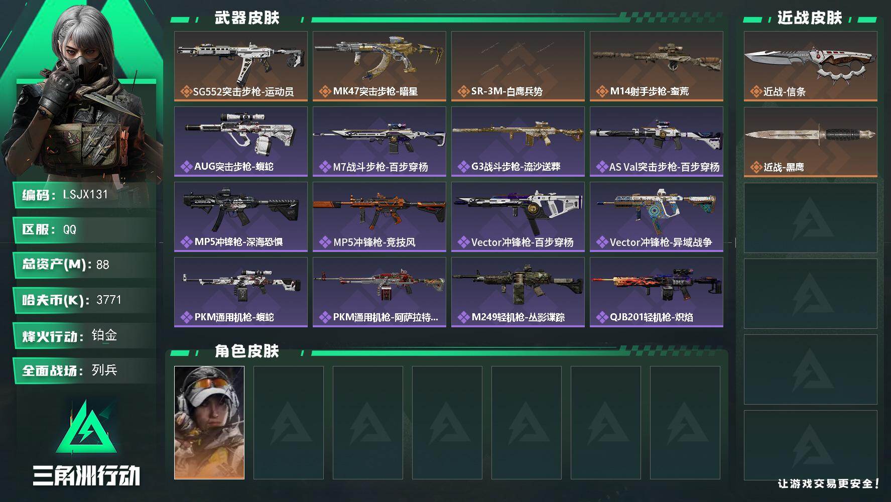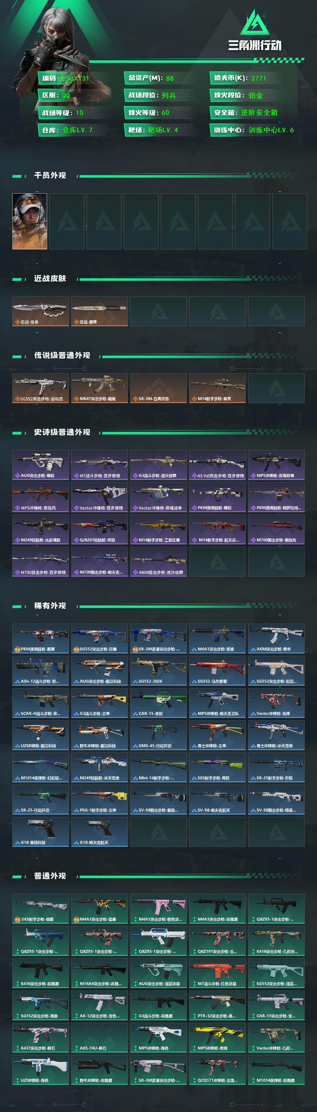 88m总资产-3771k哈伏币-60烽火等级-铂金-10战场等级-列兵【干员
