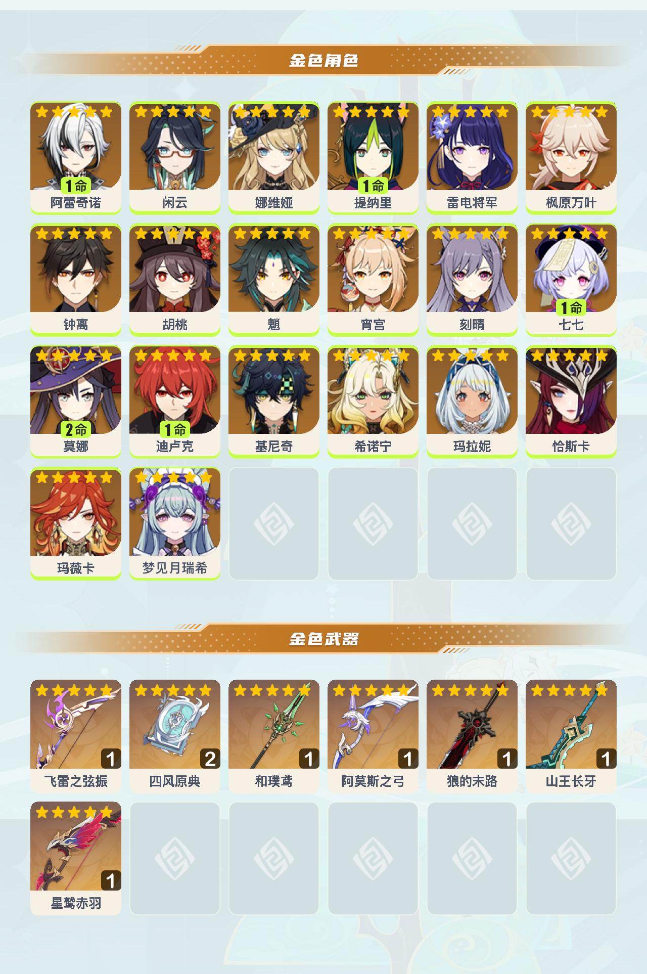 【YSX1621】58级/34黄/女主/20个五星角色/7个五星武器/钟离/玛拉妮/希诺宁/玛薇卡/恰斯卡/枫原万叶/魈/雷电将军/基尼奇/1命阿蕾奇诺/闲云/胡桃/宵宫/娜维娅/1命提纳里/1命七七/2命莫娜/1命迪卢克/梦见月瑞希/刻晴/山王长牙/星鹫赤羽/精2四风原典/和璞鸢/狼的末路/阿莫斯之弓/飞雷之弦振