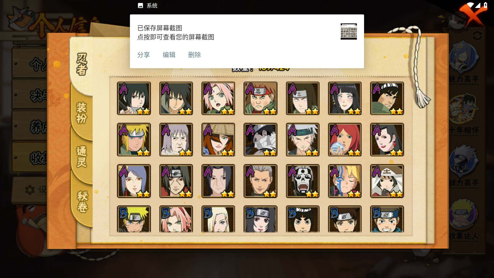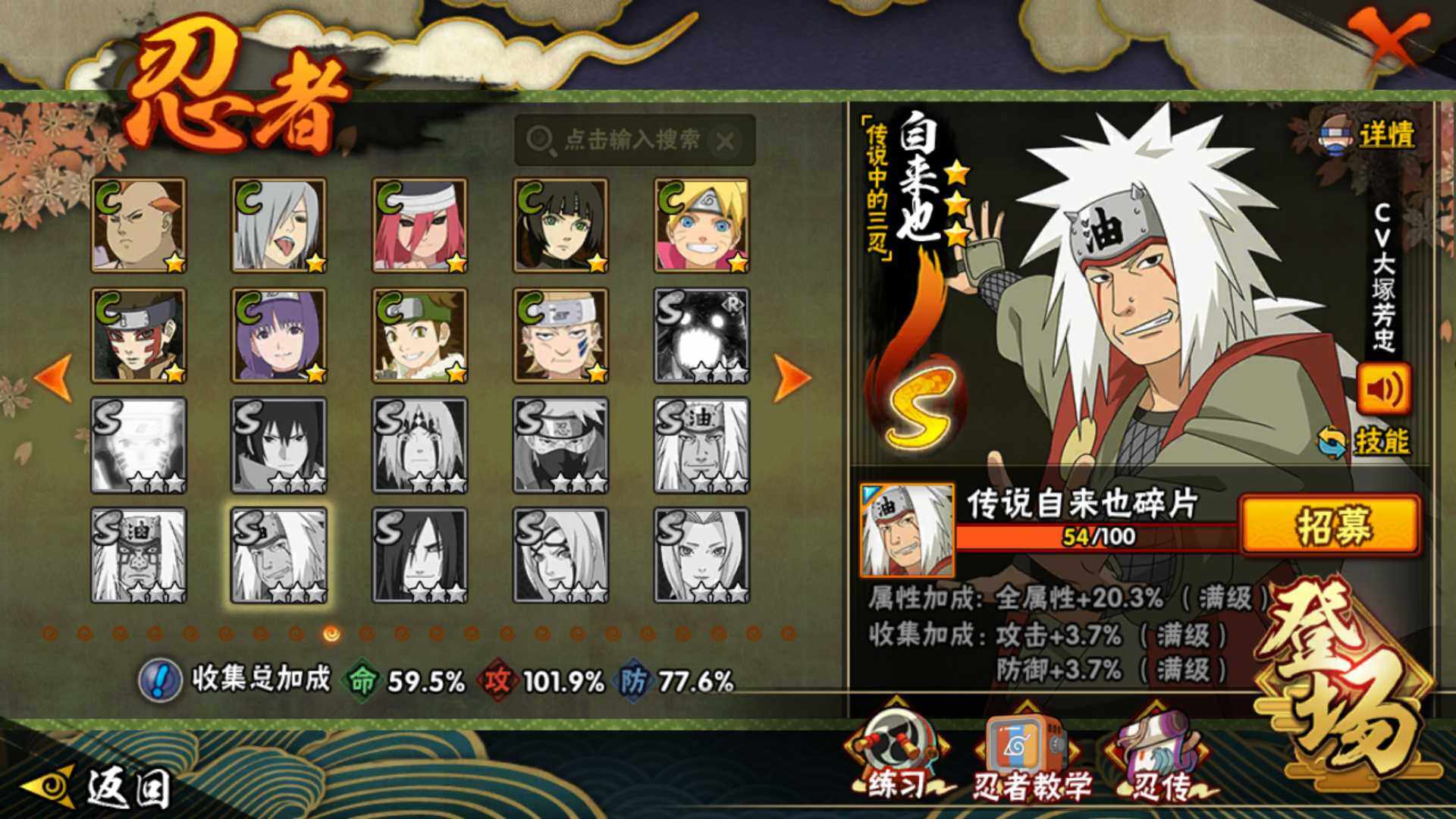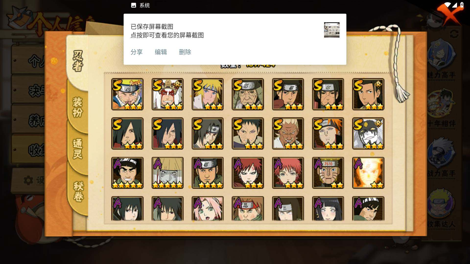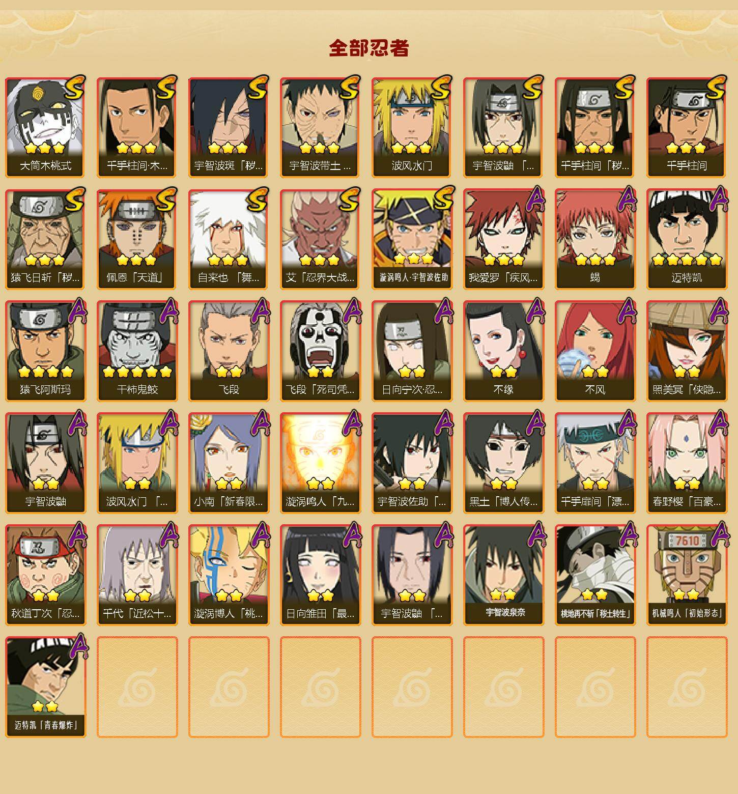 【S级忍者】:猿飞日斩「秽土转生」(3星),千手柱间「秽土转生」(3星),宇智波斑「秽土转生·解」(3星),宇智波带土「忍界大战」(3星),艾「忍界大战」(3星),宇智波鼬「须佐能乎」(3星),千手柱间「木叶创立」(3星),自来也「舞之豪杰」(3星),千手柱间(3星),波风水门(3星),佩