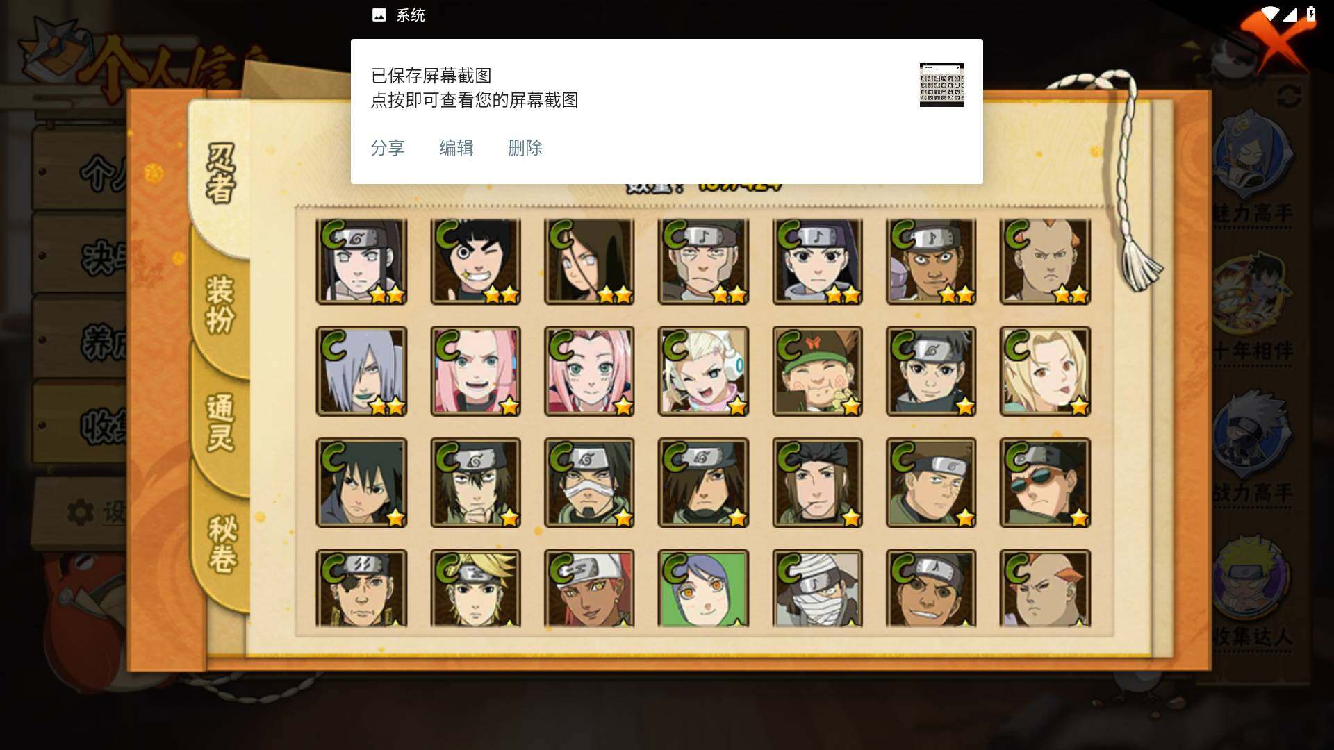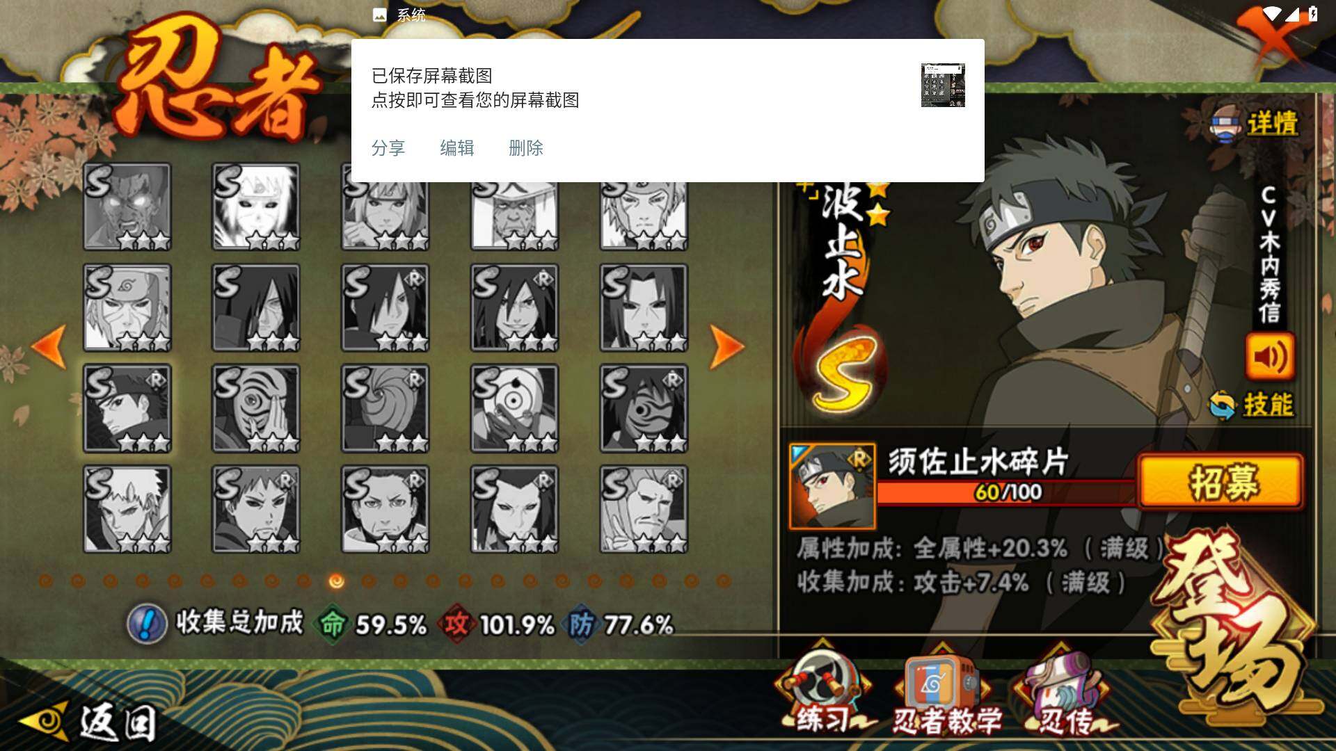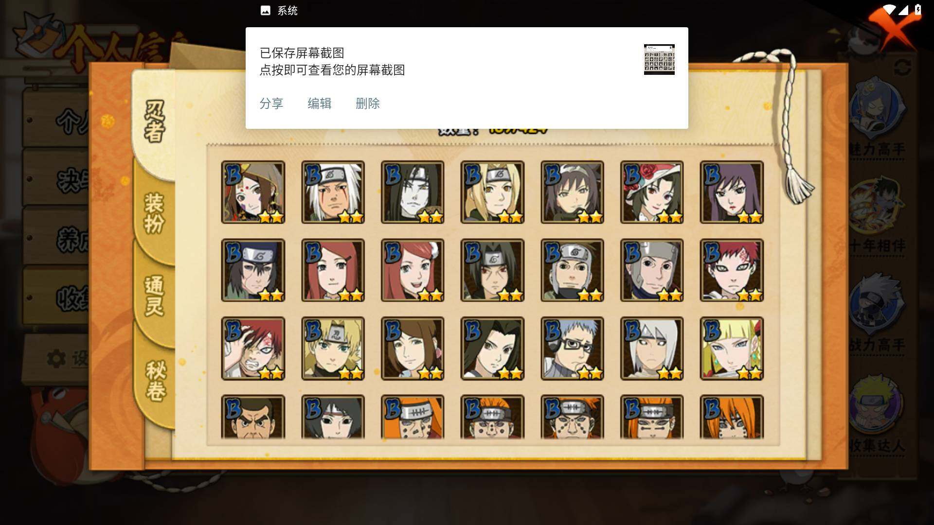 【S级忍者】:猿飞日斩「秽土转生」(3星),千手柱间「秽土转生」(3星),宇智波斑「秽土转生·解」(3星),宇智波带土「忍界大战」(3星),艾「忍界大战」(3星),宇智波鼬「须佐能乎」(3星),千手柱间「木叶创立」(3星),自来也「舞之豪杰」(3星),千手柱间(3星),波风水门(3星),佩