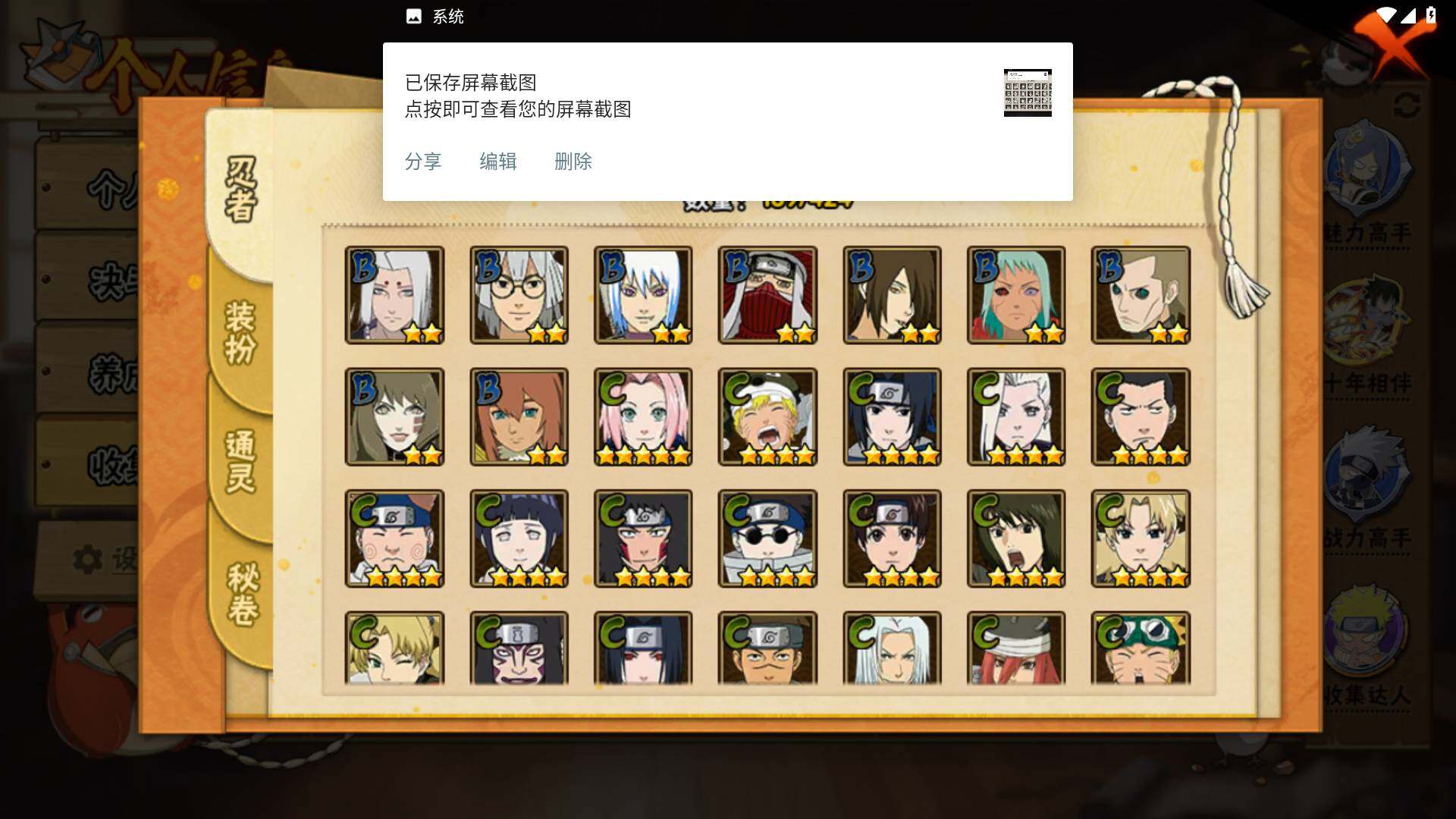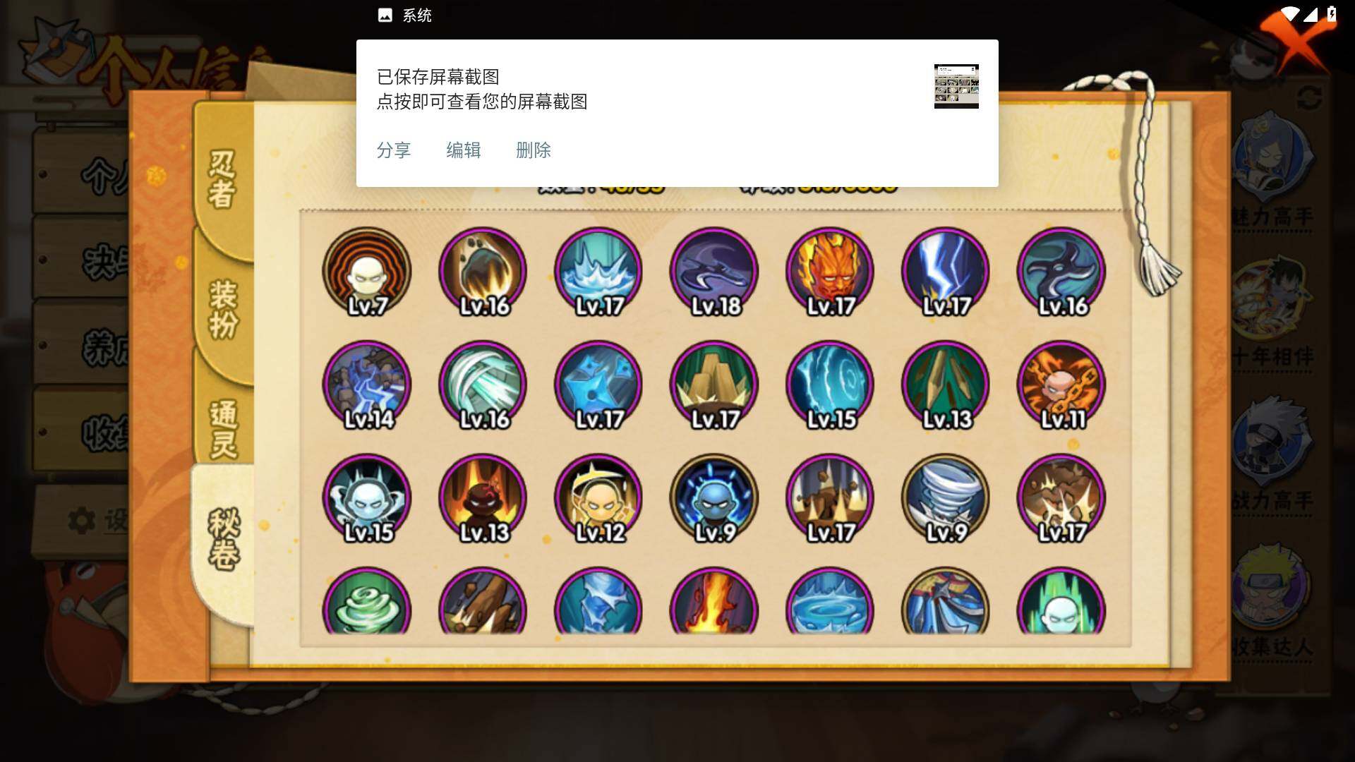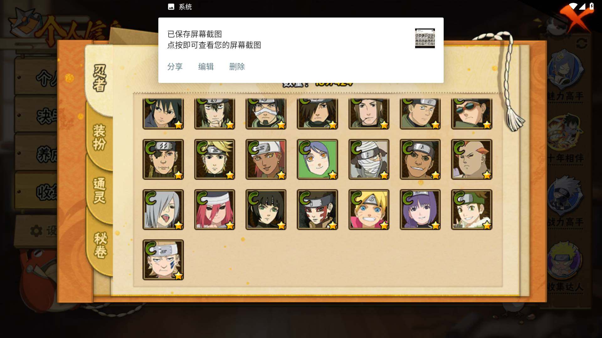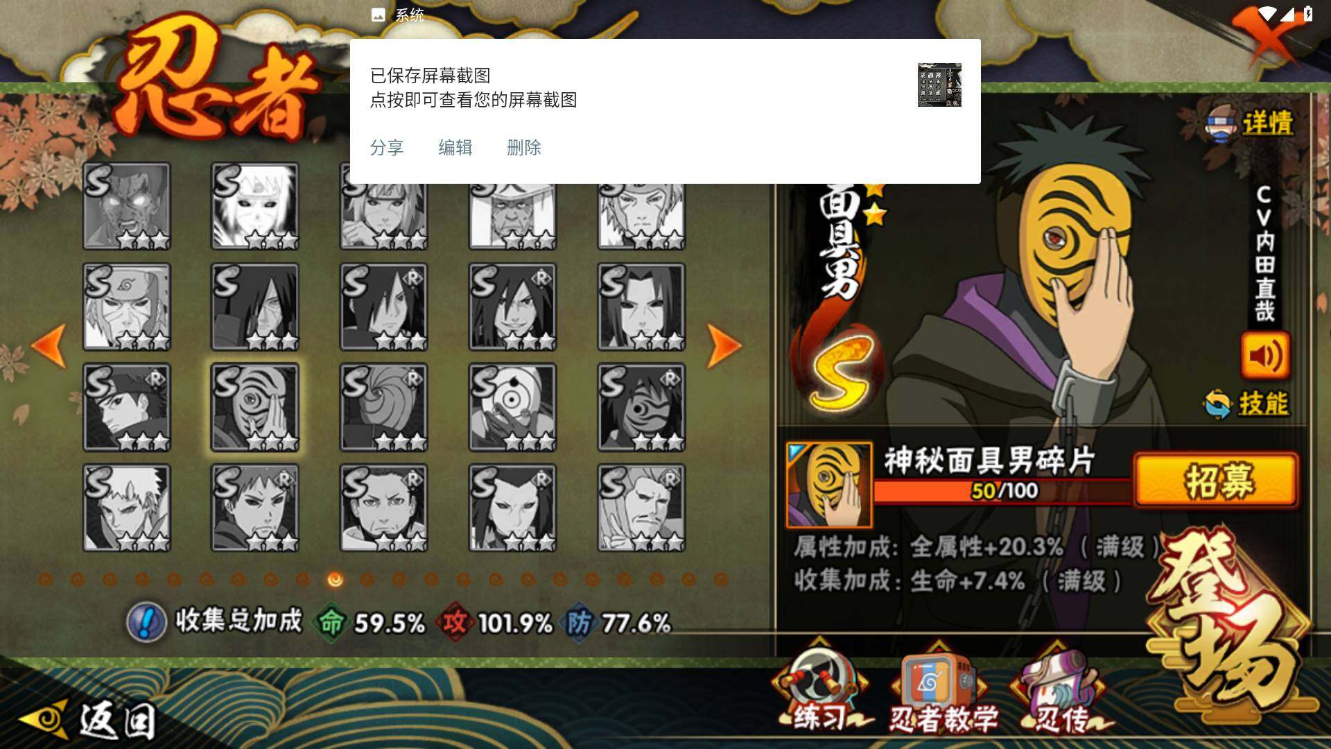 【S级忍者】:猿飞日斩「秽土转生」(3星),千手柱间「秽土转生」(3星),宇智波斑「秽土转生·解」(3星),宇智波带土「忍界大战」(3星),艾「忍界大战」(3星),宇智波鼬「须佐能乎」(3星),千手柱间「木叶创立」(3星),自来也「舞之豪杰」(3星),千手柱间(3星),波风水门(3星),佩