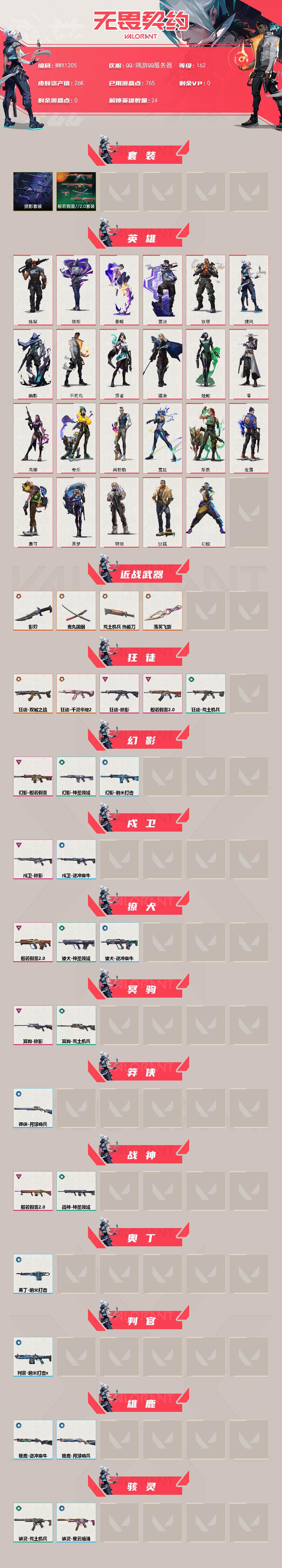 【WWX1205】终极*6/卓越*11/皮肤*44/等级*162/段位:钻石/般若假面//2.0套装/掠影套装/幻棱/炼狱/维斯/暮蝶/钛狐/壹决/铁臂/捷风/幽影/不死鸟/贤者/猎枭/蝰蛇/零/芮娜/奇乐/尚勃勒/霓虹/斯凯/夜露/盖可/黑梦/钢锁/近战武器-落英飞旋/近战武器-鬼丸国纲/近战武器-荒土机兵 热能刀/近战武器-影刃/狂徒-双城之战/狂徒-千灵华绽//2.0/狂徒-般若假面//2.0/狂徒-掠影/狂徒-荒土机兵/幻影-般若假面/幻影-神圣领域/幻影-纳米打击/戍卫-掠影/戍卫-逆