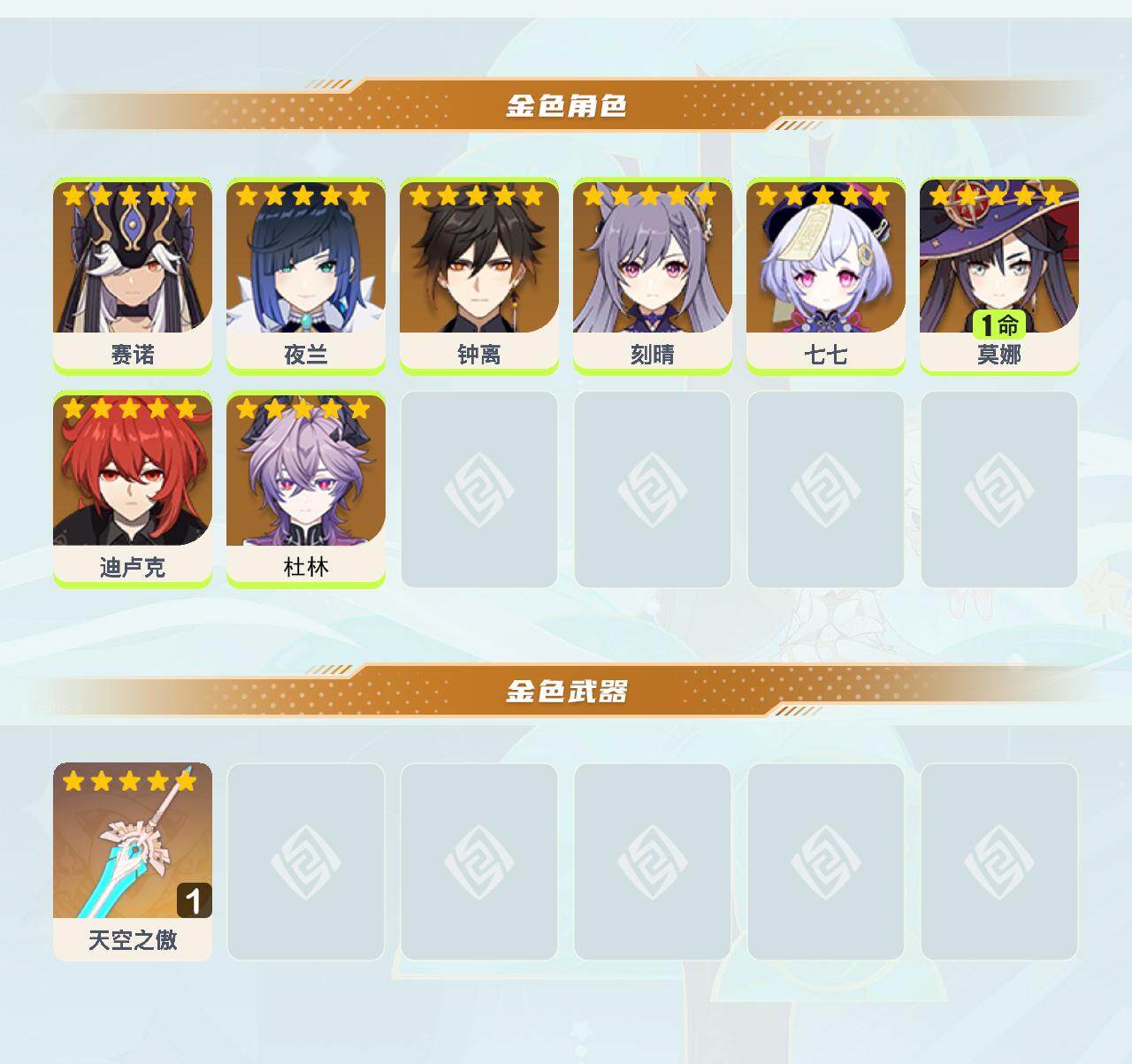 54级/10黄/女主/8个五星角色/1个五星武器/夜兰/钟离/0命杜林/刻晴/1命莫娜/迪卢克/赛诺/七七/天空之傲