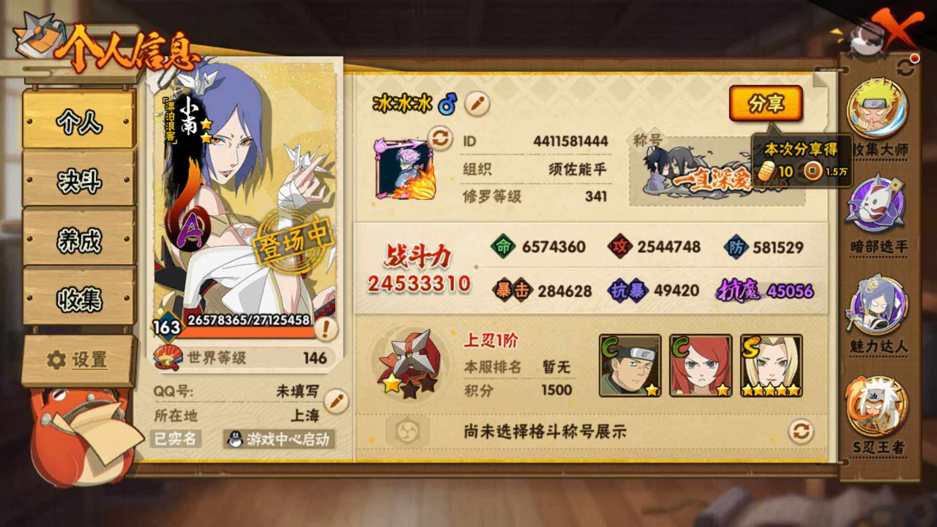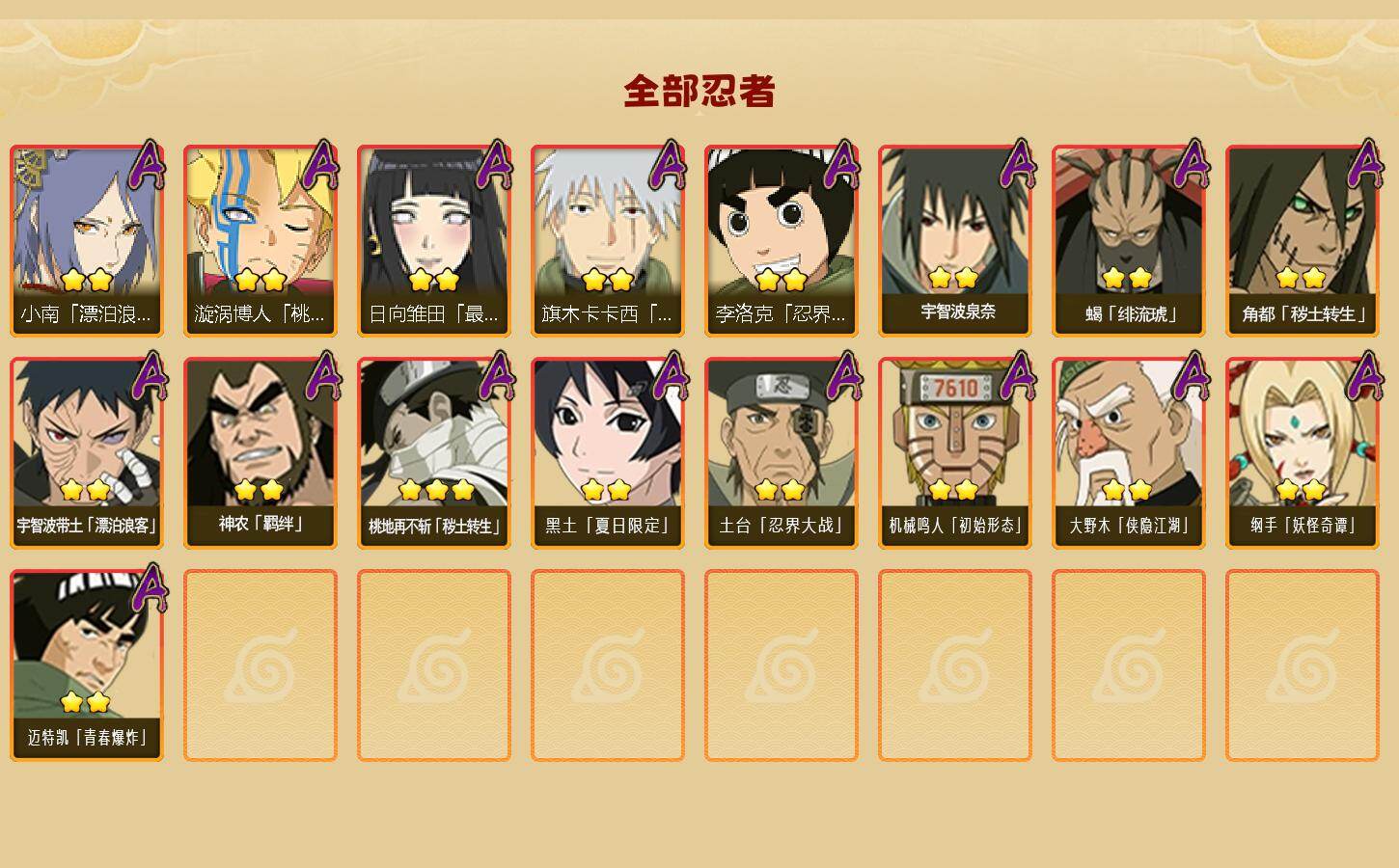 【S级忍者】:长门「秽土转生」(3星),半藏「秽土转生」(3星),金角·银角「秽土转