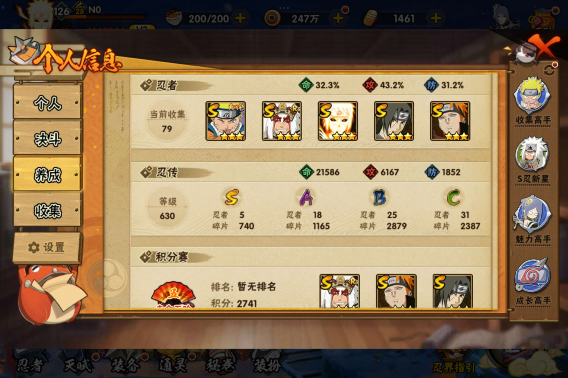 【S级忍者】波风水门「九喇嘛连结」(3星),自来也「舞之豪杰」(3星),宇智波鼬「须佐能乎」(3星),漩涡鸣人·宇智波佐助(3星),佩恩「天道」(3星),