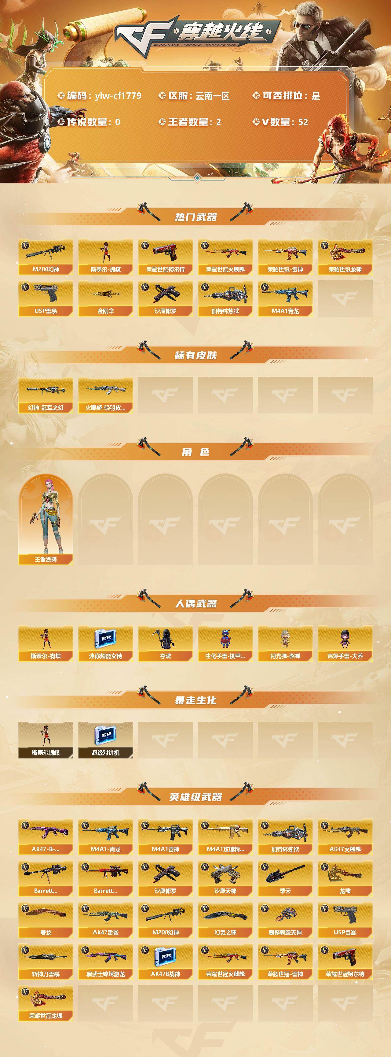 【商品标题】:云南一区-52V-2王者-0炫金【热门武器】:M4A1-青龙,
