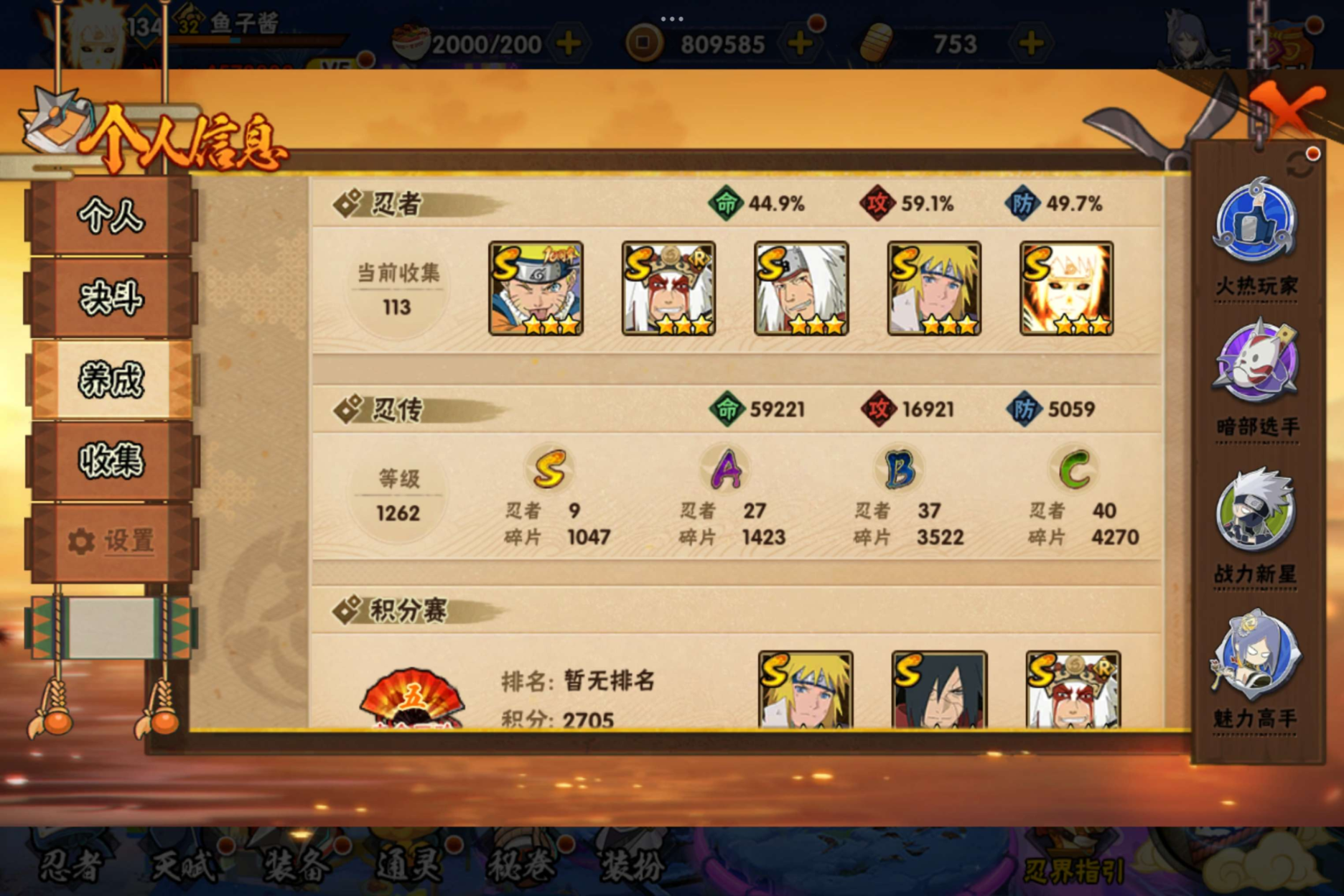 安卓QQ-暗部-精养小号-神秘面具男「忍者之路」-自来也「传说中的三忍」-佩恩「天道」-艾「忍界大战」-波风水门「九喇嘛连结」-S忍者数:9- A忍者数:27