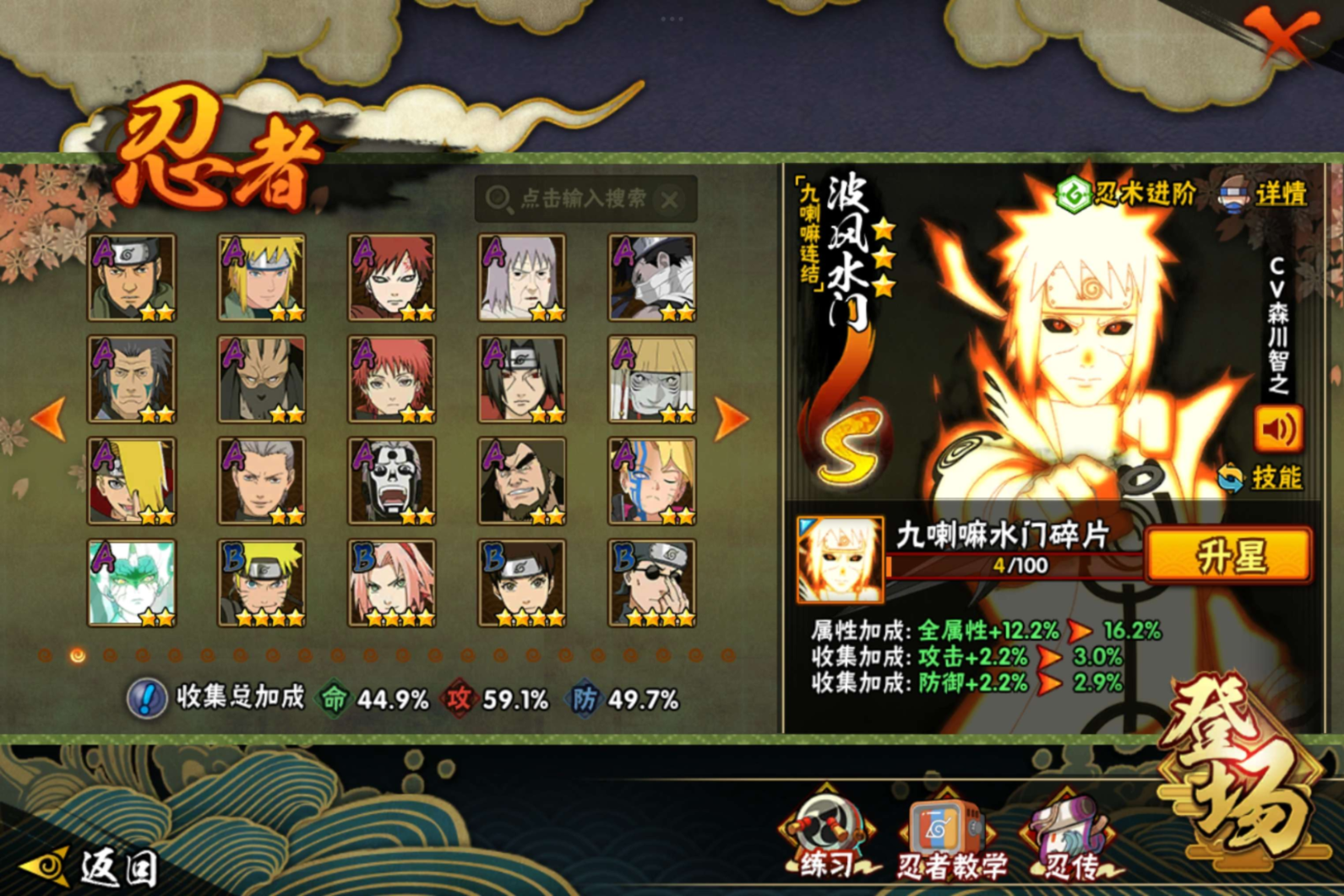 【S级忍者】自来也「传说中的三忍」(3星),宇智波斑「秽土转生·解」(3星),艾「忍界大战」(3星),波风水门「九喇嘛连结」(3星),自来也「舞之豪杰」(3星),宇智波鼬「须佐能乎」(3星),漩涡鸣人·宇智波佐助(3星),佩恩「天道」(