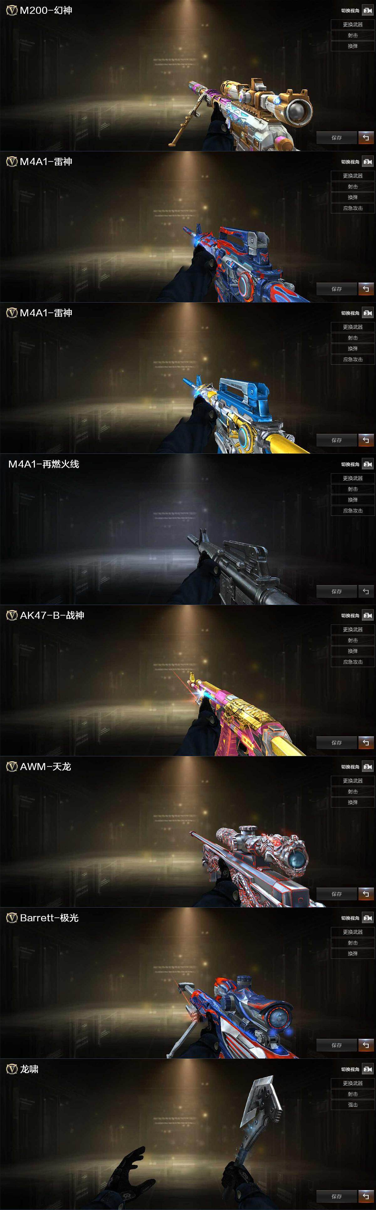 【皮肤】:幻神-动感闪耀 皮肤,雷神-能量核心,雷神-荣耀之魄,M4A1-再燃火线,战神-粉色甜心皮肤,天龙-秘银,极光-能量核心,轻型军用手斧-再燃火线