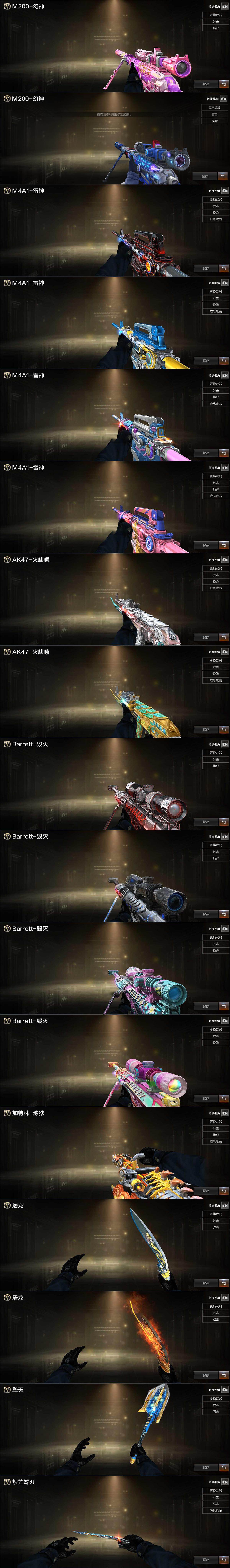 【热门武器】:传说灵眸,QBZ03-金色蔷薇,M14EBR-玄武,Scar Light-白虎,凤吟之魄,柯尔特-冠军之特,汤姆逊-烈龙*3,加特林-炼狱,COP 357-幻灵,沙鹰-修罗,炽芒蝶刃,炽芒蝶刃-冠军炽芒皮肤