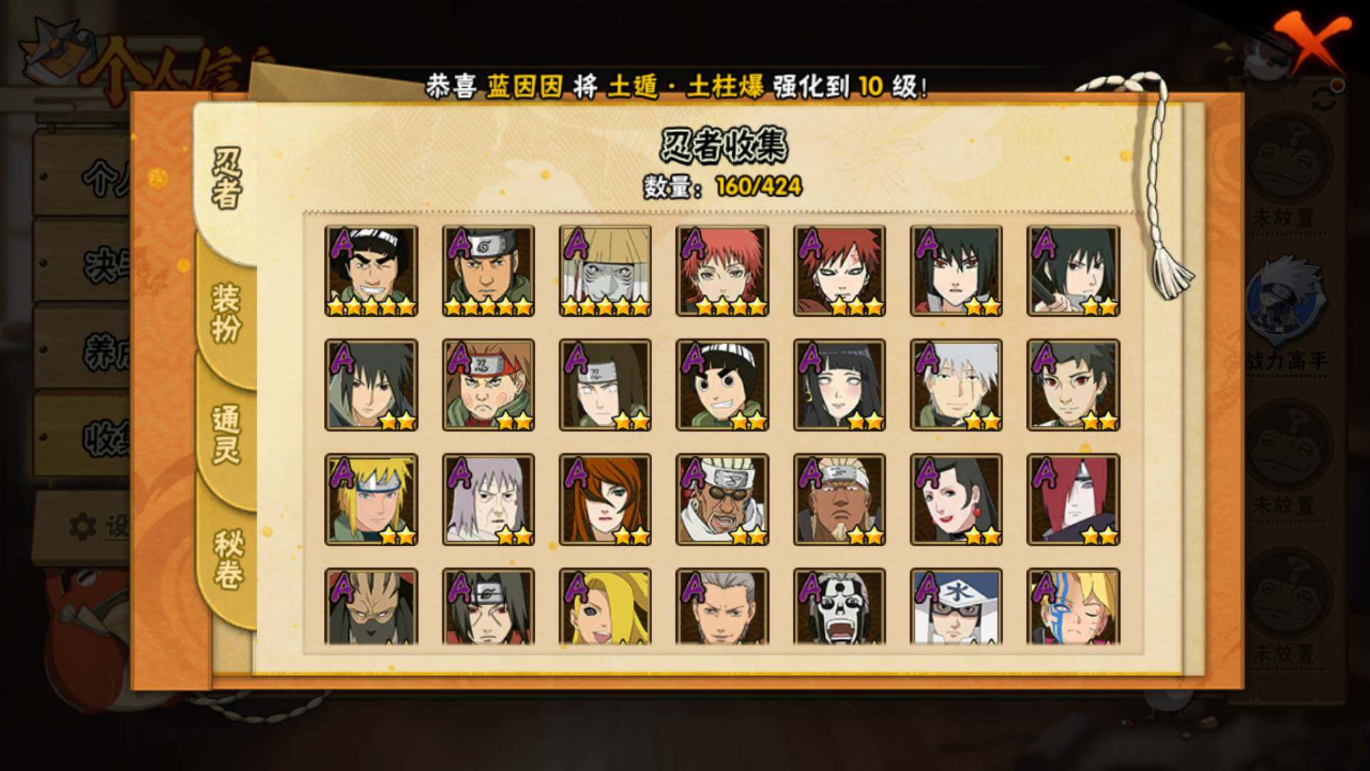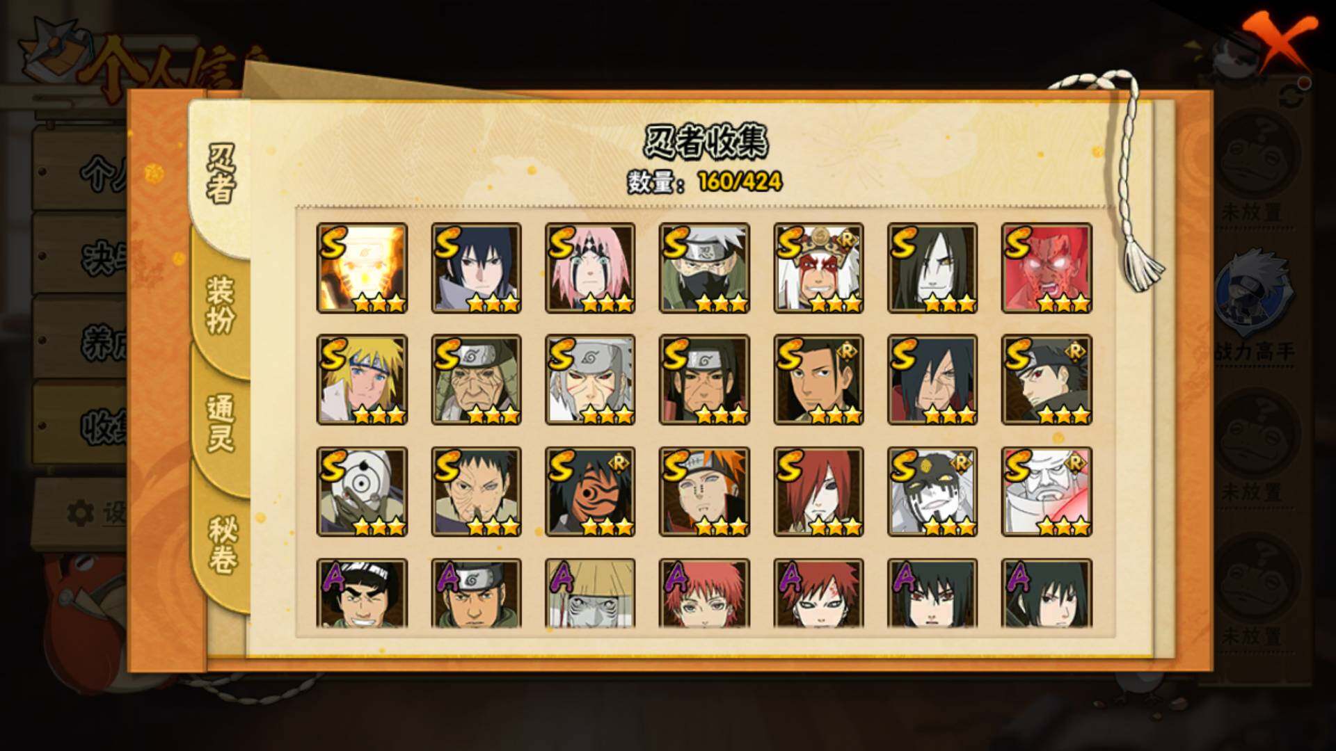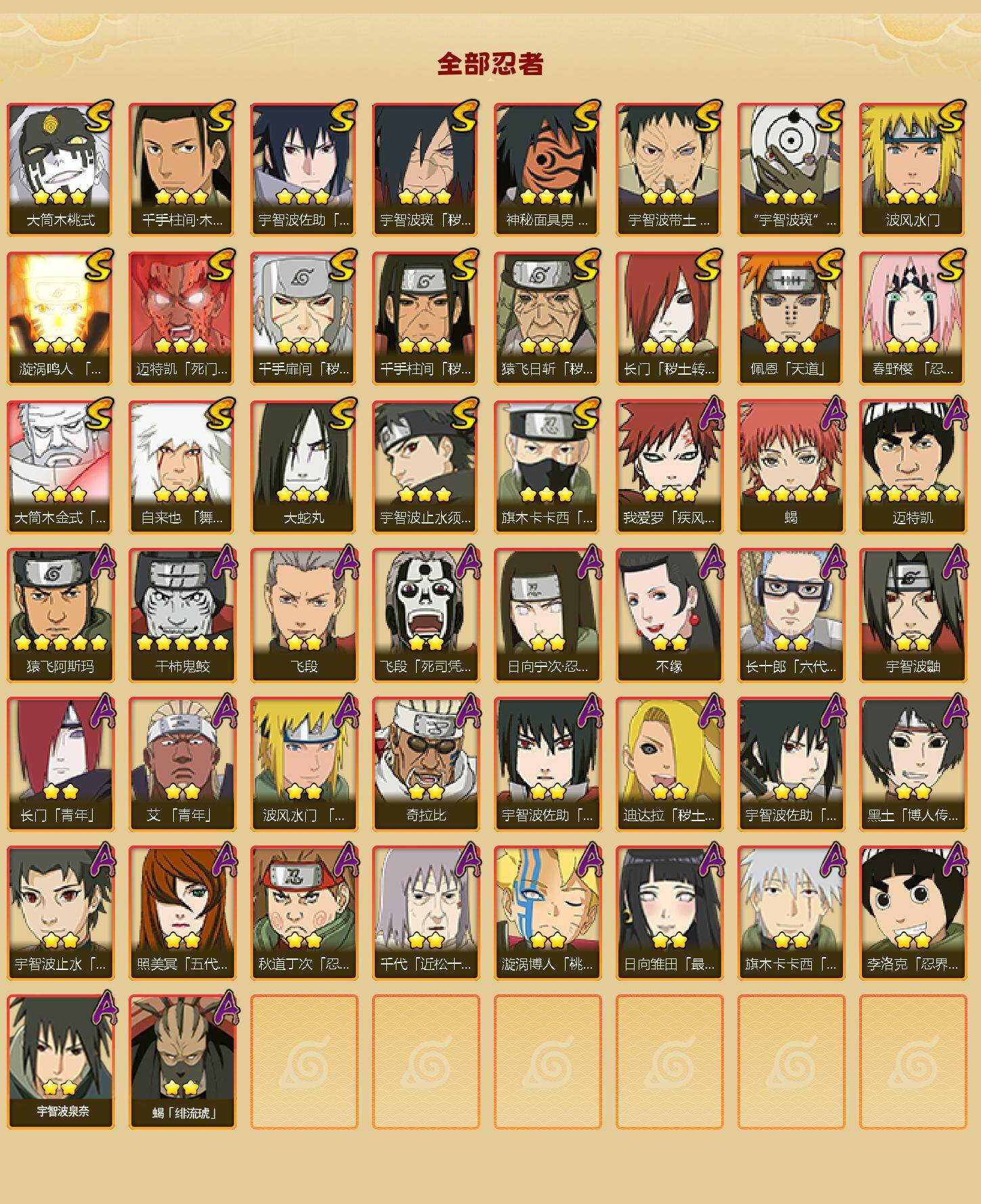 【S级忍者】:长门「秽土转生」(3星),猿飞日斩「秽土转生」(3星),千手扉间「秽土转生」(3星),千手柱间「秽土转生」(3星),宇智波斑「秽土转生·解」(3星),春野樱「忍界大战」(3星),宇智波带土「