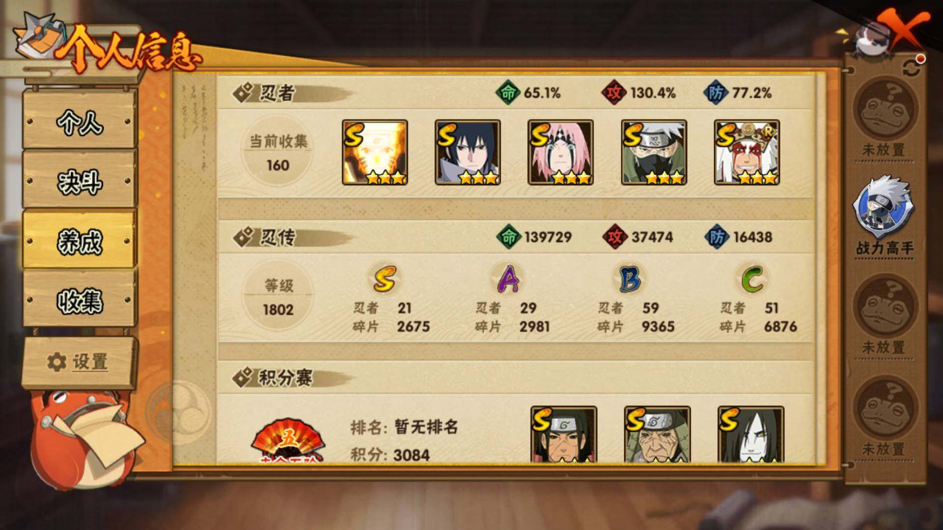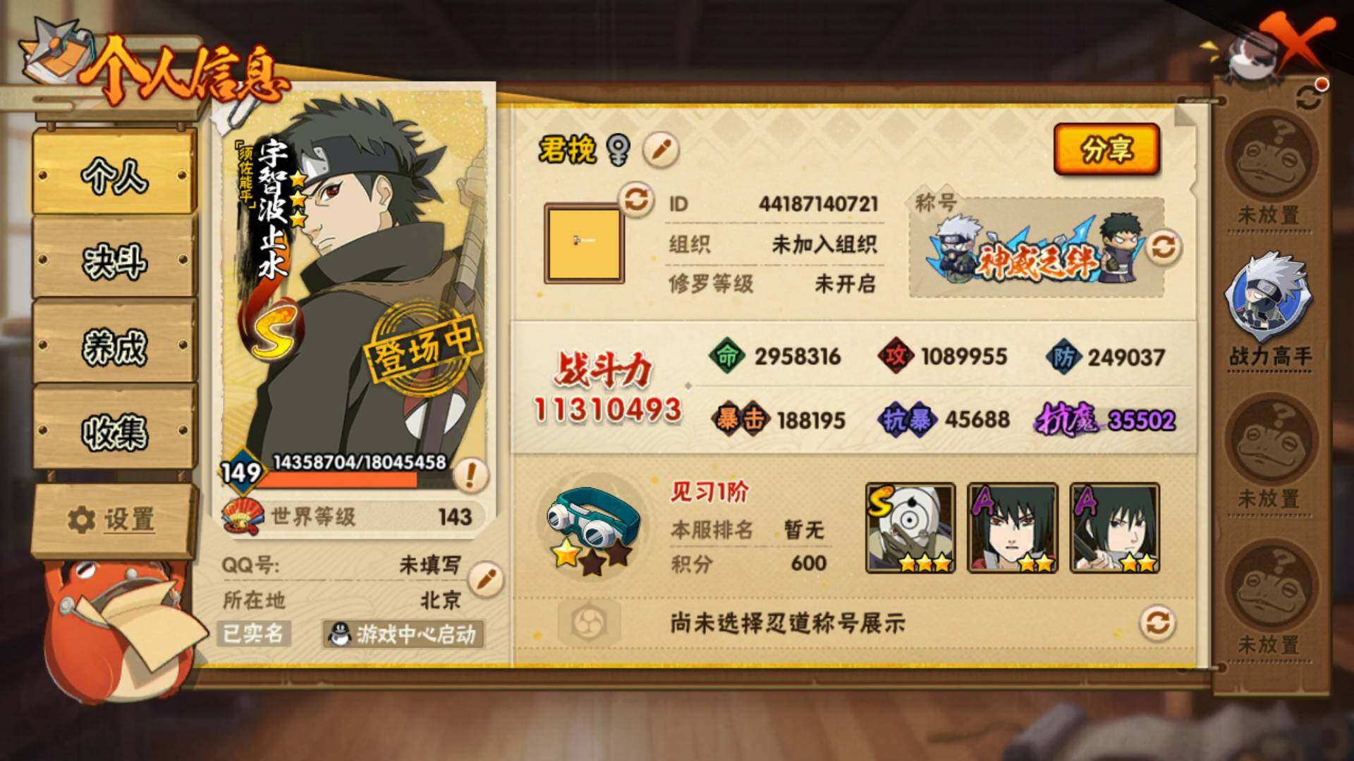 (可免费转苹果)V10 21S 29A 1130万战力 1.6万金币 热门A最终章雏田、新春止水。纲手77片 传说自来也58片 日斩45片 舍人45片 忍战艾81片 天道超90片 YY1877