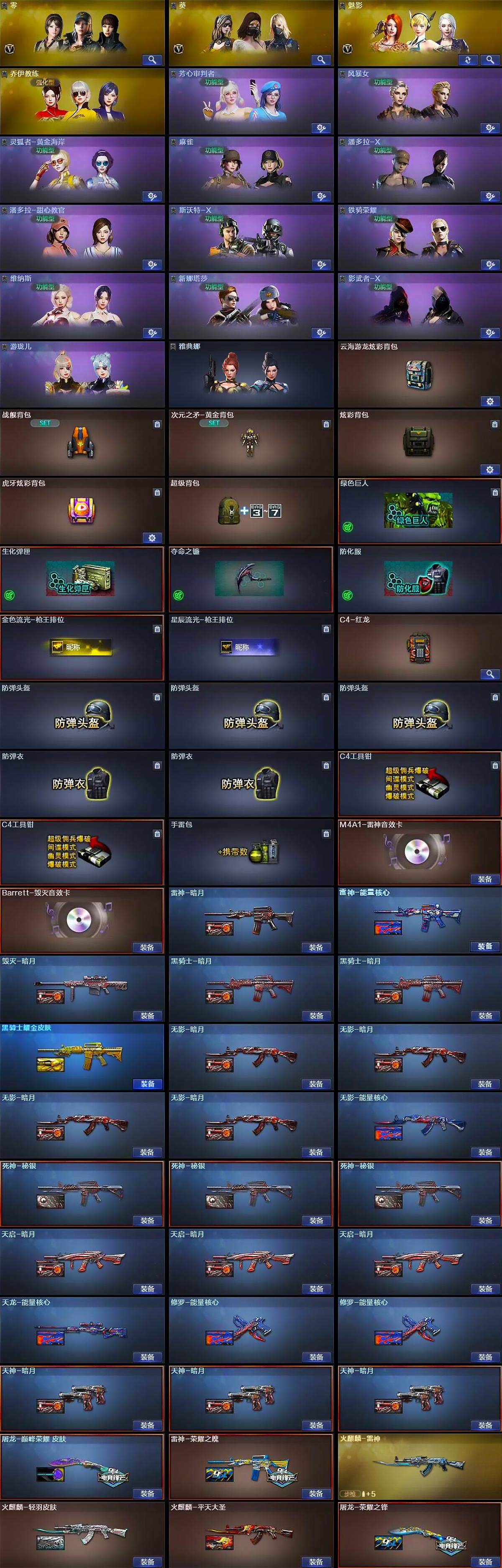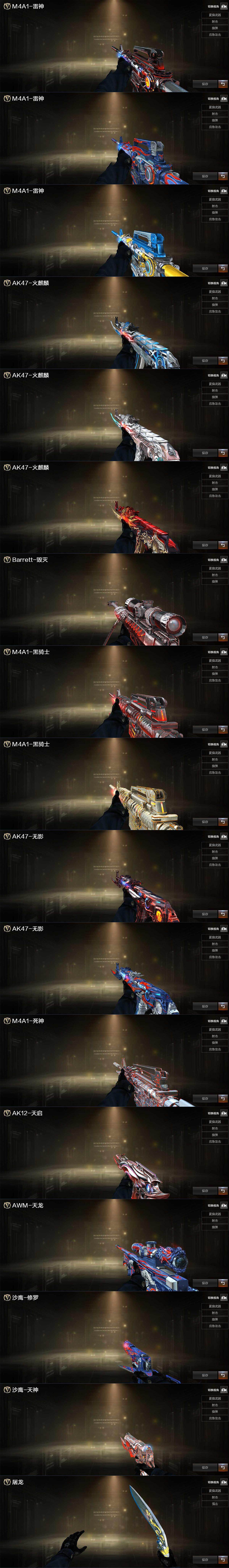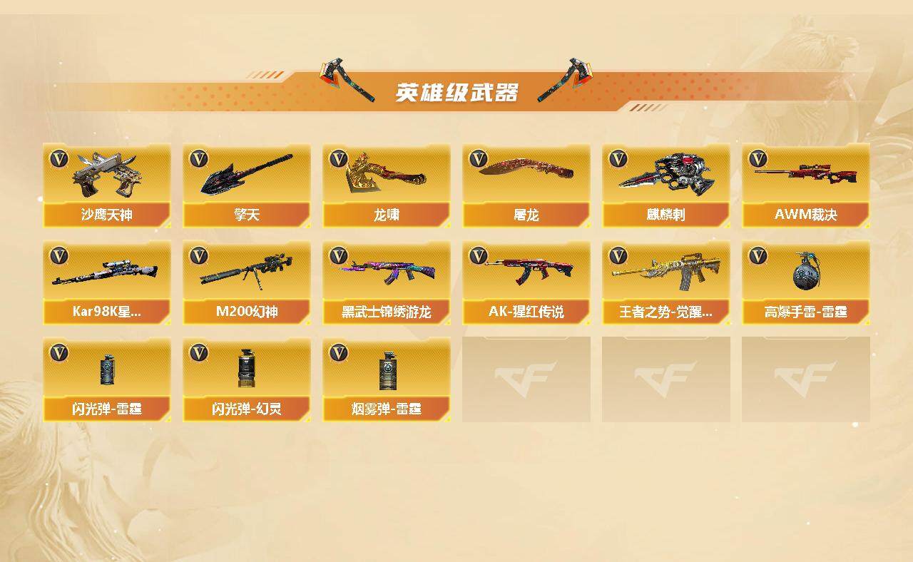 【热门武器】:QBZ03-金色蔷薇,HK417-朱雀,M200-幻神,死亡之眼,Kar98K-星神,M4A1-黑骑士*3,汤姆逊-烈龙*9,RPK-盘龙*4,加特林-炼狱*2,沙鹰-修罗*8
