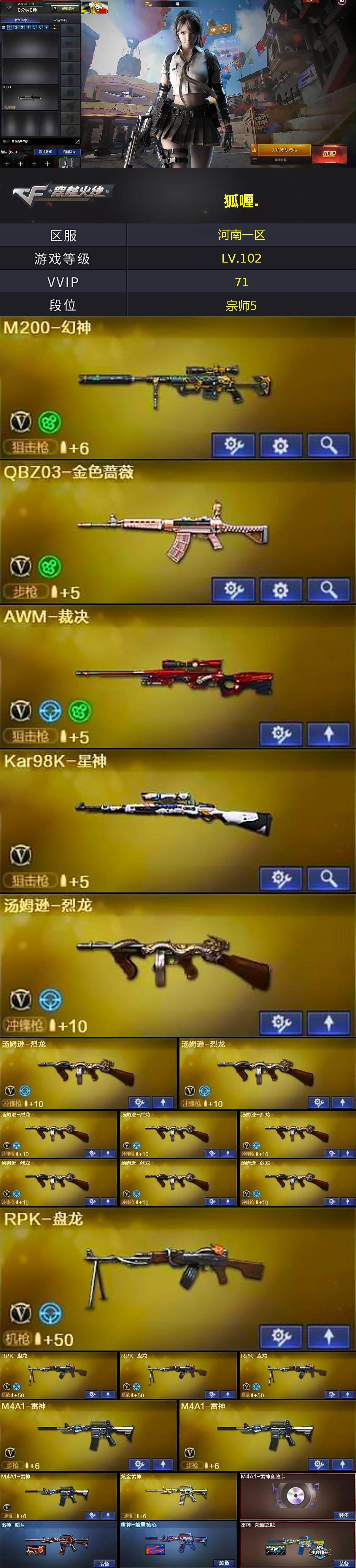 【CF2336】河南一区-71V-4王者-4炫金【双全号 QBZ03-金色蔷薇,HK417-朱雀,M200-幻神,死亡之眼,Kar98K-星神,M4A1-黑骑士*3,汤姆逊-烈龙*9,RPK-盘龙*4,加特林-炼狱*2,沙鹰-修罗*8】