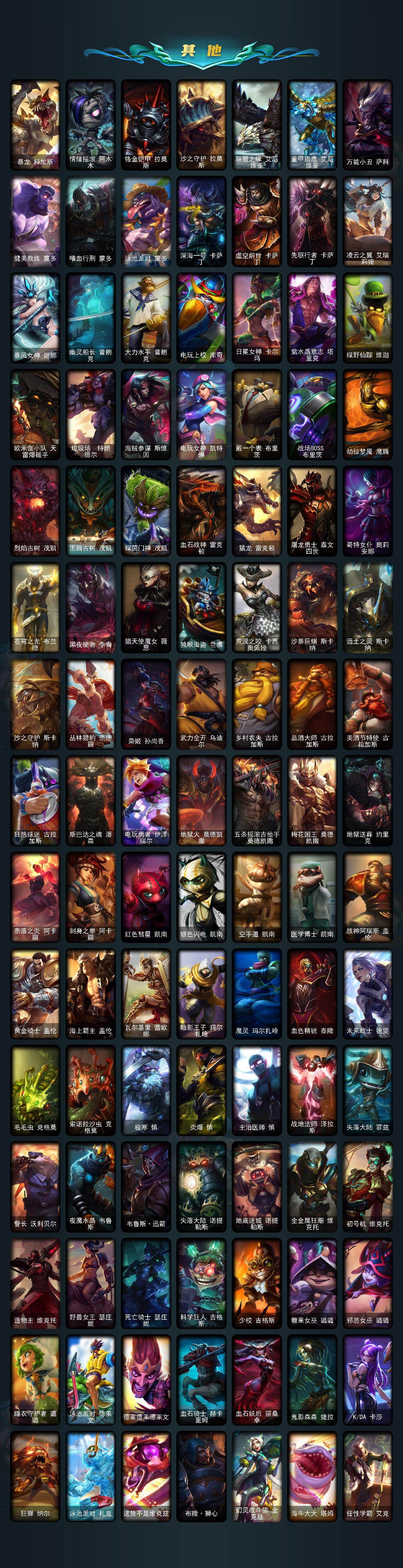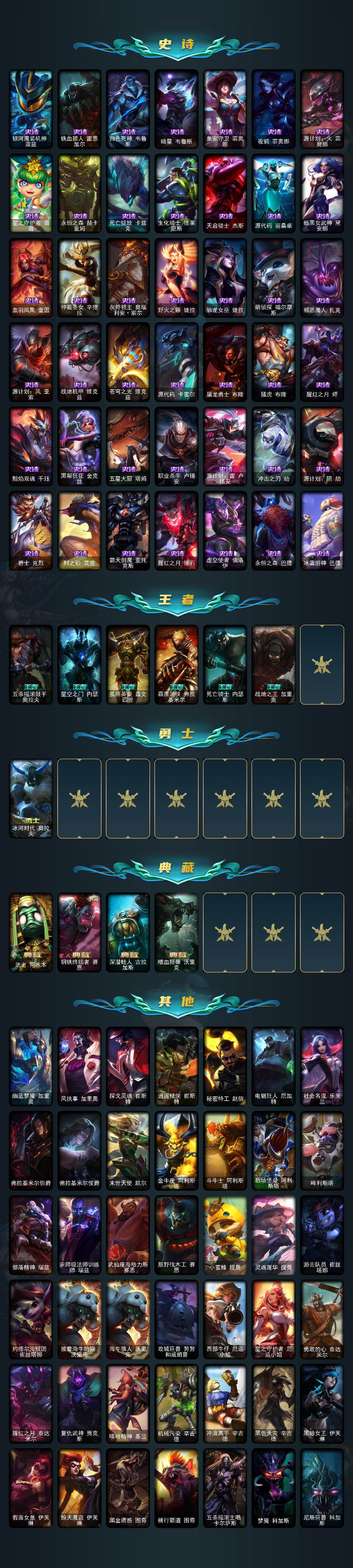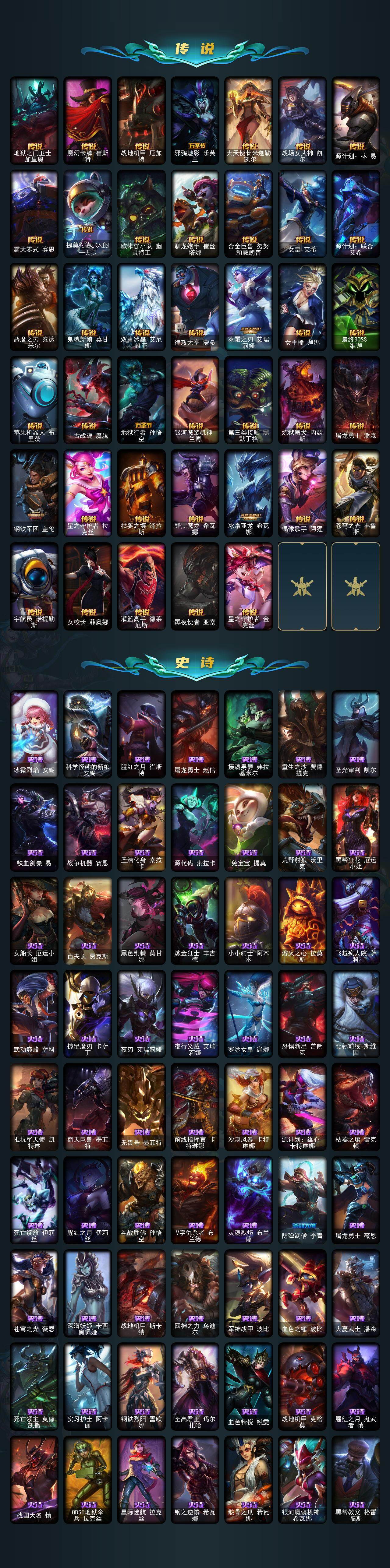 154英雄/376皮肤/2终极/4神话/61限定/2臻彩/14炫彩/40传说/105史诗/未定级/十周年纪念安妮/