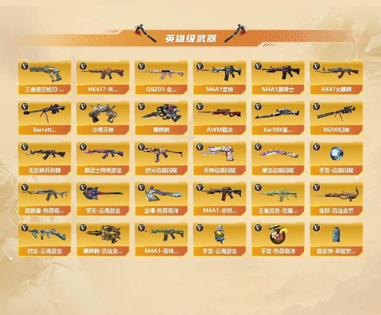 【热门武器】:传说辉光,传说灵眸,QBZ03-金色蔷薇,HK417-朱雀,M200-幻神,Kar98K-星神*2,毒蜂,M4A1-黑骑士