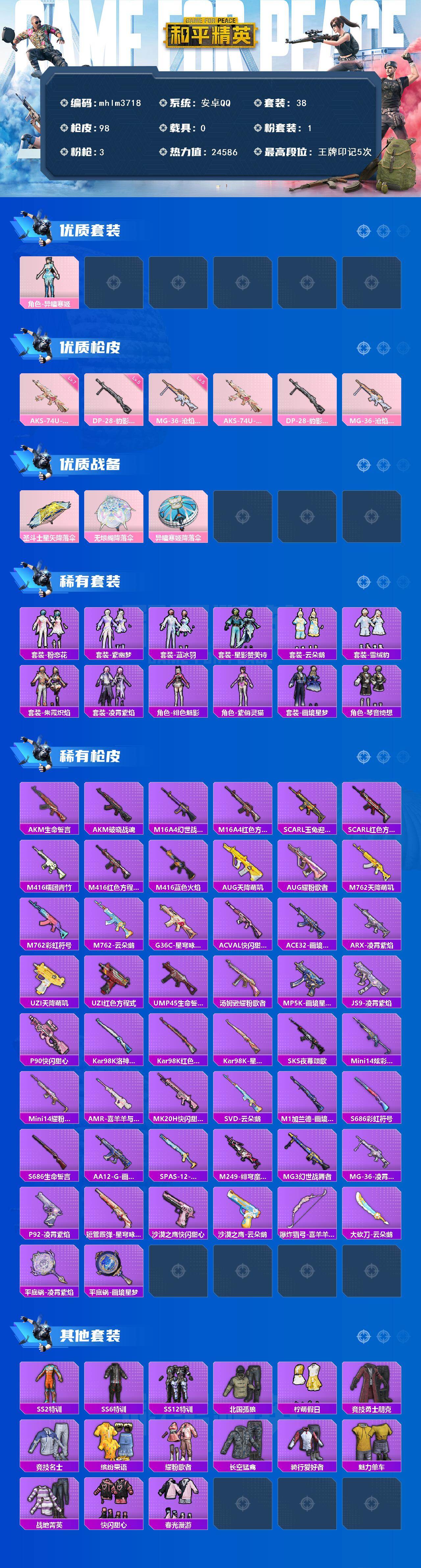 【mhlm3718】安卓 手Q-1粉装-3特效枪-0载具-1粉色飞行器-24586热力值-5王牌印记-38套装-98枪皮