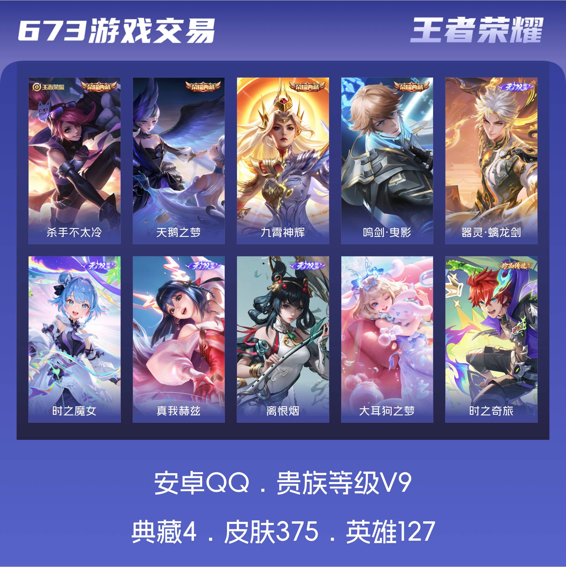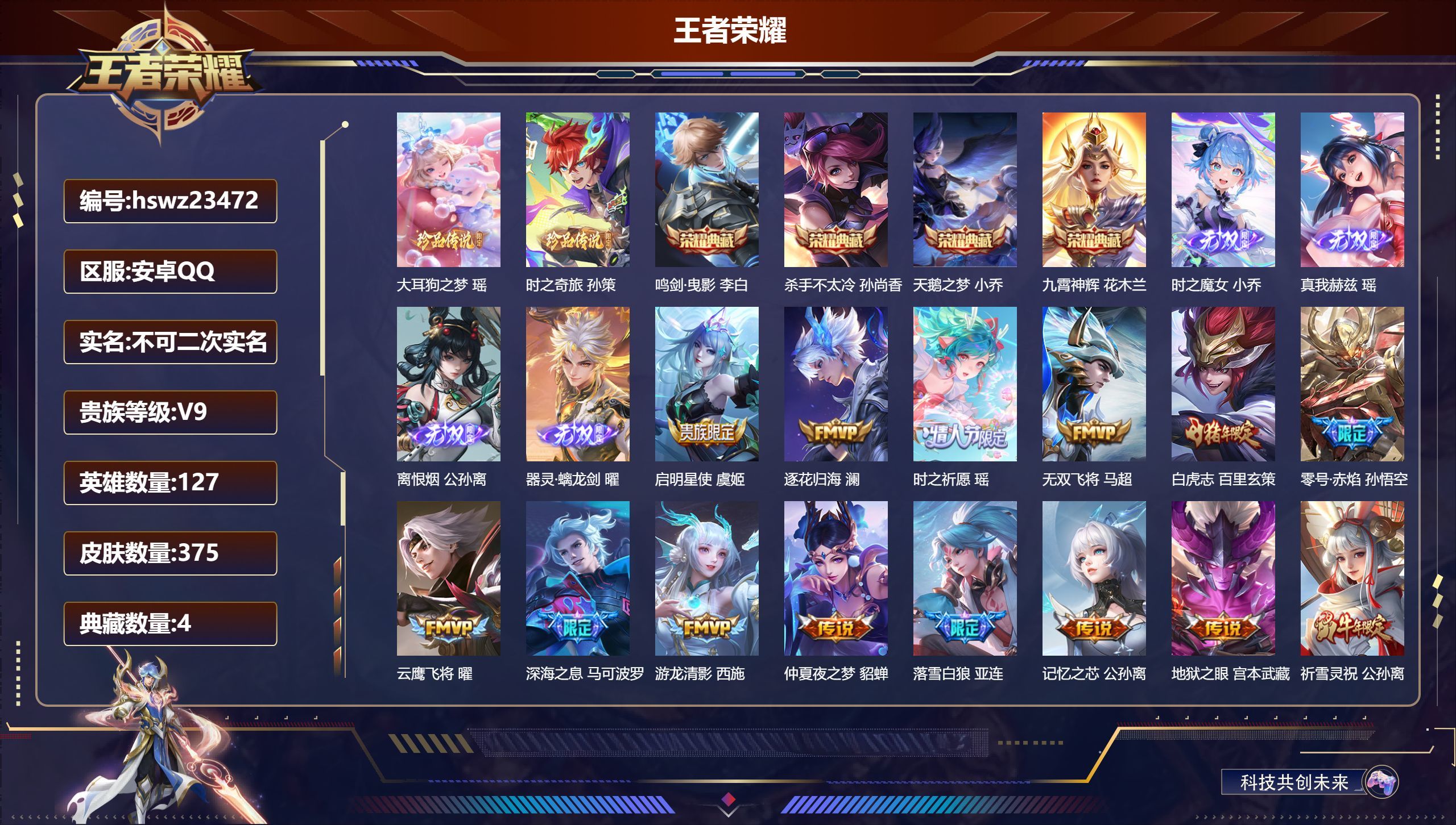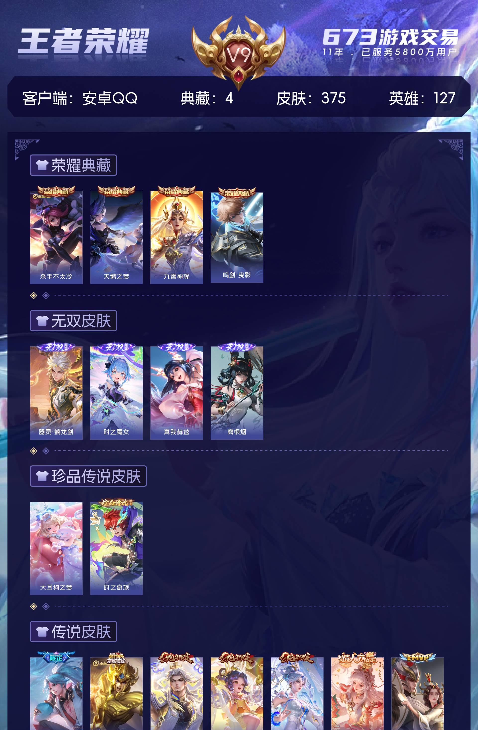 安卓QQ/至尊星耀/375皮肤/127英雄/4典藏/0珍品无双/4无双/2珍品传说/35传说/116