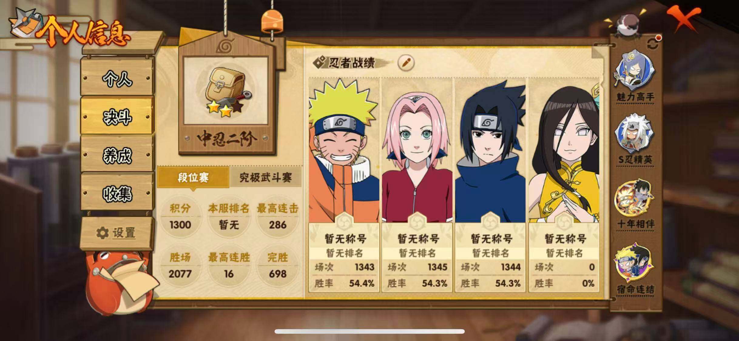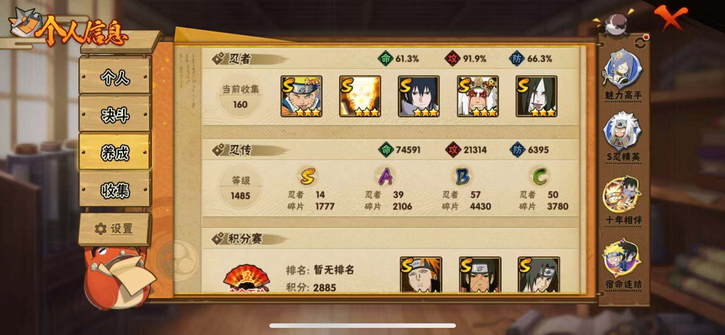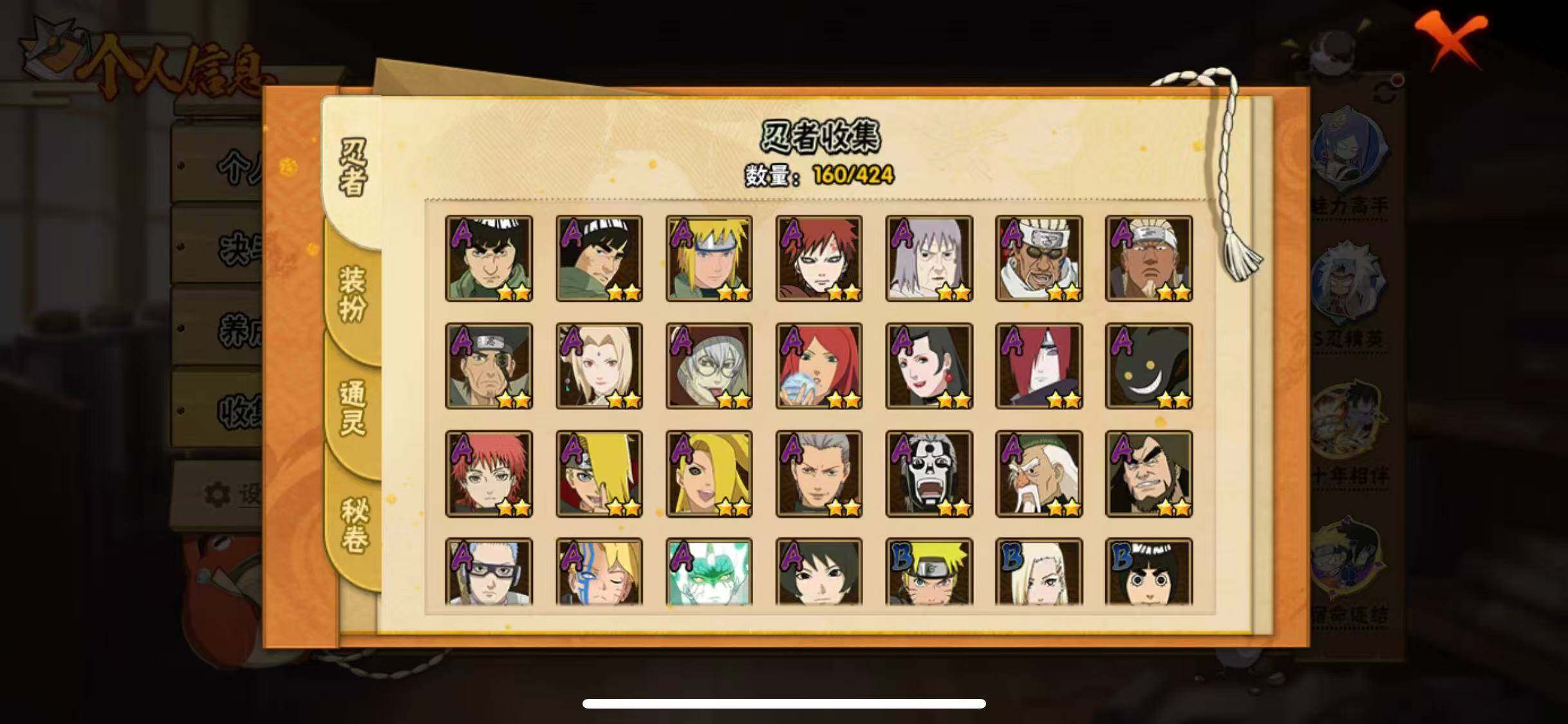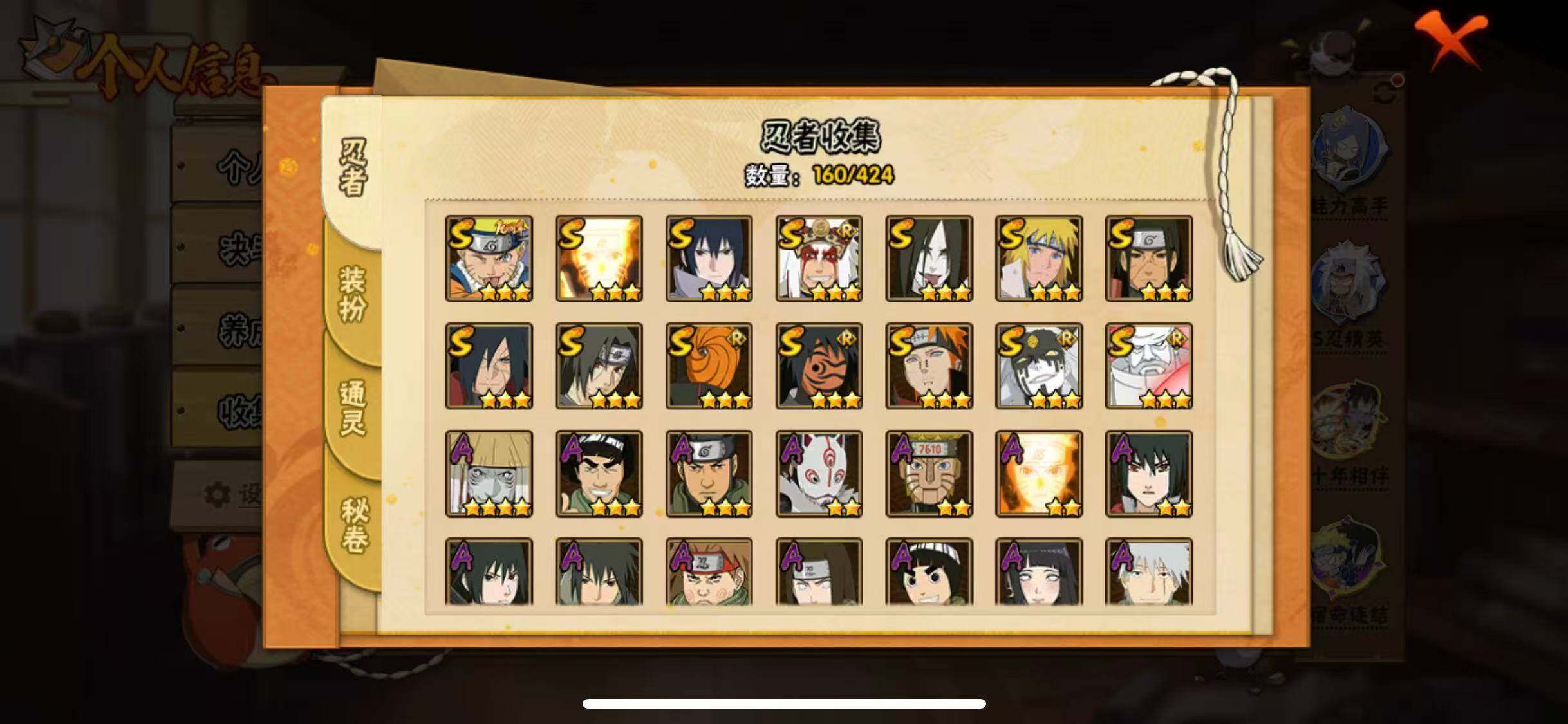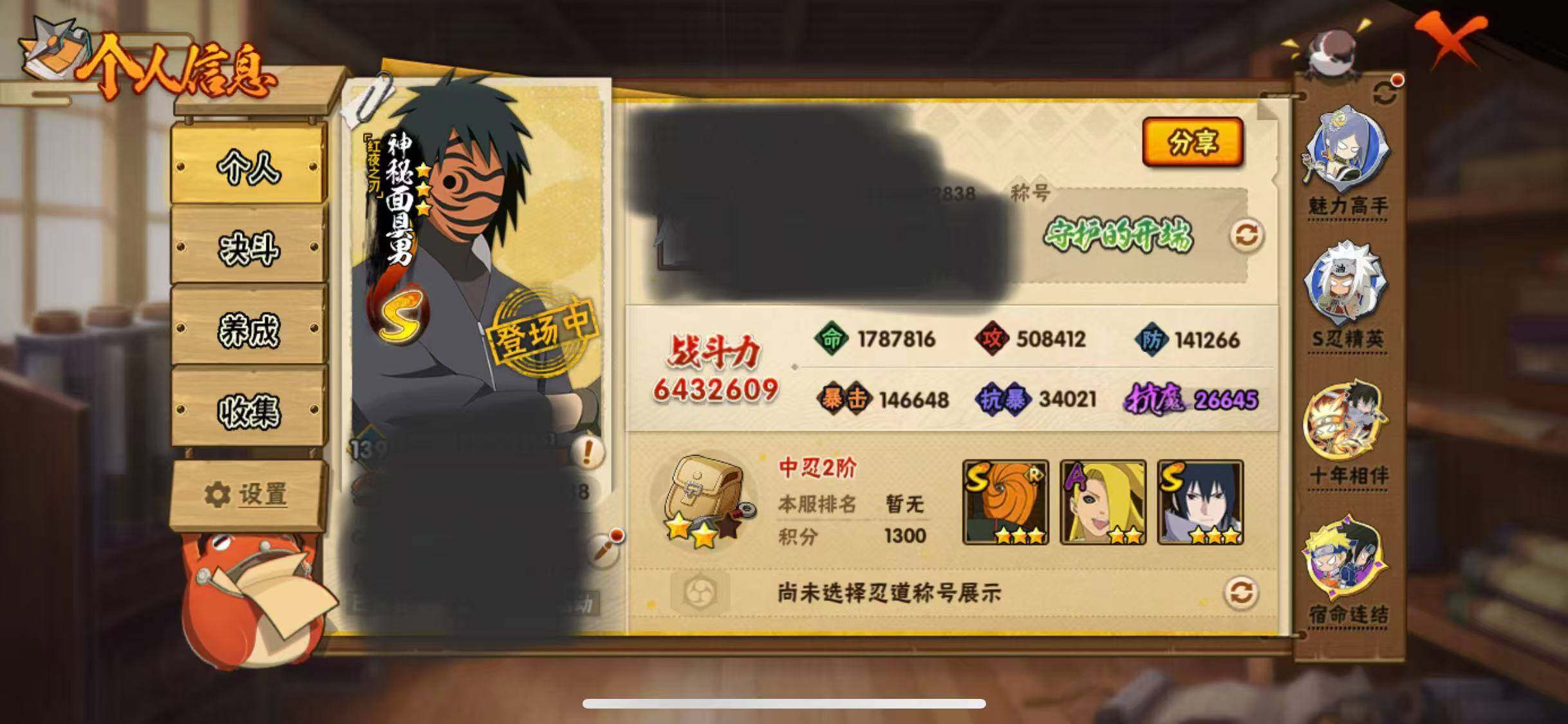 V11/战力643W/S忍14/A忍39/通灵兽17/4星干柿鬼鲛/2星大野木「侠隐江湖」/侠隐江湖-纲手/