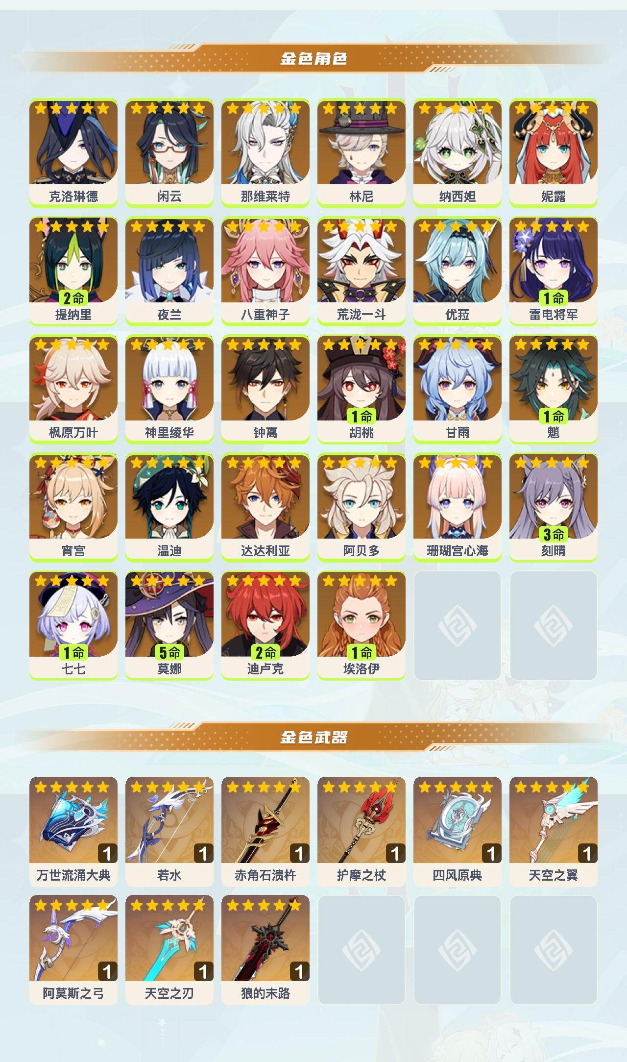 【YSN2305】60级/55黄/女主/28个五星角色/11个五星武器/荒泷一斗/钟离/阿贝多/枫原万叶/1命魈/甘雨/神里绫华/1命雷电将军/纳西妲/那维莱特/妮露/夜兰/达达利亚/1命胡桃/2命迪卢克/温迪/八重神子/2命提纳里/珊瑚宫心海/闲云/1命七七/5命莫娜/林尼/宵宫/优菈/3命刻晴/0命埃洛伊/克洛琳德/若水/阿莫斯之弓/万世流涌大典/护摩之杖/赤角石溃杵/天空之刃/四风原典/狼的末路/天空之翼
