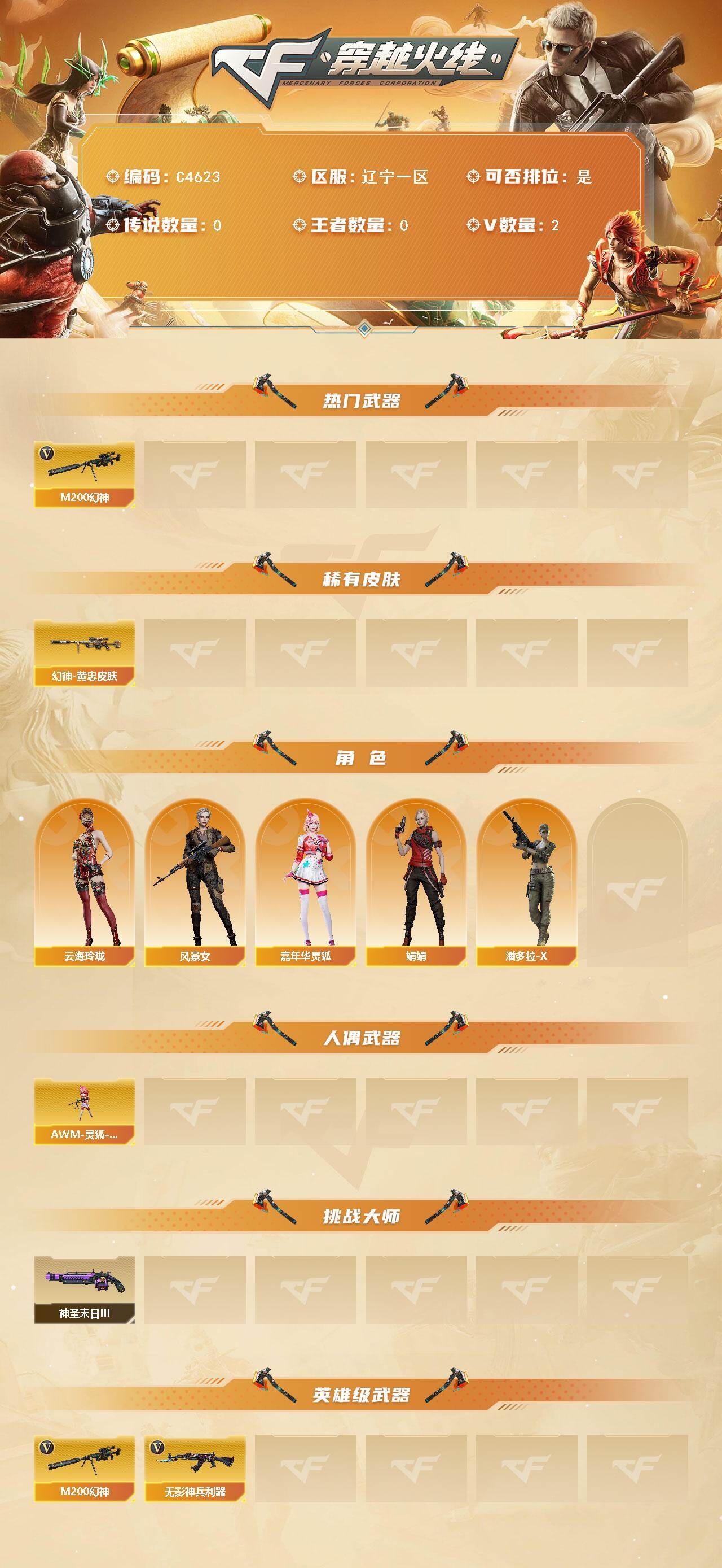 【C4623】辽宁一区-3V-0王者武器数-0炫金武器数