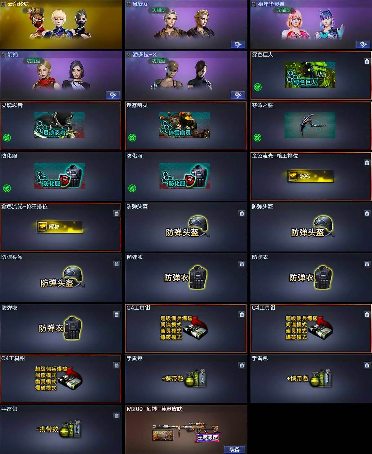 【道具】:绿色巨人,灵魂忍者,迷雾幽灵,夺命之镰,防化服*2,金色流光-枪王排位*2,防弹头盔*3,防弹衣*3,C4工具钳*3,手雷包*3