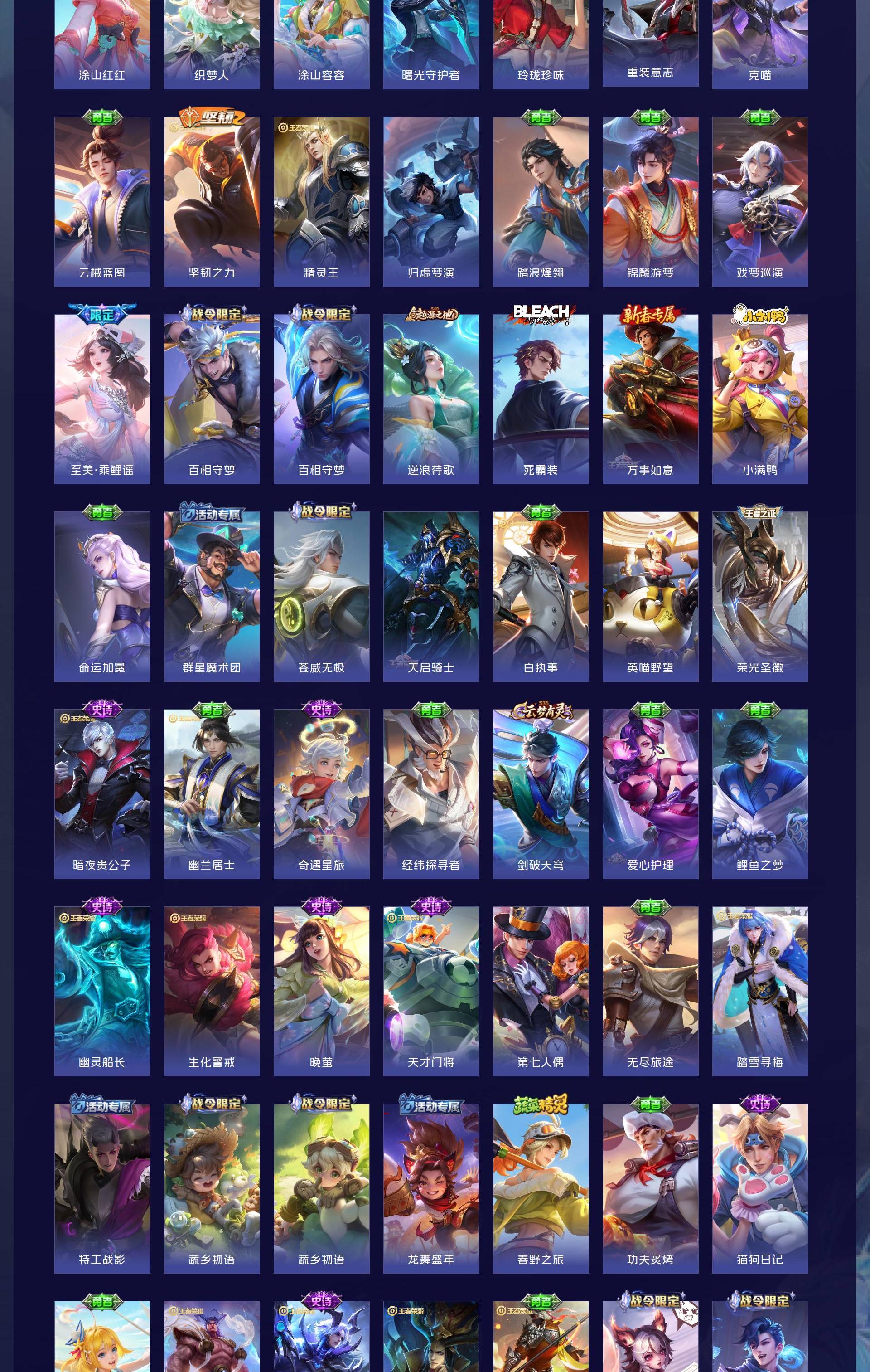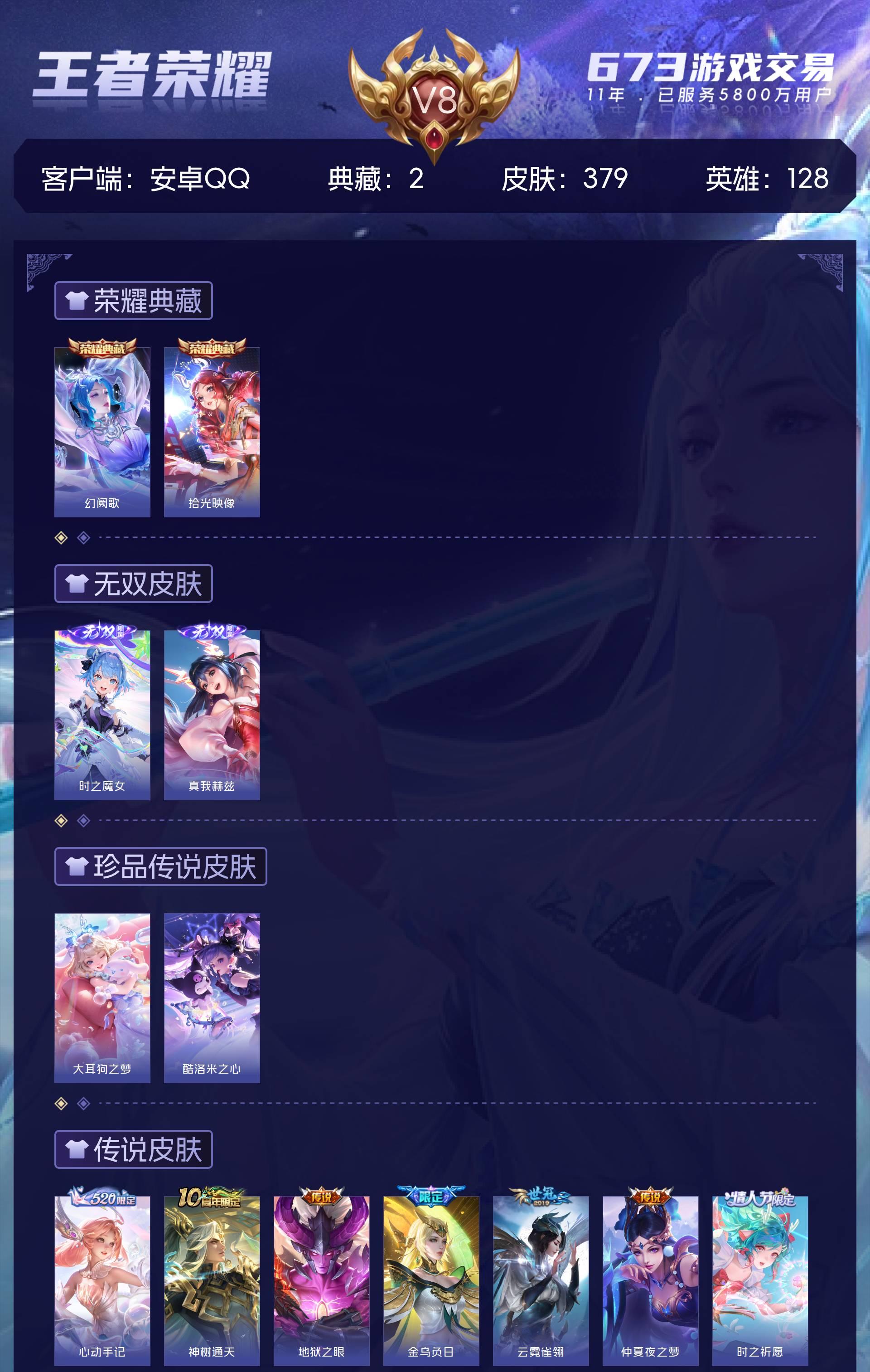 V8 皮肤379 英雄128 至尊星耀 荣耀典藏2 无双皮肤2 珍品传说2 传说15 其他皮肤361