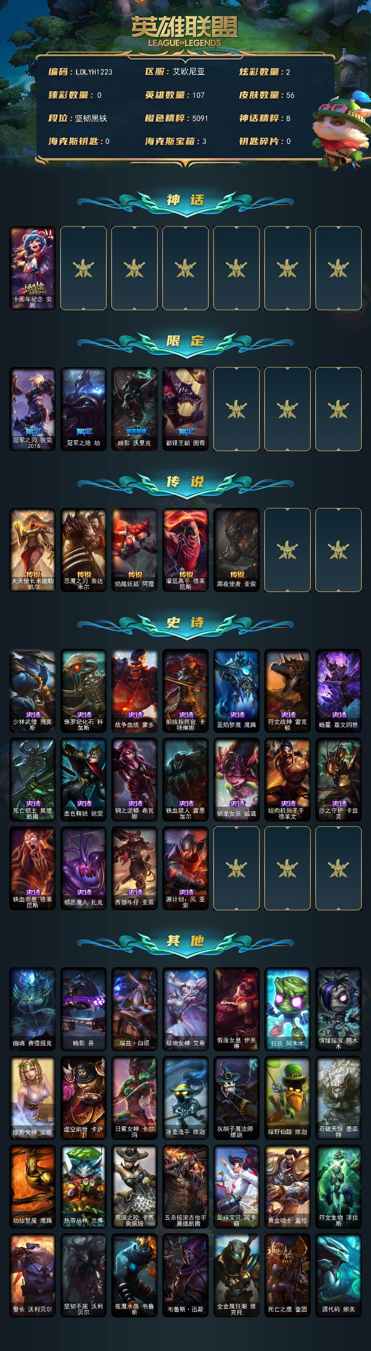 【LOLYH1223】107英雄/56皮肤/1神话/4限定/2炫彩/5传说/18史诗/未定级/十周年纪念安妮/冠军之刃锐雯2016/冠军之隐劫/暗影沃里克/都铎王朝图奇/大天使长米迦勒凯尔/恶魔之刃泰达米尔/焰尾妖狐阿狸/灌篮高手德莱厄斯/黑夜使者亚索/少林武僧贾克斯/侏罗纪化石科加斯/战争血统蒙多/前线指挥官卡特琳娜/蓝焰梦魔魔腾/符文战神雷克顿/暗星嘉文四世/死亡领主莫德凯撒/血色精锐锐雯/钢之逆鳞希瓦娜/铁血猎人雷恩加尔/驯龙女巫璐璐/绞肉机刽子手德莱文/沙之守护卡兹克/铁血帝皇德莱厄斯/