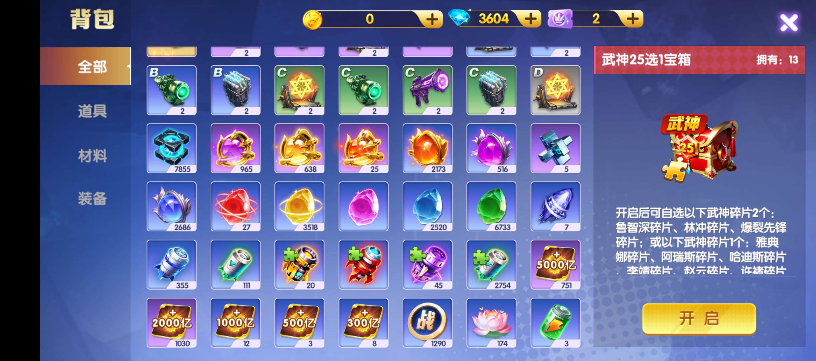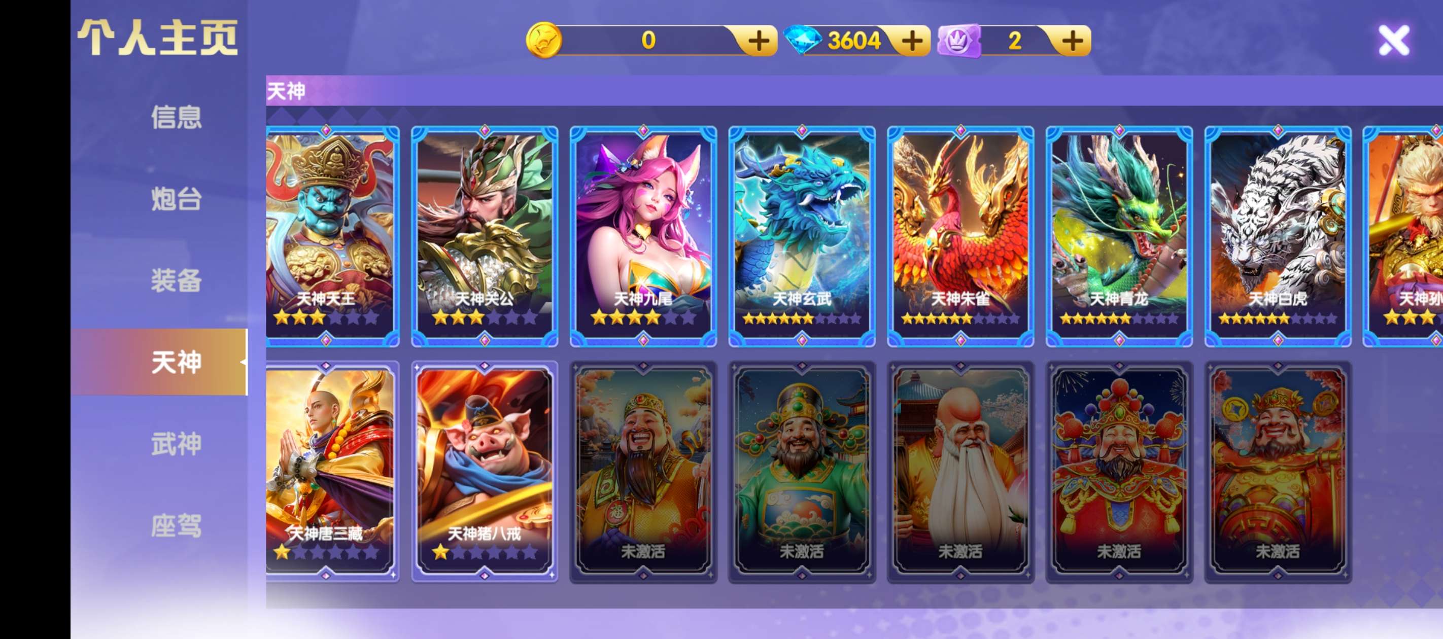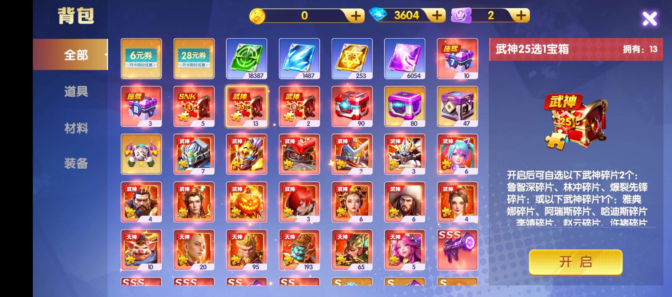 官Q破产号 背包有武神箱子心愿也马上可以换一个武神 三级洪荒天王差几个碎片四星有多余三个sss