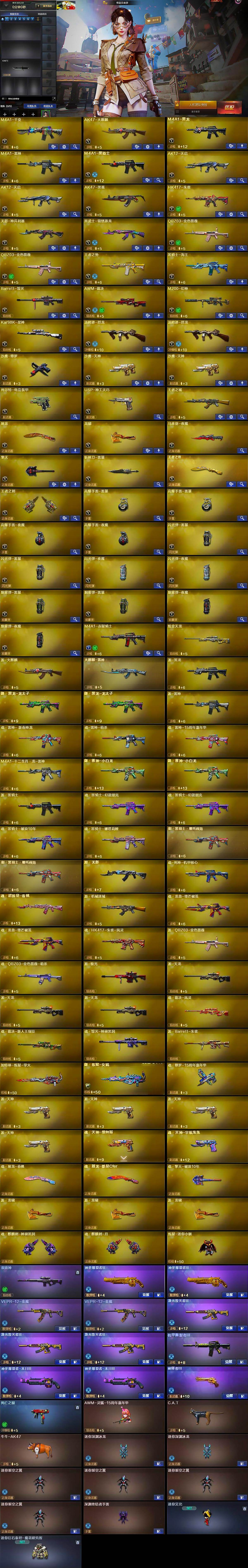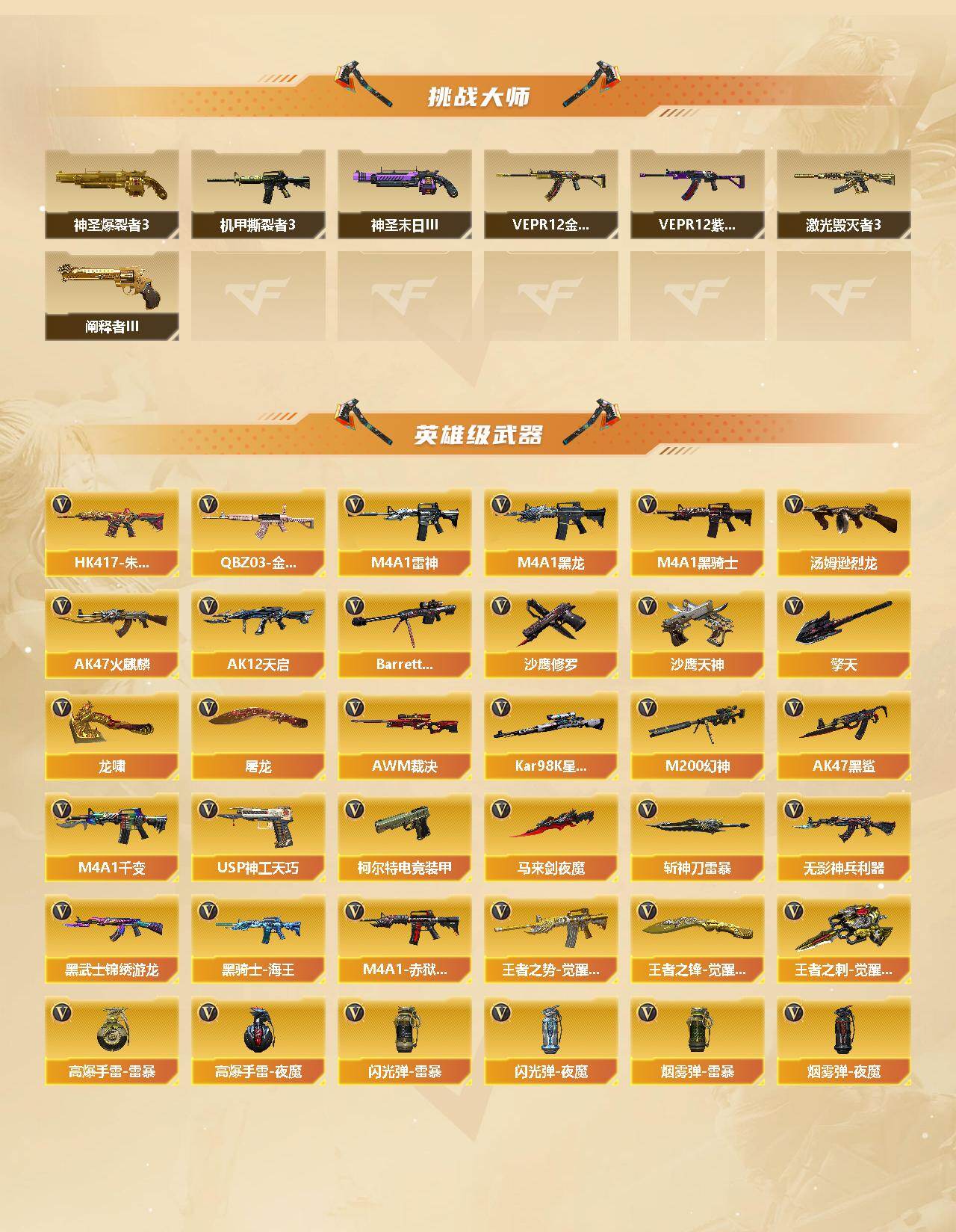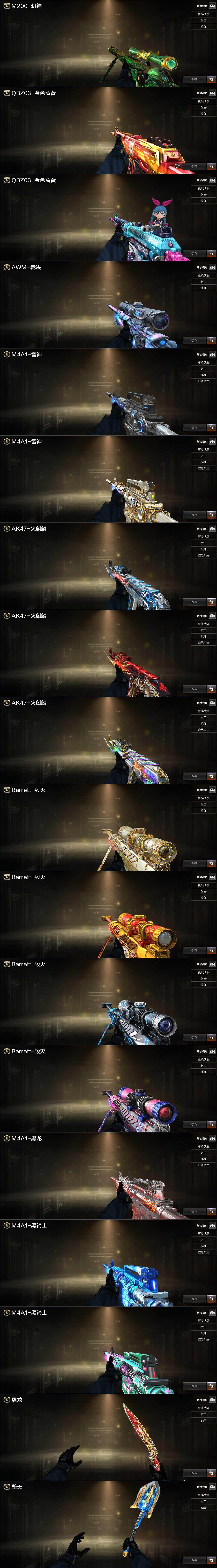 【热门武器】:QBZ03-金色蔷薇*2,HK417-朱雀,M200-幻神,死亡之眼,Kar98K-星神,C.A.T,炼狱-迷你小钢,牛牛-AK47,M4A1-黑骑士,汤姆逊-烈龙*2,沙鹰-修罗,金刚伞